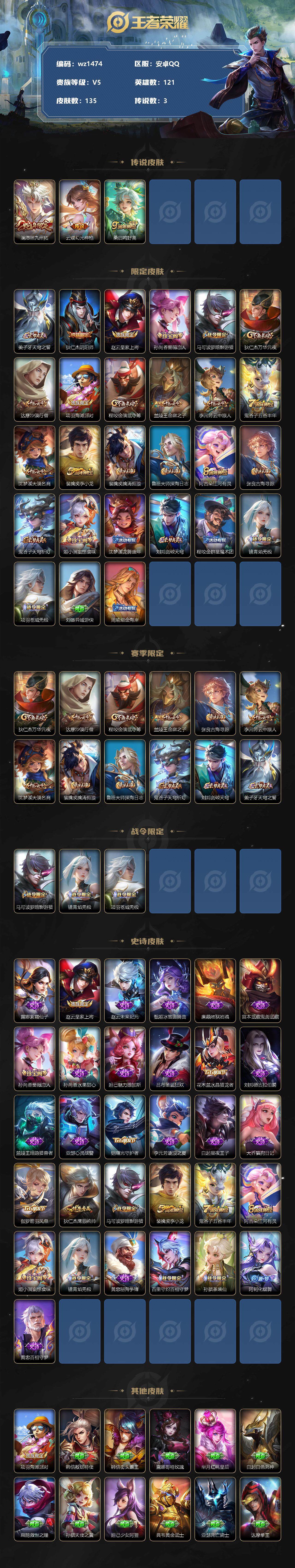 【游戏多多】【王者荣耀】【编号:3339463】【可二次实名】【wz1474】【商品标题】:安卓Q-V5-最强王者段位-121英雄-135皮肤-0典藏-0珍品无双-0无双-0珍品传说-3传说-31史诗 【传说皮肤】:澜愿照九州拓,云缨幻光神枪,桑启鸣野蒿 【限定皮肤】:姜子牙天穹之誓,狄仁杰阴阳师,赵云皇家上将,孙尚香蔷薇恋人,马可波罗暗影游猎,狄仁杰万华元夜,达摩沙漠行僧,项羽海滩派对,程咬金演武夺筹,兰陵王金庭之子,李元芳云中旅人,鬼谷子五谷丰年,沈梦溪大漠名商,裴擒虎李小龙,裴擒虎擒涛扼浪,鲁班大师探海日志,阿古朵江河有灵,张良古海寻踪,鬼谷子天穹祈灯,姬小满妄想食味,沈梦溪龙舞盛年,刘邦剑破天穹,程咬金群星魔术团,镜青焰无极,项羽苍威无极,刘备异域游侠,周瑜熔金海岸 【赛季限定】:狄仁杰万华元夜,达摩沙漠行僧,程咬金演武夺筹,兰陵王金庭之子,张良古海寻踪,李元芳云中旅人,沈梦溪大漠名商,裴擒虎擒涛扼浪,鲁班大师探海日志,鬼谷子天穹祈灯,刘邦剑破天穹,姜子牙天穹之誓 【战令限定】:马可波罗暗影游猎,镜青焰无极,项羽苍威无极 【史诗皮肤】:露娜紫霞仙子,赵云皇家上将,赵云未来纪元,甄姬冰雪圆舞曲,廉颇地狱岩魂,宫本武藏鬼剑武藏,孙尚香蔷薇恋人,孙尚香水果甜心,妲己魅力维加斯,吕布圣诞狂欢,花木兰水晶猎龙者,刘邦德古拉伯爵,兰陵王暗隐猎兽者,亚瑟心灵战警,铠曙光守护者,李元芳逐浪之夏,白起星夜王子,大乔猫狗日记,伽罗箭羽风息,狄仁杰鹰眼统帅,马可波罗暗影游猎,裴擒虎李小龙,鬼谷子五谷丰年,阿古朵江河有灵,姬小满妄想食味,镜青焰无极,黄忠怒海争锋,百里守约百相守梦,孙膑茶境仙,阿轲化蝶舞,黄忠百相守梦 【其他皮肤】:项羽海滩派对,韩信教廷特使,韩信街头霸王,露娜哥特玫瑰,芈月红桃皇后,白起白色死神,扁鹊救世之瞳,孙膑天使之翼,妲己少女阿狸,典韦黄金武士,亚瑟死亡骑士,达摩拳王,花木兰兔女郎,甄姬花好人间,后羿阿尔法小队,狄仁杰阴阳师,钟无艳海滩丽影,狂铁命运角斗场,老夫子功夫老勺,孙尚香沉稳之力,诸葛亮掌控之力,鬼谷子幻乐之宴,明世隐虹云星官,哪吒次元突破,狂铁特工战影,狄仁杰万华元夜,刘禅秘密基地,程咬金演武夺筹,鲁班大师乓乓大师,达摩沙漠行僧,程咬金无双福将,兰陵王金庭之子,沈梦溪大漠名商,李元芳云中旅人,刘备潮玩造梦师,猪八戒潮玩探月行,裴擒虎擒涛扼浪,太乙真人劲辣红锅,鲁班大师探海日志,张良古海寻踪,钟无艳聚星闪耀,后羿完美运算,鬼谷子天穹祈灯,亚瑟鸿运当头,沈梦溪龙舞盛年,钟无艳春野之旅,扁鹊无尽旅途,刘邦剑破天穹,盘古经纬探寻者,程咬金群星魔术团,项羽苍威无极,大司命暗都幽影,刘备异域游侠,貂蝉长夏之忆,姜子牙天穹之誓,周瑜熔金海岸,盘古敬我三分,东皇太一噬灭天穹,老夫子百相守梦,干将莫邪雾都夜雨,苍苍林狼骑,太乙真人谧流熔炉,典韦铁骨偃魂,马超访茗客,西施雪境奇遇,姜子牙星梦巡礼,少司缘灵卦秘语,明世隐景韶洛都,戈娅玫蓝誓约,刘备浪漫序章,钟馗虚灵犬护,苏烈春野闲踪,张良灵野札记,阿古朵布丁狗之约,莱西奥踏浪烽翎,鬼谷子克喵,鲁班七号福禄兄弟,高渐离金属狂潮,露娜绯红之刃,曹操超能战警,孙膑未来旅行,孙悟空西部大镖客,后羿精灵王,李白范海辛,刘邦圣殿之光,虞姬加勒比小姐,关羽天启骑士,夏侯惇战争骑士,马可波罗激情绿茵,铠龙域领主,百里守约绝影神枪,公孙离花间舞,元歌午夜歌剧院,孙策海之征途,司马懿魇语军师,李信灼热之刃,嫦娥露花倒影,猪八戒年年有余,曜归虚梦演,澜孤猎,金蝉前尘 【内测皮肤】:孙尚香蔷薇恋人,狂铁特工战影 【营地ID】:1735705773