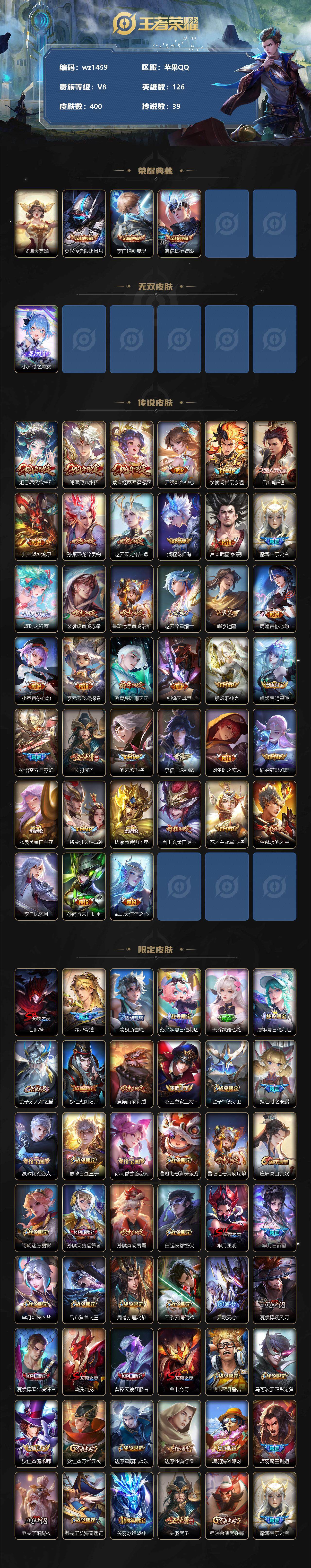【游戏多多】【王者荣耀】【编号:3339467】【可二次实名】【wz1459】【商品标题】:苹果Q-V8-最强王者段位-126英雄-400皮肤-3典藏-0珍品无双-1无双-0珍品传说-39传说-120史诗 【荣耀典藏】:武则天英雄,夏侯惇无限飓风号,李白鸣剑曳影,韩信弑枪猎影 【无双皮肤】:小乔时之魔女 【传说皮肤】:妲己愿照众生和,澜愿照九州拓,蔡文姬愿照福禄聚,云缨幻光神枪,裴擒虎祥瑞亨通,吕布曦玄引,典韦战鼓燎原,孙策乘龙淬吴钩,赵云乘龙铭钟鼎,澜逐花归海,宫本武藏惊梅引,露娜启示之音,瑶时之祈愿,裴擒虎寅虎赤拳,鲁班七号寅虎瑞焰,赵云淬星耀世,曜李逍遥 ,周瑜音你心动,小乔音你心动,李元芳飞鸢探春,诸葛亮时雨天司,铠绛天战甲,镜炽阳神光,虞姬启明星使,孙悟空零号赤焰,关羽武圣,曜云鹰飞将,李信一念神魔,刘备时之恋人,貂蝉猫影幻舞,张良黄金白羊座,干将莫邪久胜战神,达摩黄金狮子座,百里玄策白虎志,花木兰冠军飞将,杨戬永曜之星,李白凤求凰,孙尚香末日机甲,武则天海洋之心 【限定皮肤】:白起狰,暃埋骨钱,蒙犽顽岩魄,蔡文姬夏日便利店,大乔绒语心约,虞姬夏日便利店,姜子牙天穹之誓,狄仁杰阴阳师,廉颇寅虎御盾,赵云皇家上将,墨子神迹守卫,妲己时之彼端,嬴政优雅恋人,嬴政白昼王子,孙尚香蔷薇恋人,鲁班七号狮舞东方,鲁班七号寅虎瑞焰,庄周高山流水,阿轲迷踪丽影,孙膑天狼运算者,孙膑寅虎展翼,白起夜都怪侠,芈月重明,芈月白晶晶,芈月幻夜卜梦,吕布猎兽之王,周瑜赤莲之焰,元歌云间偶戏,元歌无心,夏侯惇朔风刀,夏侯惇匿光决锋者,曹操烛龙,曹操天狼征服者,典韦穷奇,典韦蓝屏警告,马可波罗暗影游猎,狄仁杰魔术师,狄仁杰万华元夜,达摩星际陆战队,达摩沙漠行僧,项羽海滩派对,项羽霸王别姬,老夫子醍醐杖,老夫子航海奇遇记,关羽冰锋战神,关羽武圣,程咬金演武夺筹,露娜启示之音,刘邦夺宝奇兵,韩信逐梦之影,韩信飞衡,韩信傲雪梅枪,兰陵王驯魔猎人,兰陵王金庭之子,花木兰青春决赛季,花木兰默契交锋,亚瑟潮玩骑士王,孙悟空至尊宝,孙悟空大圣娶亲,孙悟空零号赤焰,孙悟空孙行者,牛魔御旌,后羿圣弓游侠,李元芳银河之约,李元芳云中旅人,虞姬启明星使,钟馗神迹守卫,钟馗驱傩正仪,杨玉环遇见飞天,杨玉环寅虎心曲,杨戬永曜之星,女娲朔望之晖,干将莫邪真爱魔法,雅典娜单词大作战,雅典娜黎明之约,蔡文姬奇迹圣诞,蔡文姬繁星吟游,太乙真人饕餮,鬼谷子原初探秘者,鬼谷子五谷丰年,诸葛亮时雨天司,黄忠火炮绅士,铠青龙志,苏烈千军破阵,百里玄策白虎志,百里玄策原初追逐者,百里守约朱雀志,弈星混沌棋,梦奇顽趣,公孙离玉兔公主,沈梦溪星空之诺,沈梦溪大漠名商,明世隐疑决卦,明世隐吟游魔法,裴擒虎李小龙,裴擒虎寅虎赤拳,裴擒虎擒涛扼浪,狂铁御狮,米莱狄御霄,米莱狄胡桃异想国,瑶时之祈愿,云中君纤云弄巧,伽罗天狼溯光者,盾山御銮,猪八戒西部大镖客,猪八戒猪悟能,上官婉儿梁祝,上官婉儿天狼绘梦者,嫦娥拒霜思,曜李逍遥 ,蒙犽狂想玩偶喵,鲁班大师探海日志,镜匿光追影者,桑启海盐诗旅,张良古海寻踪,高渐离燃音魔法,妲己灵卜魔法,鬼谷子天穹祈灯,姬小满妄想食味,小乔时之魔女,孙策乘龙淬吴钩,赵云乘龙铭钟鼎,吕布曦玄引,沈梦溪龙舞盛年,鲁班七号蔬乡物语,李元芳蔬乡物语,刘邦剑破天穹,周瑜熔金海岸 【年限皮肤】:百里玄策白虎志,百里守约朱雀志,铠青龙志,裴擒虎寅虎赤拳,孙膑寅虎展翼,鲁班七号寅虎瑞焰,杨玉环寅虎心曲,廉颇寅虎御盾,李白凤求凰,杨戬永曜之星,诸葛亮时雨天司,韩信飞衡,马超神威,关羽武圣,孙策乘龙淬吴钩,赵云乘龙铭钟鼎 【赛季限定】:白起狰,芈月重明,夏侯惇朔风刀,曹操烛龙,典韦穷奇,狄仁杰万华元夜,达摩沙漠行僧,老夫子醍醐杖,程咬金演武夺筹,兰陵王金庭之子,张良古海寻踪,牛魔御旌,李元芳云中旅人,钟馗驱傩正仪,雅典娜黎明之约,太乙真人饕餮,鬼谷子原初探秘者,苏烈千军破阵,百里玄策原初追逐者,弈星混沌棋,梦奇顽趣,沈梦溪大漠名商,明世隐疑决卦,裴擒虎擒涛扼浪,狂铁御狮,米莱狄御霄,盾山御銮,鲁班大师探海日志,桑启海盐诗旅,鬼谷子天穹祈灯,刘邦剑破天穹,姜子牙天穹之誓 【战令限定】:墨子神迹守卫,蔡文姬夏日便利店,虞姬夏日便利店,嬴政白昼王子,鲁班七号狮舞东方,阿轲迷踪丽影,白起夜都怪侠,芈月幻夜卜梦,吕布猎兽之王,周瑜赤莲之焰,元歌云间偶戏,典韦蓝屏警告,马可波罗暗影游猎,达摩星际陆战队,老夫子航海奇遇记,刘邦夺宝奇兵,兰陵王驯魔猎人,亚瑟潮玩骑士王,后羿圣弓游侠,李元芳银河之约,钟馗神迹守卫,女娲朔望之晖,干将莫邪真爱魔法,雅典娜单词大作战,黄忠火炮绅士,沈梦溪星空之诺,明世隐吟游魔法,米莱狄胡桃异想国,猪八戒西部大镖客,蒙犽狂想玩偶喵,高渐离燃音魔法,妲己灵卜魔法,鲁班七号蔬乡物语,李元芳蔬乡物语 【史诗皮肤】:鲁班七号电玩小子,项羽苍穹之光
