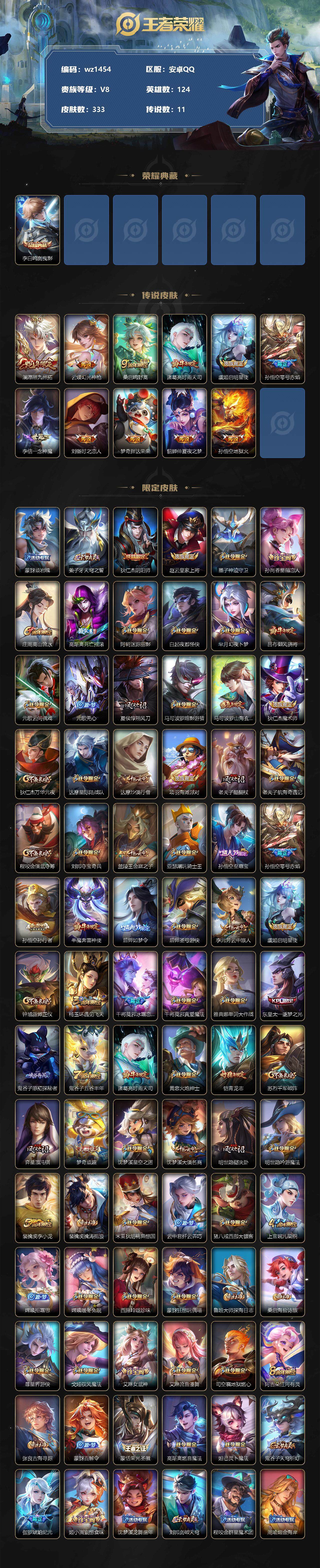 【游戏多多】【王者荣耀】【编号:3339490】【可二次实名】【wz1454】【商品标题】:安卓Q-V8-永恒钻石IV段位-124英雄-333皮肤-1典藏-0珍品无双-0无双-0珍品传说-11传说-88史诗 【荣耀典藏】:李白鸣剑曳影 【传说皮肤】:澜愿照九州拓,云缨幻光神枪,桑启鸣野蒿,诸葛亮时雨天司,虞姬启明星使,孙悟空零号赤焰,李信一念神魔,刘备时之恋人,梦奇胖达荣荣,貂蝉仲夏夜之梦,孙悟空地狱火 【限定皮肤】:蒙犽顽岩魄,姜子牙天穹之誓,狄仁杰阴阳师,赵云皇家上将,墨子神迹守卫,孙尚香蔷薇恋人,庄周高山流水,高渐离死亡摇滚,阿轲迷踪丽影,白起夜都怪侠,芈月幻夜卜梦,吕布御风骁将,元歌云间偶戏,元歌无心,夏侯惇朔风刀,马可波罗暗影游猎,马可波罗山海玄木吟,狄仁杰魔术师,狄仁杰万华元夜,达摩星际陆战队,达摩沙漠行僧,项羽海滩派对,老夫子醍醐杖,老夫子航海奇遇记,程咬金演武夺筹,刘邦夺宝奇兵,兰陵王金庭之子,亚瑟潮玩骑士王,孙悟空至尊宝,孙悟空零号赤焰,孙悟空孙行者,牛魔奔雷神使,后羿如梦令,后羿圣弓游侠,李元芳云中旅人,虞姬启明星使,钟馗驱傩正仪,杨玉环遇见飞天,干将莫邪冰霜恋舞曲,干将莫邪真爱魔法,雅典娜单词大作战,东皇太一逐梦之光,鬼谷子原初探秘者,鬼谷子五谷丰年,诸葛亮时雨天司,黄忠火炮绅士,铠青龙志,苏烈千军破阵,弈星混沌棋,梦奇顽趣,沈梦溪星空之诺,沈梦溪大漠名商,明世隐疑决卦,明世隐吟游魔法,裴擒虎李小龙,裴擒虎擒涛扼浪,米莱狄胡桃异想国,云中君纤云弄巧,猪八戒西部大镖客,上官婉儿梁祝,嫦娥拒霜思,嫦娥暖冬兔眠,西施玲珑珍味,蒙犽狂想玩偶喵,鲁班大师探海日志,桑启海盐诗旅,暃星界游侠,戈娅驭风魔法,艾琳女武神,艾琳流音漫舞,司空震地狱燃心,阿古朵江河有灵,张良古海寻踪,蒙犽百解令,蒙恬荣光圣徽,高渐离燃音魔法,妲己灵卜魔法,鬼谷子天穹祈灯,伽罗琥珀纪元,姬小满妄想食味,沈梦溪龙舞盛年,刘邦剑破天穹,程咬金群星魔术团,周瑜熔金海岸 【年限皮肤】:铠青龙志,吕布御风骁将,牛魔奔雷神使,诸葛亮时雨天司,马超神威,马可波罗山海玄木吟 【赛季限定】:夏侯惇朔风刀,狄仁杰万华元夜,达摩沙漠行僧,老夫子醍醐杖,程咬金演武夺筹,兰陵王金庭之子,张良古海寻踪,李元芳云中旅人,钟馗驱傩正仪,鬼谷子原初探秘者,苏烈千军破阵,弈星混沌棋,梦奇顽趣,沈梦溪大漠名商,明世隐疑决卦,裴擒虎擒涛扼浪,鲁班大师探海日志,桑启海盐诗旅,鬼谷子天穹祈灯,蒙恬荣光圣徽,刘邦剑破天穹,姜子牙天穹之誓 【战令限定】:墨子神迹守卫,阿轲迷踪丽影,白起夜都怪侠,芈月幻夜卜梦,元歌云间偶戏,马可波罗暗影游猎,达摩星际陆战队,老夫子航海奇遇记,刘邦夺宝奇兵,艾琳流音漫舞,亚瑟潮玩骑士王,后羿圣弓游侠,干将莫邪真爱魔法,雅典娜单词大作战,黄忠火炮绅士,沈梦溪星空之诺,明世隐吟游魔法,米莱狄胡桃异想国,猪八戒西部大镖客,嫦娥暖冬兔眠,西施玲珑珍味,蒙犽狂想玩偶喵,司空震地狱燃心,暃星界游侠,戈娅驭风魔法,高渐离燃音魔法,妲己灵卜魔法 【史诗皮肤】:露娜紫霞仙子,赵云皇家上将,赵云未来纪元,甄姬冰雪圆舞曲,王昭君偶像歌手,狄仁杰魔术师,廉颇地狱岩魂,宫本武藏鬼剑武藏,孙尚香蔷薇恋人,孙尚香水果甜心,嬴政摇滚巨星,妲己魅力维加斯,妲己女仆咖啡,墨子金属风暴,刘禅绅士熊喵,曹操幽灵船长,李白千年之狐,吕布末日机甲,张飞乱世虎臣,韩信白龙吟,孙悟空至尊宝,花木兰水晶猎龙者,夏侯惇乘风破浪,小乔缤纷独角兽,兰陵王暗隐猎兽者,诸葛亮黄金分割率,亚瑟心灵战警,安琪拉心灵骇客,铠曙光守护者,蔡文姬舞动绿茵,刘禅天才门将,李元芳逐浪之夏,白起星夜王子,阿轲节奏热浪,杨玉环遇见飞天,东皇太一逐梦之光,孙策猫狗日记,铠青龙志,干将莫邪冰霜恋舞曲,伽罗箭羽风息,狄仁杰鹰眼统帅,公孙离无限星赏官,上官婉儿梁祝,后羿如梦令,阿轲迷踪丽影,橘右京修罗,马超神威,孙尚香时之恋人,马可波罗暗影游猎,蒙犽狂想玩偶喵,裴擒虎李小龙,云中君纤云弄巧,元歌云间偶戏,牛魔奔雷神使,吕布御风骁将,米莱狄胡桃异想国,百里玄策热力回旋,老夫子航海奇遇记,杨戬天秀启明,干将莫邪真爱魔法,钟馗乐园奇幻夜,孙悟空孙行者,庄周高山流水,司马懿暗渊魔法,嫦娥拒霜思,黄忠火炮绅士,明世隐吟游魔法,鬼谷子五谷丰年,元歌无心,梦奇顽趣,暃星界游侠,马可波罗山海玄木吟,刘禅电玩爆裂旋风,戈娅驭风魔法,司空震地狱燃心,阿古朵江河有灵,蒙犽百解令,周瑜雪夜绮愿,妲己灵卜魔法,高渐离燃音魔法,蒙恬荣光圣徽,伽罗琥珀纪元,姬小满妄想食味,蒙犽顽岩魄,亚连破空之剑,孙膑茶境仙,阿轲化蝶舞,狂铁龙之律动,黄忠百相守梦 【其他皮肤】:项羽海滩派对,韩信教廷特使,韩信街头霸王,露娜哥特玫瑰,达摩大发明家,赵云忍炎影,芈月红桃皇后,艾琳女武神,程咬金星际陆战队,白起白色死神,牛魔西部大镖客,武则天东方不败,