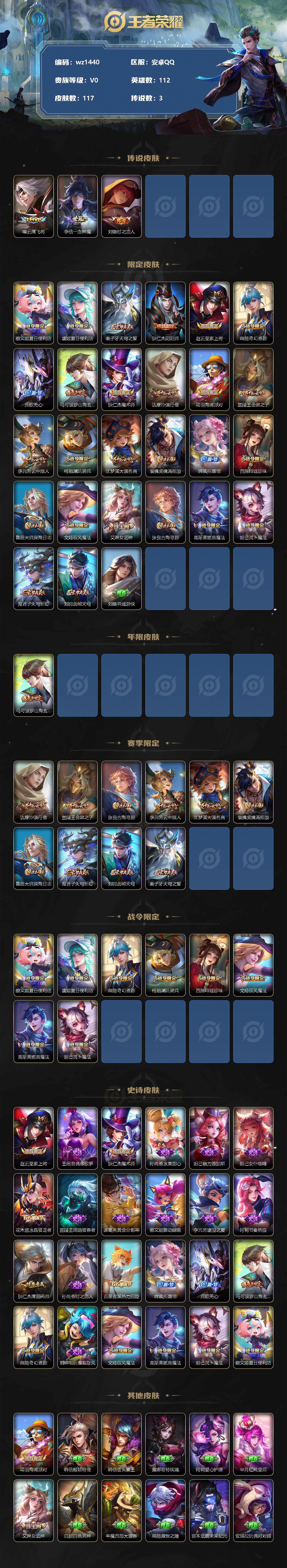 【游戏多多】【王者荣耀】【编号:3339491】【可二次实名】【wz1440】【商品标题】:安卓Q-V0-至尊星耀V段位-112英雄-117皮肤-0典藏-0珍品无双-0无双-0珍品传说-3传说-23史诗 【传说皮肤】:曜云鹰飞将,李信一念神魔,刘备时之恋人 【限定皮肤】:蔡文姬夏日便利店,虞姬夏日便利店,姜子牙天穹之誓,狄仁杰阴阳师,赵云皇家上将,扁鹊奇幻香踪,元歌无心,马可波罗山海玄木吟,狄仁杰魔术师,达摩沙漠行僧,项羽海滩派对,兰陵王金庭之子,李元芳云中旅人,杨戬潮玩骑兵,沈梦溪大漠名商,裴擒虎擒涛扼浪,嫦娥拒霜思,西施玲珑珍味,鲁班大师探海日志,戈娅驭风魔法,艾琳女武神,张良古海寻踪,高渐离燃音魔法,妲己灵卜魔法,鬼谷子天穹祈灯,刘邦剑破天穹,刘备异域游侠 【年限皮肤】:马可波罗山海玄木吟 【赛季限定】:达摩沙漠行僧,兰陵王金庭之子,张良古海寻踪,李元芳云中旅人,沈梦溪大漠名商,裴擒虎擒涛扼浪,鲁班大师探海日志,鬼谷子天穹祈灯,刘邦剑破天穹,姜子牙天穹之誓 【战令限定】:蔡文姬夏日便利店,虞姬夏日便利店,扁鹊奇幻香踪,杨戬潮玩骑兵,西施玲珑珍味,戈娅驭风魔法,高渐离燃音魔法,妲己灵卜魔法 【史诗皮肤】:赵云皇家上将,王昭君偶像歌手,狄仁杰魔术师,孙尚香水果甜心,妲己魅力维加斯,妲己女仆咖啡,花木兰水晶猎龙者,兰陵王暗隐猎兽者,诸葛亮黄金分割率,蔡文姬舞动绿茵,李元芳逐浪之夏,阿轲节奏热浪,狄仁杰鹰眼统帅,孙尚香时之恋人,百里玄策热力回旋,嫦娥拒霜思,元歌无心,马可波罗山海玄木吟,扁鹊奇幻香踪,刘禅电玩爆裂旋风,戈娅驭风魔法,妲己灵卜魔法,高渐离燃音魔法,蔡文姬夏日便利店 【其他皮肤】:项羽海滩派对,韩信教廷特使,韩信街头霸王,露娜哥特玫瑰,阿轲爱心护理,芈月红桃皇后,艾琳女武神,白起白色死神,牛魔西部大镖客,扁鹊救世之瞳,宫本武藏未来纪元,安琪拉玩偶对对碰,孙膑天使之翼,亚瑟死亡骑士,花木兰兔女郎,刘备万事如意,狄仁杰阴阳师,刘备汉昭烈帝,关羽龙腾万里,王昭君幻想奇妙夜,狂铁命运角斗场,老夫子功夫老勺,孙尚香沉稳之力,李白敏锐之力,大乔守护之力,吕布野性能量,哪吒次元突破,露娜瓷语鉴心,鲁班大师乓乓大师,达摩沙漠行僧,兰陵王金庭之子,沈梦溪大漠名商,李元芳云中旅人,赵怀真太极少年,裴擒虎擒涛扼浪,杨戬潮玩骑兵,莱西奥西部游侠,鲁班大师探海日志,西施玲珑珍味,姬小满零食大作战,李元芳妄想特派,张良古海寻踪,亚连破局者,后羿完美运算,鬼谷子天穹祈灯,妲己灵卜魔法,刘邦剑破天穹,刘备异域游侠,貂蝉长夏之忆,姜子牙天穹之誓,虞姬夏日便利店,吕布逐霄战戟,苍苍林狼骑,典韦铁骨偃魂,影魅影绮裳,东皇太一金福满堂,甄姬逆浪荇歌,鲁班七号木偶奇遇记,项羽帝国元帅,老夫子潮流仙人,孙悟空西部大镖客,周瑜海军大将,后羿精灵王,兰陵王隐刃,李白范海辛,钟馗地府判官,李元芳特种部队,虞姬加勒比小姐,关羽天启骑士,雅典娜战争女神,马可波罗激情绿茵,大乔伊势巫女,东皇太一东海龙王,百里守约绝影神枪,百里玄策威尼斯狂欢,苏烈爱与和平,公孙离花间舞,元歌午夜歌剧院,司马懿魇语军师,伽罗花见巫女,李信灼热之刃,上官婉儿修竹墨客,猪八戒年年有余,盘古创世神祝,瑶森,曜归虚梦演,马超幸存者,蒙恬秩序猎龙将,澜孤猎,云缨赤焰之缨,暃碧珀绯影 【内测皮肤】:艾琳女武神 【营地ID】:1688350181