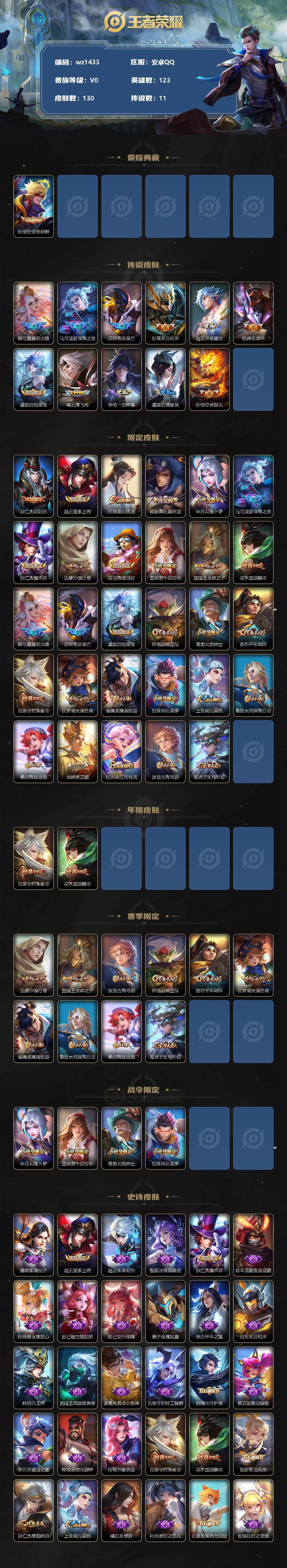 【游戏多多】【王者荣耀】【编号:3339492】【可二次实名】【wz1433】【商品标题】:安卓Q-V0-永恒钻石II段位-123英雄-130皮肤-1典藏-0珍品无双-0无双-0珍品传说-11传说-37史诗 【荣耀典藏】:孙悟空全息碎影 【传说皮肤】:娜可露露前尘镜,马可波罗深海之息,后羿无尽星芒,孙策末日机甲,赵云淬星耀世,铠绛天战甲,虞姬启明星使,曜云鹰飞将,李信一念神魔,虞姬云霓雀翎,孙悟空地狱火 【限定皮肤】:狄仁杰阴阳师,赵云皇家上将,庄周高山流水,高渐离玩趣恶龙,芈月幻夜卜梦,马可波罗深海之息,狄仁杰魔术师,达摩沙漠行僧,项羽海滩派对,王昭君午后时光,兰陵王金庭之子,花木兰瑞麟志,娜可露露前尘镜,后羿无尽星芒,虞姬启明星使,钟馗驱傩正仪,黄忠火炮绅士,苏烈千军破阵,百里守约朱雀志,沈梦溪大漠名商,裴擒虎擒涛扼浪,狂铁电玩高手,上官婉儿梁祝,鲁班大师探海日志,桑启海盐诗旅,金蝉唐三藏,阿古朵江河有灵,张良古海寻踪,鬼谷子天穹祈灯 【年限皮肤】:百里守约朱雀志,花木兰瑞麟志 【赛季限定】:达摩沙漠行僧,兰陵王金庭之子,张良古海寻踪,钟馗驱傩正仪,苏烈千军破阵,沈梦溪大漠名商,裴擒虎擒涛扼浪,鲁班大师探海日志,桑启海盐诗旅,鬼谷子天穹祈灯 【战令限定】:芈月幻夜卜梦,王昭君午后时光,黄忠火炮绅士,狂铁电玩高手 【史诗皮肤】:露娜紫霞仙子,赵云皇家上将,赵云未来纪元,甄姬冰雪圆舞曲,狄仁杰魔术师,宫本武藏鬼剑武藏,孙尚香水果甜心,妲己魅力维加斯,妲己女仆咖啡,墨子金属风暴,李白千年之狐,吕布末日机甲,韩信白龙吟,兰陵王暗隐猎兽者,诸葛亮黄金分割率,百里守约特工魅影,铠曙光守护者,蔡文姬舞动绿茵,李元芳逐浪之夏,程咬金功夫厨神,阿轲节奏热浪,百里守约朱雀志,花木兰瑞麟志,伽罗箭羽风息,狄仁杰鹰眼统帅,上官婉儿梁祝,橘右京修罗,孙尚香时之恋人,百里玄策热力回旋,安琪拉时之奇旅,庄周高山流水,黄忠火炮绅士,澜赏金猎手,貂蝉唤灵魅影,狂铁电玩高手,金蝉唐三藏,阿古朵江河有灵 【其他皮肤】:项羽海滩派对,韩信教廷特使,韩信街头霸王,露娜哥特玫瑰,阿轲爱心护理,达摩大发明家,扁鹊化身博士,安琪拉玩偶对对碰,典韦黄金武士,亚瑟死亡骑士,花木兰兔女郎,刘备万事如意,后羿阿尔法小队,狄仁杰阴阳师,钟无艳海滩丽影,王昭君幻想奇妙夜,狂铁命运角斗场,老夫子功夫老勺,孙尚香沉稳之力,诸葛亮掌控之力,李白敏锐之力,孙膑归虚梦演,高渐离玩趣恶龙,沈梦溪鲨炮海盗猫,狂铁特工战影,刘禅秘密基地,钟馗驱傩正仪,鲁班大师乓乓大师,苏烈千军破阵,达摩沙漠行僧,芈月幻夜卜梦,刘邦虎啸剑宗,兰陵王金庭之子,刘禅唤灵魔甲,王昭君午后时光,沈梦溪大漠名商,蒙犽胡桃狂想曲,蒙恬蔚蓝守将,桑启海盐诗旅,裴擒虎擒涛扼浪,鲁班大师探海日志,李元芳妄想特派,张良古海寻踪,鬼谷子天穹祈灯,廉颇功夫炙烤,太乙真人谧流熔炉,姜子牙星梦巡礼,明世隐景韶洛都,戈娅玫蓝誓约,刘备浪漫序章,钟馗虚灵犬护,苏烈春野闲踪,张良灵野札记,阿古朵布丁狗之约,露娜命运加冕,鲁班七号木偶奇遇记,貂蝉异域舞娘,花木兰剑舞者,老夫子潮流仙人,孙悟空西部大镖客,周瑜海军大将,钟馗地府判官,马可波罗激情绿茵,杨戬埃及法老,干将莫邪第七人偶,百里守约绝影神枪,苏烈爱与和平,女娲尼罗河女神,明世隐占星师,元歌午夜歌剧院,孙策海之征途,司马懿魇语军师,盾山极冰防御线,伽罗花见巫女,李信灼热之刃,上官婉儿修竹墨客,猪八戒年年有余,瑶森,曜归虚梦演,澜孤猎,云缨赤焰之缨 【内测皮肤】:高渐离玩趣恶龙,狂铁特工战影 【营地ID】:1740035694