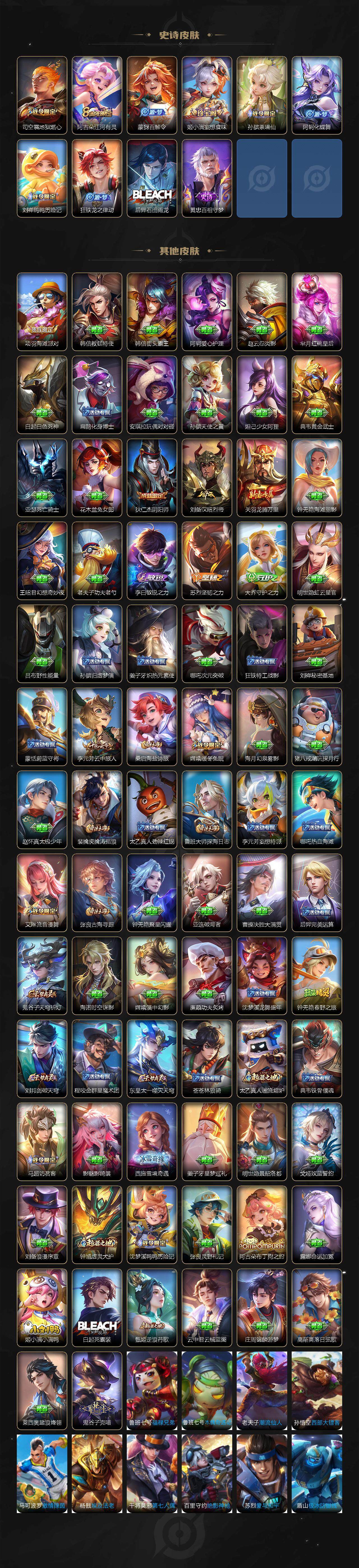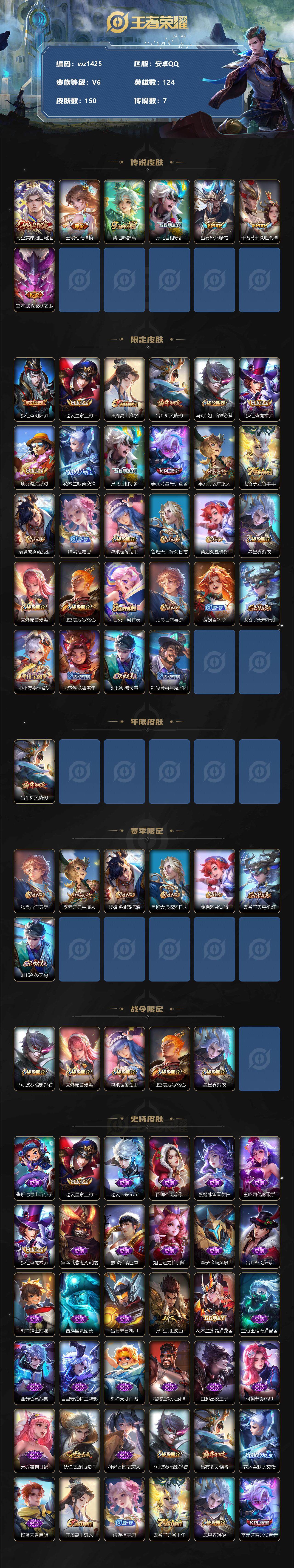 【游戏多多】【王者荣耀】【编号:3339494】【可二次实名】【wz1425】【商品标题】:安卓Q-V6-最强王者段位-124英雄-150皮肤-0典藏-0珍品无双-0无双-0珍品传说-7传说-46史诗 【传说皮肤】:司空震愿照山河定,云缨幻光神枪,桑启鸣野蒿,张飞百相守梦,吕布怒海麟威,干将莫邪久胜战神,宫本武藏地狱之眼 【限定皮肤】:狄仁杰阴阳师,赵云皇家上将,庄周高山流水,吕布御风骁将,马可波罗暗影游猎,狄仁杰魔术师,项羽海滩派对,花木兰默契交锋,张飞百相守梦,李元芳匿光侦查者,李元芳云中旅人,鬼谷子五谷丰年,裴擒虎擒涛扼浪,嫦娥拒霜思,嫦娥暖冬兔眠,鲁班大师探海日志,桑启海盐诗旅,暃星界游侠,艾琳流音漫舞,司空震地狱燃心,阿古朵江河有灵,张良古海寻踪,蒙犽百解令,鬼谷子天穹祈灯,姬小满妄想食味,沈梦溪龙舞盛年,刘邦剑破天穹,程咬金群星魔术团 【年限皮肤】:吕布御风骁将 【赛季限定】:张良古海寻踪,李元芳云中旅人,裴擒虎擒涛扼浪,鲁班大师探海日志,桑启海盐诗旅,鬼谷子天穹祈灯,刘邦剑破天穹 【战令限定】:马可波罗暗影游猎,艾琳流音漫舞,嫦娥暖冬兔眠,司空震地狱燃心,暃星界游侠 【史诗皮肤】:鲁班七号电玩小子,赵云皇家上将,赵云未来纪元,貂蝉圣诞恋歌,甄姬冰雪圆舞曲,王昭君偶像歌手,狄仁杰魔术师,宫本武藏鬼剑武藏,嬴政摇滚巨星,妲己魅力维加斯,墨子金属风暴,吕布圣诞狂欢,刘禅绅士熊喵,曹操幽灵船长,吕布末日机甲,张飞乱世虎臣,花木兰水晶猎龙者,兰陵王暗隐猎兽者,亚瑟心灵战警,百里守约特工魅影,刘禅天才门将,程咬金功夫厨神,白起星夜王子,阿轲节奏热浪,大乔猫狗日记,狄仁杰鹰眼统帅,孙尚香时之恋人,马可波罗暗影游猎,吕布御风骁将,花木兰默契交锋,杨戬天秀启明,庄周高山流水,嫦娥拒霜思,鬼谷子五谷丰年,暃星界游侠,李元芳匿光侦查者,司空震地狱燃心,阿古朵江河有灵,蒙犽百解令,姬小满妄想食味,孙膑茶境仙,阿轲化蝶舞,刘禅鸭鸭历险记,狂铁龙之律动,后羿石田雨龙,黄忠百相守梦 【其他皮肤】:项羽海滩派对,韩信教廷特使,韩信街头霸王,阿轲爱心护理,赵云忍炎影,芈月红桃皇后,白起白色死神,扁鹊化身博士,安琪拉玩偶对对碰,孙膑天使之翼,妲己少女阿狸,典韦黄金武士,亚瑟死亡骑士,花木兰兔女郎,狄仁杰阴阳师,刘备汉昭烈帝,关羽龙腾万里,钟无艳海滩丽影,王昭君幻想奇妙夜,老夫子功夫老勺,李白敏锐之力,苏烈坚韧之力,大乔守护之力,明世隐虹云星官,吕布野性能量,孙膑归虚梦演,姜子牙炽热元素使,哪吒次元突破,狂铁特工战影,刘禅秘密基地,蒙恬蔚蓝守将,李元芳云中旅人,桑启海盐诗旅,嫦娥暖冬兔眠,海月幻泉雾影,猪八戒潮玩探月行,赵怀真太极少年,裴擒虎擒涛扼浪,太乙真人劲辣红锅,鲁班大师探海日志,李元芳妄想特派,哪吒热血海滩,艾琳流音漫舞,张良古海寻踪,钟无艳聚星闪耀,亚连破局者,曹操决胜大满贯,后羿完美运算,鬼谷子天穹祈灯,海诺时空谍影,嫦娥漠中幻影,廉颇功夫炙烤,沈梦溪龙舞盛年,钟无艳春野之旅,刘邦剑破天穹,程咬金群星魔术团,东皇太一噬灭天穹,苍苍林狼骑,太乙真人谧流熔炉,典韦铁骨偃魂,马超访茗客,影魅影绮裳,西施雪境奇遇,姜子牙星梦巡礼,明世隐景韶洛都,戈娅玫蓝誓约,刘备浪漫序章,钟馗虚灵犬护,沈梦溪鸭鸭历险记,张良灵野札记,阿古朵布丁狗之约,露娜命运加冕,姬小满小满鸭,白起死霸装,甄姬逆浪荇歌,云中君云械蓝图,庄周锦麟游梦,高渐离落日弦歌,莱西奥踏浪烽翎,鬼谷子克喵,鲁班七号福禄兄弟,鲁班七号木偶奇遇记,老夫子潮流仙人,孙悟空西部大镖客,马可波罗激情绿茵,杨戬埃及法老,干将莫邪第七人偶,百里守约绝影神枪,苏烈爱与和平,盾山极冰防御线,蒙犽归虚梦演,镜冰刃幻境,蒙恬秩序猎龙将,澜孤猎,司空震启蛰,云缨赤焰之缨,金蝉前尘 【内测皮肤】:狂铁特工战影 【营地ID】:1731904487