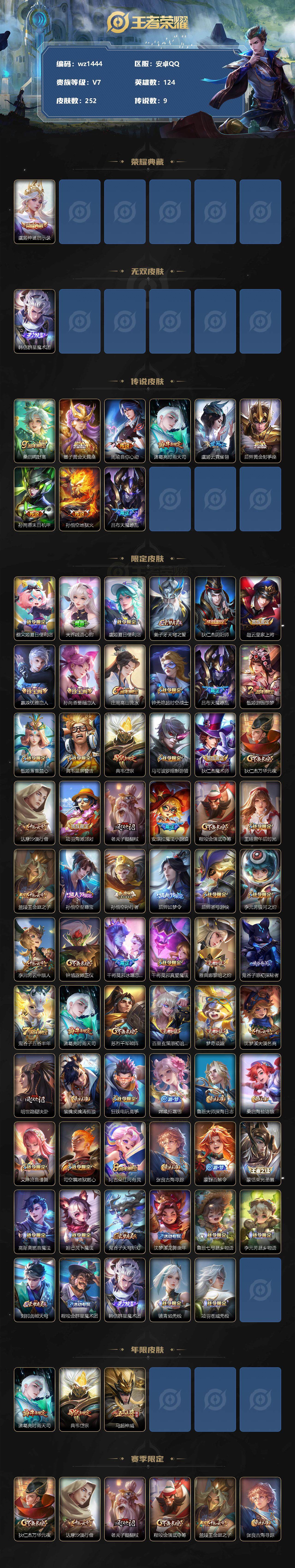 【游戏多多】【王者荣耀】【编号:3339497】【可二次实名】【wz1444】【商品标题】:安卓Q-V7-最强王者段位-124英雄-252皮肤-1典藏-0珍品无双-1无双-0珍品传说-9传说-85史诗 【荣耀典藏】:虞姬神鉴启示录 【无双皮肤】:韩信群星魔术团 【传说皮肤】:桑启鸣野蒿,墨子黄金天蝎座,周瑜音你心动,诸葛亮时雨天司,虞姬云霓雀翎,后羿黄金射手座,孙尚香末日机甲,孙悟空地狱火,吕布天魔缭乱 【限定皮肤】:蔡文姬夏日便利店,大乔绒语心约,虞姬夏日便利店,姜子牙天穹之誓,狄仁杰阴阳师,赵云皇家上将,嬴政优雅恋人,孙尚香蔷薇恋人,庄周高山流水,钟无艳超时空战士,吕布天魔缭乱,甄姬游园惊梦,甄姬落雪兰心,典韦蓝屏警告,典韦岱宗,马可波罗暗影游猎,狄仁杰魔术师,狄仁杰万华元夜,达摩沙漠行僧,项羽海滩派对,老夫子醍醐杖,安琪拉魔法小厨娘,程咬金演武夺筹,王昭君午后时光,兰陵王金庭之子,孙悟空至尊宝,孙悟空孙行者,后羿如梦令,后羿圣弓游侠,李元芳银河之约,李元芳云中旅人,钟馗驱傩正仪,干将莫邪冰霜恋舞曲,干将莫邪真爱魔法,雅典娜黎明之约,鬼谷子原初探秘者,鬼谷子五谷丰年,诸葛亮时雨天司,苏烈千军破阵,百里玄策原初追逐者,梦奇顽趣,沈梦溪大漠名商,明世隐疑决卦,裴擒虎擒涛扼浪,狂铁电玩高手,嫦娥拒霜思,鲁班大师探海日志,桑启海盐诗旅,艾琳流音漫舞,司空震地狱燃心,阿古朵江河有灵,张良古海寻踪,蒙犽百解令,蒙恬荣光圣徽,高渐离燃音魔法,妲己灵卜魔法,鬼谷子天穹祈灯,沈梦溪龙舞盛年,鲁班七号蔬乡物语,李元芳蔬乡物语,刘邦剑破天穹,程咬金群星魔术团,韩信群星魔术团,镜青焰无极,项羽苍威无极 【年限皮肤】:诸葛亮时雨天司,典韦岱宗,马超神威 【赛季限定】:狄仁杰万华元夜,达摩沙漠行僧,老夫子醍醐杖,程咬金演武夺筹,兰陵王金庭之子,张良古海寻踪,李元芳云中旅人,钟馗驱傩正仪,雅典娜黎明之约,鬼谷子原初探秘者,苏烈千军破阵,百里玄策原初追逐者,梦奇顽趣,沈梦溪大漠名商,明世隐疑决卦,裴擒虎擒涛扼浪,鲁班大师探海日志,桑启海盐诗旅,鬼谷子天穹祈灯,蒙恬荣光圣徽,刘邦剑破天穹,姜子牙天穹之誓 【战令限定】:蔡文姬夏日便利店,虞姬夏日便利店,钟无艳超时空战士,甄姬落雪兰心,典韦蓝屏警告,马可波罗暗影游猎,王昭君午后时光,艾琳流音漫舞,后羿圣弓游侠,李元芳银河之约,干将莫邪真爱魔法,狂铁电玩高手,司空震地狱燃心,高渐离燃音魔法,妲己灵卜魔法,鲁班七号蔬乡物语,李元芳蔬乡物语,镜青焰无极,项羽苍威无极 【史诗皮肤】:露娜紫霞仙子,赵云皇家上将,赵云未来纪元,貂蝉圣诞恋歌,甄姬冰雪圆舞曲,王昭君偶像歌手,狄仁杰魔术师,宫本武藏鬼剑武藏,孙尚香蔷薇恋人,孙尚香水果甜心,嬴政优雅恋人,妲己女仆咖啡,墨子金属风暴,吕布圣诞狂欢,刘禅绅士熊喵,曹操幽灵船长,李白千年之狐,吕布末日机甲,安琪拉魔法小厨娘,张飞乱世虎臣,孙悟空至尊宝,花木兰水晶猎龙者,刘邦德古拉伯爵,夏侯惇乘风破浪,小乔缤纷独角兽,兰陵王暗隐猎兽者,诸葛亮黄金分割率,甄姬游园惊梦,亚瑟心灵战警,雅典娜冰冠公主,安琪拉心灵骇客,百里守约特工魅影,铠曙光守护者,蔡文姬舞动绿茵,刘禅天才门将,李元芳逐浪之夏,程咬金功夫厨神,白起星夜王子,阿轲节奏热浪,孙策猫狗日记,大乔猫狗日记,干将莫邪冰霜恋舞曲,典韦蓝屏警告,伽罗箭羽风息,狄仁杰鹰眼统帅,李元芳银河之约,典韦岱宗,后羿如梦令,不知火舞魅语,马超神威,马可波罗暗影游猎,百里玄策原初追逐者,杨戬天秀启明,干将莫邪真爱魔法,沈梦溪月团寄思,孙悟空孙行者,庄周高山流水,嫦娥拒霜思,雅典娜黎明之约,狂铁电玩高手,钟无艳超时空战士,鬼谷子五谷丰年,梦奇顽趣,刘禅电玩爆裂旋风,司空震地狱燃心,阿古朵江河有灵,蒙犽百解令,妲己灵卜魔法,高渐离燃音魔法,蒙恬荣光圣徽,鲁班七号蔬乡物语,镜青焰无极,黄忠怒海争锋,蔡文姬夏日便利店,亚连破空之剑,百里守约百相守梦,牛魔星界战将,孙膑茶境仙,刘禅鸭鸭历险记,狂铁龙之律动,扁鹊灵蛊蚀心,亚瑟布丁狗之誓,后羿石田雨龙,周瑜百相守梦,钟无艳戍鼓铭心,黄忠百相守梦 【其他皮肤】:项羽海滩派对,韩信教廷特使,韩信街头霸王,露娜哥特玫瑰,达摩大发明家,赵云白执事,赵云忍炎影,芈月红桃皇后,白起白色死神,扁鹊化身博士,安琪拉玩偶对对碰,孙膑天使之翼,妲己少女阿狸,典韦黄金武士,亚瑟死亡骑士,达摩拳王,花木兰兔女郎,张飞五福同心,甄姬花好人间,刘备万事如意,宫本武藏万象初新,狄仁杰阴阳师,刘备纽约教父,刘备汉昭烈帝,关羽龙腾万里,钟无艳海滩丽影,王昭君幻想奇妙夜,老夫子功夫老勺,孙尚香沉稳之力,诸葛亮掌控之力,鬼谷子幻乐之宴,苏烈坚韧之力,明世隐虹云星官,张良幽兰居士,小乔丁香结,吕布野性能量,孙膑归虚梦演,沈梦溪鲨炮海盗猫,姜子牙炽热元素使,哪吒次元突破,明世隐疑决卦,老夫子醍醐杖,狂铁特工战影