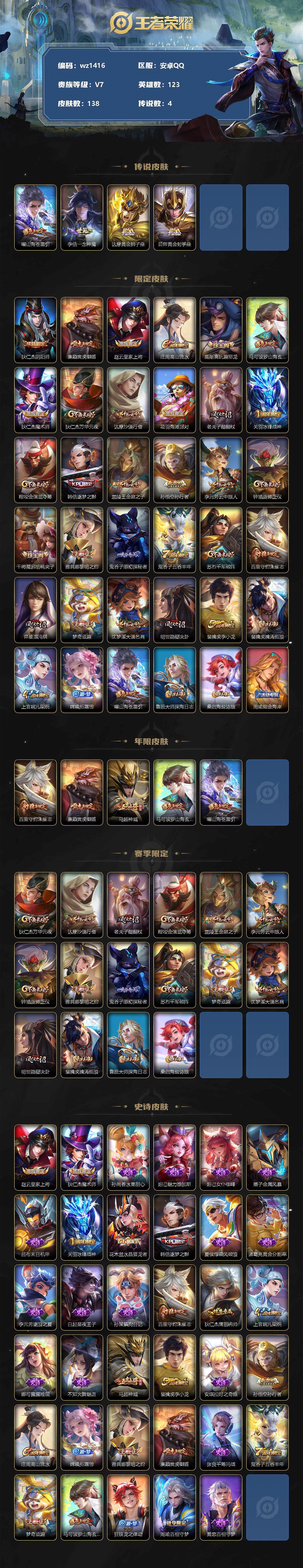 【游戏多多】【王者荣耀】【编号:3339506】【可二次实名】【wz1416】【商品标题】:安卓Q-V7-永恒钻石I段位-123英雄-138皮肤-0典藏-0珍品无双-0无双-0珍品传说-4传说-35史诗 【传说皮肤】:曜山海苍雷引,李信一念神魔,达摩黄金狮子座,后羿黄金射手座 【限定皮肤】:狄仁杰阴阳师,廉颇寅虎御盾,赵云皇家上将,庄周高山流水,高渐离玩趣恶龙,马可波罗山海玄木吟,狄仁杰魔术师,狄仁杰万华元夜,达摩沙漠行僧,项羽海滩派对,老夫子醍醐杖,关羽冰锋战神,程咬金演武夺筹,韩信逐梦之影,兰陵王金庭之子,孙悟空孙行者,李元芳云中旅人,钟馗驱傩正仪,干将莫邪胡桃夹子,雅典娜黎明之约,鬼谷子原初探秘者,鬼谷子五谷丰年,苏烈千军破阵,百里守约朱雀志,弈星混沌棋,梦奇顽趣,沈梦溪大漠名商,明世隐疑决卦,裴擒虎李小龙,裴擒虎擒涛扼浪,上官婉儿梁祝,嫦娥拒霜思,曜山海苍雷引,鲁班大师探海日志,桑启海盐诗旅,周瑜熔金海岸 【年限皮肤】:百里守约朱雀志,廉颇寅虎御盾,马超神威,马可波罗山海玄木吟,曜山海苍雷引 【赛季限定】:狄仁杰万华元夜,达摩沙漠行僧,老夫子醍醐杖,程咬金演武夺筹,兰陵王金庭之子,李元芳云中旅人,钟馗驱傩正仪,雅典娜黎明之约,鬼谷子原初探秘者,苏烈千军破阵,弈星混沌棋,梦奇顽趣,沈梦溪大漠名商,明世隐疑决卦,裴擒虎擒涛扼浪,鲁班大师探海日志,桑启海盐诗旅 【史诗皮肤】:赵云皇家上将,狄仁杰魔术师,孙尚香水果甜心,妲己魅力维加斯,妲己女仆咖啡,墨子金属风暴,吕布末日机甲,关羽冰锋战神,花木兰水晶猎龙者,韩信逐梦之影,夏侯惇乘风破浪,诸葛亮黄金分割率,李元芳逐浪之夏,白起星夜王子,孙策猫狗日记,百里守约朱雀志,狄仁杰鹰眼统帅,上官婉儿梁祝,娜可露露晚萤,不知火舞魅语,马超神威,裴擒虎李小龙,安琪拉时之奇旅,孙悟空孙行者,庄周高山流水,嫦娥拒霜思,雅典娜黎明之约,廉颇寅虎御盾,张良千筹问战,鬼谷子五谷丰年,梦奇顽趣,马可波罗山海玄木吟,狂铁龙之律动,周瑜百相守梦,黄忠百相守梦 【其他皮肤】:项羽海滩派对,韩信街头霸王,露娜哥特玫瑰,达摩大发明家,赵云白执事,赵云忍炎影,芈月红桃皇后,牛魔西部大镖客,扁鹊化身博士,宫本武藏未来纪元,姜子牙时尚教父,亚瑟死亡骑士,达摩拳王,花木兰兔女郎,张飞五福同心,甄姬花好人间,刘备万事如意,宫本武藏万象初新,后羿阿尔法小队,狄仁杰阴阳师,刘备纽约教父,刘备汉昭烈帝,王昭君幻想奇妙夜,诸葛亮掌控之力,李白敏锐之力,苏烈坚韧之力,大乔守护之力,吕布野性能量,高渐离玩趣恶龙,沈梦溪鲨炮海盗猫,姜子牙炽热元素使,弈星混沌棋,明世隐疑决卦,盾山圆桌骑士,老夫子醍醐杖,狂铁特工战影,廉颇无尽征程,鬼谷子原初探秘者,狄仁杰万华元夜,杨戬次元傲视,程咬金演武夺筹,张良缤纷绘卷,钟馗驱傩正仪,鲁班大师乓乓大师,苏烈千军破阵,典韦铁甲之心,干将莫邪胡桃夹子,达摩沙漠行僧,兰陵王金庭之子,刘禅唤灵魔甲,沈梦溪大漠名商,蒙犽胡桃狂想曲,蒙恬蔚蓝守将,李元芳云中旅人,戈娅危途狂花,桑启海盐诗旅,海月幻泉雾影,猪八戒潮玩探月行,牛魔牛运亨通,赵怀真太极少年,裴擒虎擒涛扼浪,太乙真人劲辣红锅,莱西奥西部游侠,鲁班大师探海日志,周瑜熔金海岸,太乙真人谧流熔炉,戈娅玫蓝誓约,苏烈春野闲踪,张良灵野札记,阿古朵布丁狗之约,甄姬逆浪荇歌,孙策百相守梦,鲁班七号福禄兄弟,貂蝉异域舞娘,老夫子潮流仙人,周瑜海军大将,刘禅英喵野望,刘邦圣殿之光,马可波罗激情绿茵,黄忠芝加哥教父,干将莫邪第七人偶,鬼谷子阿摩司公爵,百里守约绝影神枪,女娲尼罗河女神,公孙离花间舞,杨玉环霓裳曲,弈星踏雪寻梅,元歌午夜歌剧院,司马懿魇语军师,伽罗花见巫女,沈梦溪棒球奇才,曜归虚梦演,马超幸存者,蒙犽归虚梦演,镜冰刃幻境,蒙恬秩序猎龙将,澜孤猎,司空震启蛰,云缨赤焰之缨 【内测皮肤】:高渐离玩趣恶龙,狂铁特工战影,干将莫邪胡桃夹子 【营地ID】:2137754219
