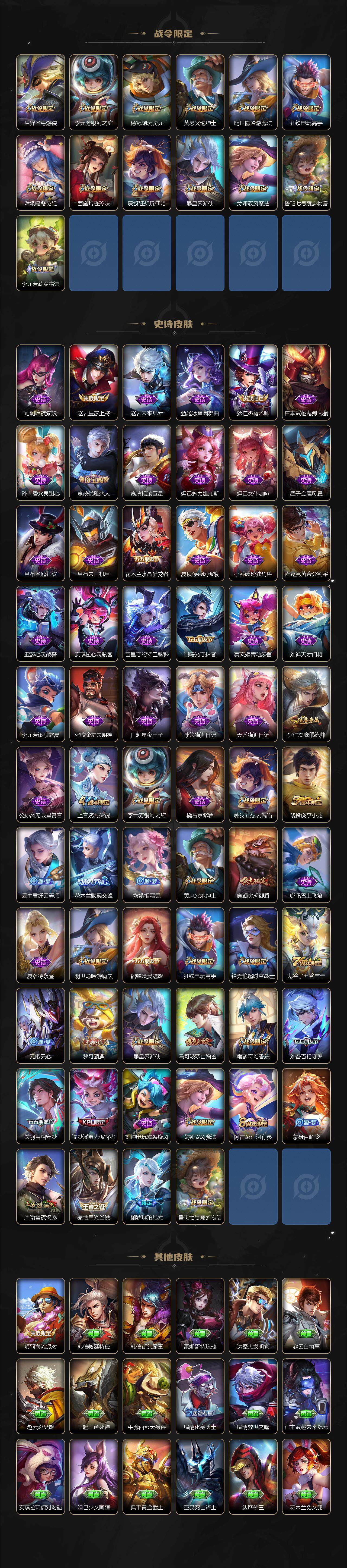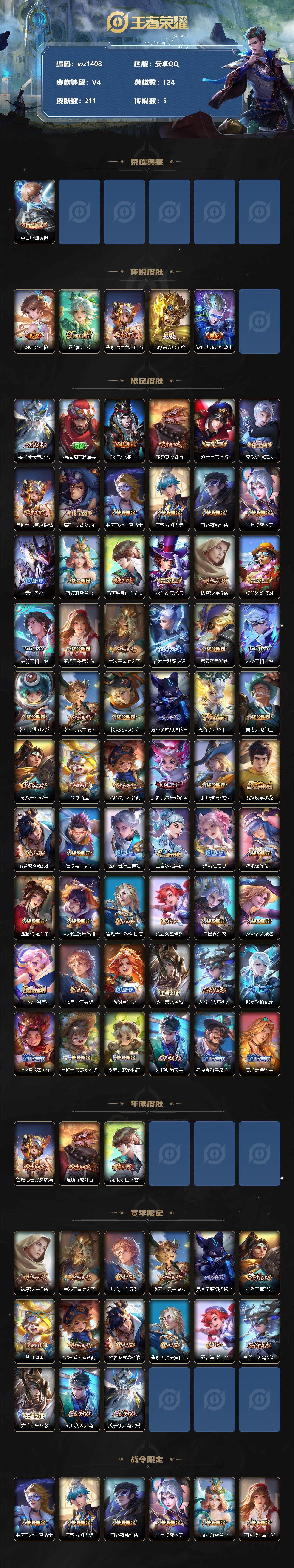 【游戏多多】【王者荣耀】【编号:3339508】【可二次实名】【wz1408】【商品标题】:安卓Q-V4-最强王者段位-124英雄-211皮肤-1典藏-0珍品无双-0无双-0珍品传说-5传说-64史诗 【荣耀典藏】:李白鸣剑曳影 【传说皮肤】:云缨幻光神枪,桑启鸣野蒿,鲁班七号寅虎瑞焰,达摩黄金狮子座,狄仁杰超时空战士 【限定皮肤】:姜子牙天穹之誓,杨戬破阵退雄兵,狄仁杰阴阳师,廉颇寅虎御盾,赵云皇家上将,嬴政优雅恋人,鲁班七号寅虎瑞焰,高渐离玩趣恶龙,钟无艳超时空战士,扁鹊奇幻香踪,白起夜都怪侠,芈月幻夜卜梦,元歌无心,甄姬落雪兰心,马可波罗山海玄木吟,狄仁杰魔术师,达摩沙漠行僧,项羽海滩派对,关羽百相守梦,王昭君午后时光,兰陵王金庭之子,花木兰默契交锋,后羿圣弓游侠,刘备百相守梦,李元芳银河之约,李元芳云中旅人,杨戬潮玩骑兵,鬼谷子原初探秘者,鬼谷子五谷丰年,黄忠火炮绅士,苏烈千军破阵,梦奇顽趣,沈梦溪大漠名商,沈梦溪匿光破解者,明世隐吟游魔法,裴擒虎李小龙,裴擒虎擒涛扼浪,狂铁电玩高手,云中君纤云弄巧,上官婉儿梁祝,嫦娥拒霜思,嫦娥暖冬兔眠,西施玲珑珍味,蒙犽狂想玩偶喵,鲁班大师探海日志,桑启海盐诗旅,暃星界游侠,戈娅驭风魔法,阿古朵江河有灵,张良古海寻踪,蒙犽百解令,蒙恬荣光圣徽,鬼谷子天穹祈灯,伽罗琥珀纪元,沈梦溪龙舞盛年,鲁班七号蔬乡物语,李元芳蔬乡物语,刘邦剑破天穹,程咬金群星魔术团,周瑜熔金海岸 【年限皮肤】:鲁班七号寅虎瑞焰,廉颇寅虎御盾,马可波罗山海玄木吟 【赛季限定】:达摩沙漠行僧,兰陵王金庭之子,张良古海寻踪,李元芳云中旅人,鬼谷子原初探秘者,苏烈千军破阵,梦奇顽趣,沈梦溪大漠名商,裴擒虎擒涛扼浪,鲁班大师探海日志,桑启海盐诗旅,鬼谷子天穹祈灯,蒙恬荣光圣徽,刘邦剑破天穹,姜子牙天穹之誓 【战令限定】:钟无艳超时空战士,扁鹊奇幻香踪,白起夜都怪侠,芈月幻夜卜梦,甄姬落雪兰心,王昭君午后时光,后羿圣弓游侠,李元芳银河之约,杨戬潮玩骑兵,黄忠火炮绅士,明世隐吟游魔法,狂铁电玩高手,嫦娥暖冬兔眠,西施玲珑珍味,蒙犽狂想玩偶喵,暃星界游侠,戈娅驭风魔法,鲁班七号蔬乡物语,李元芳蔬乡物语 【史诗皮肤】:阿轲暗夜猫娘,赵云皇家上将,赵云未来纪元,甄姬冰雪圆舞曲,狄仁杰魔术师,宫本武藏鬼剑武藏,孙尚香水果甜心,嬴政优雅恋人,嬴政摇滚巨星,妲己魅力维加斯,妲己女仆咖啡,墨子金属风暴,吕布圣诞狂欢,吕布末日机甲,花木兰水晶猎龙者,夏侯惇乘风破浪,小乔缤纷独角兽,诸葛亮黄金分割率,亚瑟心灵战警,安琪拉心灵骇客,百里守约特工魅影,铠曙光守护者,蔡文姬舞动绿茵,刘禅天才门将,李元芳逐浪之夏,程咬金功夫厨神,白起星夜王子,孙策猫狗日记,大乔猫狗日记,狄仁杰鹰眼统帅,公孙离无限星赏官,上官婉儿梁祝,李元芳银河之约,橘右京修罗,蒙犽狂想玩偶喵,裴擒虎李小龙,云中君纤云弄巧,花木兰默契交锋,嫦娥拒霜思,黄忠火炮绅士,廉颇寅虎御盾,哪吒雪上飞焰,夏洛特永昼,明世隐吟游魔法,貂蝉唤灵魅影,狂铁电玩高手,钟无艳超时空战士,鬼谷子五谷丰年,元歌无心,梦奇顽趣,暃星界游侠,马可波罗山海玄木吟,扁鹊奇幻香踪,刘备百相守梦,关羽百相守梦,沈梦溪匿光破解者,刘禅电玩爆裂旋风,戈娅驭风魔法,阿古朵江河有灵,蒙犽百解令,周瑜雪夜绮愿,蒙恬荣光圣徽,伽罗琥珀纪元,鲁班七号蔬乡物语 【其他皮肤】:项羽海滩派对,韩信教廷特使,韩信街头霸王,露娜哥特玫瑰,达摩大发明家,赵云白执事,赵云忍炎影,白起白色死神,牛魔西部大镖客,扁鹊化身博士,扁鹊救世之瞳,宫本武藏未来纪元,安琪拉玩偶对对碰,妲己少女阿狸,典韦黄金武士,亚瑟死亡骑士,达摩拳王,花木兰兔女郎,张飞五福同心,刘备万事如意,后羿阿尔法小队,狄仁杰阴阳师,关羽龙腾万里,墨子进击墨子号,钟无艳海滩丽影,王昭君幻想奇妙夜,老夫子功夫老勺,孙尚香沉稳之力,鬼谷子幻乐之宴,大乔守护之力,明世隐虹云星官,孙膑归虚梦演,高渐离玩趣恶龙,沈梦溪鲨炮海盗猫,姜子牙炽热元素使,哪吒次元突破,盾山圆桌骑士,狂铁特工战影,鬼谷子原初探秘者,刘禅秘密基地,张良缤纷绘卷,鲁班大师乓乓大师,苏烈千军破阵,后羿圣弓游侠,马可波罗潮玩牛仔,达摩沙漠行僧,芈月幻夜卜梦,白起夜都怪侠,兰陵王金庭之子,刘禅唤灵魔甲,米莱狄契约魔法,王昭君午后时光,沈梦溪大漠名商,蒙恬蔚蓝守将,甄姬落雪兰心,李元芳云中旅人,桑启海盐诗旅,嫦娥暖冬兔眠,海月幻泉雾影,猪八戒潮玩探月行,牛魔牛运亨通,裴擒虎擒涛扼浪,杨戬潮玩骑兵,太乙真人劲辣红锅,莱西奥西部游侠,鲁班大师探海日志,西施玲珑珍味,李元芳妄想特派,哪吒热血海滩,张良古海寻踪,钟无艳聚星闪耀,亚连破局者,兰陵王幻夜行动,曹操决胜大满贯,后羿完美运算,程咬金暖冬絮语,鬼谷子天穹祈灯,海诺时空谍影,嫦娥漠中幻影,廉颇功夫炙烤,沈梦溪龙舞盛年,钟无艳春野之旅,李元芳蔬乡物