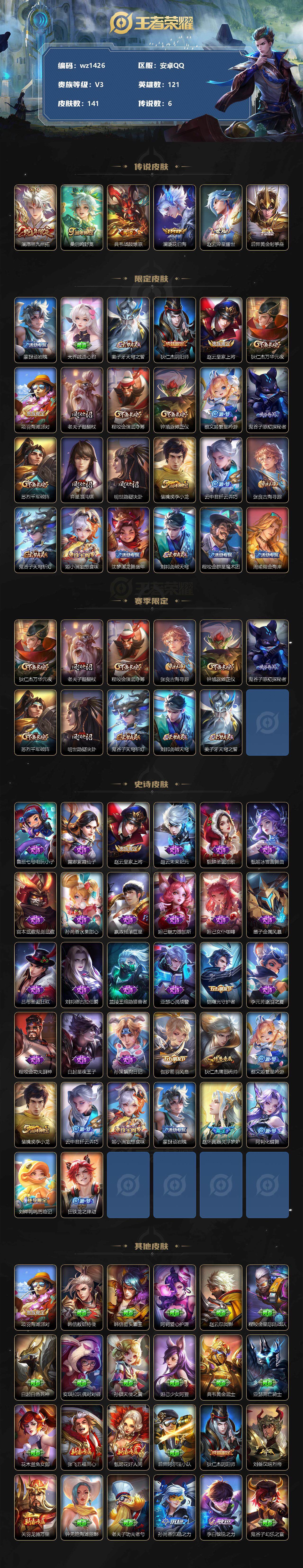 【游戏多多】【王者荣耀】【编号:3339511】【可二次实名】【wz1426】【商品标题】:安卓Q-V3-至尊星耀I段位-121英雄-141皮肤-0典藏-0珍品无双-0无双-0珍品传说-6传说-32史诗 【传说皮肤】:澜愿照九州拓,桑启鸣野蒿,典韦战鼓燎原,澜逐花归海,赵云淬星耀世,后羿黄金射手座 【限定皮肤】:蒙犽顽岩魄,大乔绒语心约,姜子牙天穹之誓,狄仁杰阴阳师,赵云皇家上将,狄仁杰万华元夜,项羽海滩派对,老夫子醍醐杖,程咬金演武夺筹,钟馗驱傩正仪,蔡文姬繁星吟游,鬼谷子原初探秘者,苏烈千军破阵,弈星混沌棋,明世隐疑决卦,裴擒虎李小龙,云中君纤云弄巧,张良古海寻踪,鬼谷子天穹祈灯,姬小满妄想食味,沈梦溪龙舞盛年,刘邦剑破天穹,程咬金群星魔术团,周瑜熔金海岸 【赛季限定】:狄仁杰万华元夜,老夫子醍醐杖,程咬金演武夺筹,张良古海寻踪,钟馗驱傩正仪,鬼谷子原初探秘者,苏烈千军破阵,弈星混沌棋,明世隐疑决卦,鬼谷子天穹祈灯,刘邦剑破天穹,姜子牙天穹之誓 【史诗皮肤】:鲁班七号电玩小子,露娜紫霞仙子,赵云皇家上将,赵云未来纪元,貂蝉圣诞恋歌,甄姬冰雪圆舞曲,宫本武藏鬼剑武藏,孙尚香水果甜心,嬴政摇滚巨星,妲己魅力维加斯,妲己女仆咖啡,墨子金属风暴,吕布圣诞狂欢,刘邦德古拉伯爵,兰陵王暗隐猎兽者,亚瑟心灵战警,铠曙光守护者,李元芳逐浪之夏,程咬金功夫厨神,白起星夜王子,孙策猫狗日记,伽罗箭羽风息,狄仁杰鹰眼统帅,蔡文姬繁星吟游,裴擒虎李小龙,云中君纤云弄巧,姬小满妄想食味,蒙犽顽岩魄,赵怀真器灵浮梦炉,阿轲化蝶舞,刘禅鸭鸭历险记,狂铁龙之律动 【其他皮肤】:项羽海滩派对,韩信教廷特使,韩信街头霸王,阿轲爱心护理,赵云忍炎影,程咬金星际陆战队,白起白色死神,安琪拉玩偶对对碰,孙膑天使之翼,妲己少女阿狸,典韦黄金武士,亚瑟死亡骑士,花木兰兔女郎,张飞五福同心,甄姬花好人间,后羿阿尔法小队,狄仁杰阴阳师,刘备汉昭烈帝,关羽龙腾万里,钟无艳海滩丽影,老夫子功夫老勺,孙尚香沉稳之力,李白敏锐之力,鬼谷子幻乐之宴,苏烈坚韧之力,大乔守护之力,明世隐虹云星官,孙膑归虚梦演,沈梦溪鲨炮海盗猫,姜子牙炽热元素使,弈星混沌棋,哪吒次元突破,鲁班七号黑桃队长,明世隐疑决卦,盾山圆桌骑士,老夫子醍醐杖,鬼谷子原初探秘者,狄仁杰万华元夜,刘禅秘密基地,露娜瓷语鉴心,程咬金演武夺筹,钟馗驱傩正仪,鲁班大师乓乓大师,苏烈千军破阵,马可波罗潮玩牛仔,程咬金无双福将,刘禅唤灵魔甲,猪八戒潮玩探月行,太乙真人劲辣红锅,哪吒热血海滩,张良古海寻踪,后羿完美运算,鬼谷子天穹祈灯,廉颇功夫炙烤,沈梦溪龙舞盛年,钟无艳春野之旅,刘邦剑破天穹,程咬金群星魔术团,姜子牙天穹之誓,周瑜熔金海岸,大乔绒语心约,盘古敬我三分,东皇太一噬灭天穹,干将莫邪雾都夜雨,苍苍林狼骑,太乙真人谧流熔炉,典韦铁骨偃魂,西施雪境奇遇,姜子牙星梦巡礼,明世隐景韶洛都,戈娅玫蓝誓约,钟馗虚灵犬护,沈梦溪鸭鸭历险记,苏烈春野闲踪,张良灵野札记,阿古朵布丁狗之约,露娜命运加冕,甄姬逆浪荇歌,莱西奥踏浪烽翎,鲁班七号木偶奇遇记,项羽帝国元帅,钟无艳生化警戒,貂蝉异域舞娘,王昭君精灵公主,小乔万圣前夜,孙悟空西部大镖客,周瑜海军大将,太乙真人圆桌骑士,大乔伊势巫女,铠龙域领主,明世隐占星师,裴擒虎街头旋风,米莱狄精准探案法,孙策海之征途,伽罗花见巫女,上官婉儿修竹墨客,猪八戒年年有余,盘古创世神祝,瑶森,西施归虚梦演,蒙犽归虚梦演,澜孤猎,暃碧珀绯影 【营地ID】:1629713254