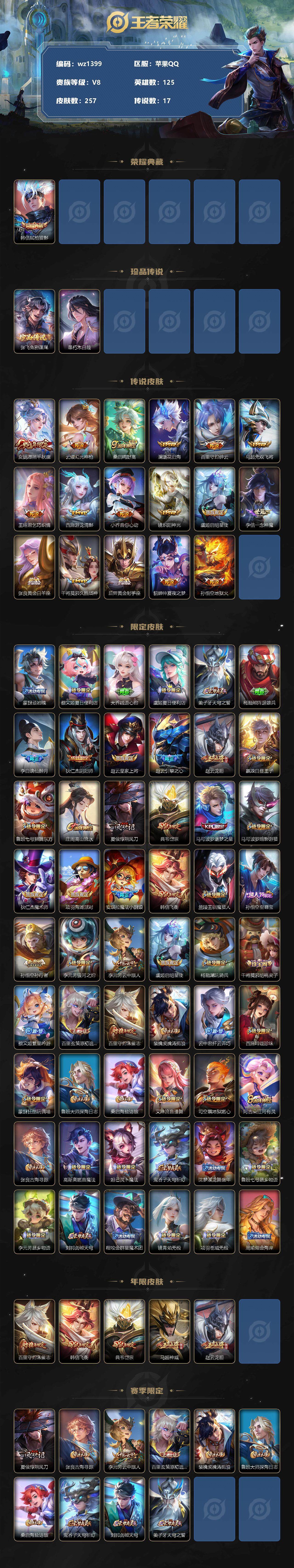 【游戏多多】【王者荣耀】【编号:3339515】【可二次实名】【wz1399】【商品标题】:苹果Q-V8-最强王者段位-125英雄-257皮肤-1典藏-0珍品无双-0无双-2珍品传说-17传说-83史诗 【荣耀典藏】:韩信弑枪猎影 【珍品传说】:张飞兔狲蓬尾,暃朽木白哉 【传说皮肤】:女娲愿照千秋盛,云缨幻光神枪,桑启鸣野蒿,澜逐花归海,百里守约碎云,马超无双飞将,王昭君乞巧织情,西施游龙清影,小乔音你心动,镜炽阳神光,虞姬启明星使,李信一念神魔,张良黄金白羊座,干将莫邪久胜战神,后羿黄金射手座,貂蝉仲夏夜之梦,孙悟空地狱火 【限定皮肤】:蒙犽顽岩魄,蔡文姬夏日便利店,大乔绒语心约,虞姬夏日便利店,姜子牙天穹之誓,杨戬破阵退雄兵,李白谪仙醉月,狄仁杰阴阳师,赵云皇家上将,赵云引擎之心,赵云龙胆,嬴政白昼王子,鲁班七号狮舞东方,庄周高山流水,夏侯惇朔风刀,典韦岱宗,马可波罗逐梦之星,马可波罗暗影游猎,狄仁杰魔术师,项羽海滩派对,安琪拉魔法小厨娘,韩信飞衡,兰陵王驯魔猎人,孙悟空至尊宝,孙悟空孙行者,李元芳银河之约,李元芳云中旅人,虞姬启明星使,杨戬潮玩骑兵,干将莫邪胡桃夹子,蔡文姬繁星吟游,百里玄策原初追逐者,百里守约朱雀志,裴擒虎擒涛扼浪,云中君纤云弄巧,西施玲珑珍味,蒙犽狂想玩偶喵,鲁班大师探海日志,桑启海盐诗旅,艾琳流音漫舞,司空震地狱燃心,阿古朵江河有灵,张良古海寻踪,高渐离燃音魔法,妲己灵卜魔法,鬼谷子天穹祈灯,沈梦溪龙舞盛年,鲁班七号蔬乡物语,李元芳蔬乡物语,刘邦剑破天穹,程咬金群星魔术团,镜青焰无极,项羽苍威无极,周瑜熔金海岸 【年限皮肤】:百里守约朱雀志,韩信飞衡,典韦岱宗,马超神威,赵云龙胆 【赛季限定】:夏侯惇朔风刀,张良古海寻踪,李元芳云中旅人,百里玄策原初追逐者,裴擒虎擒涛扼浪,鲁班大师探海日志,桑启海盐诗旅,鬼谷子天穹祈灯,刘邦剑破天穹,姜子牙天穹之誓 【战令限定】:蔡文姬夏日便利店,虞姬夏日便利店,嬴政白昼王子,鲁班七号狮舞东方,马可波罗暗影游猎,兰陵王驯魔猎人,艾琳流音漫舞,李元芳银河之约,杨戬潮玩骑兵,西施玲珑珍味,蒙犽狂想玩偶喵,司空震地狱燃心,高渐离燃音魔法,妲己灵卜魔法,鲁班七号蔬乡物语,李元芳蔬乡物语,镜青焰无极,项羽苍威无极 【史诗皮肤】:鲁班七号电玩小子,露娜紫霞仙子,阿轲暗夜猫娘,赵云皇家上将,赵云未来纪元,貂蝉圣诞恋歌,甄姬冰雪圆舞曲,王昭君偶像歌手,狄仁杰魔术师,廉颇地狱岩魂,宫本武藏鬼剑武藏,孙尚香水果甜心,嬴政摇滚巨星,妲己魅力维加斯,妲己女仆咖啡,墨子金属风暴,吕布圣诞狂欢,刘禅绅士熊喵,曹操幽灵船长,李白千年之狐,吕布末日机甲,安琪拉魔法小厨娘,张飞乱世虎臣,孙悟空至尊宝,赵云引擎之心,花木兰水晶猎龙者,刘邦德古拉伯爵,夏侯惇乘风破浪,兰陵王暗隐猎兽者,诸葛亮黄金分割率,马可波罗逐梦之星,雅典娜冰冠公主,安琪拉心灵骇客,百里守约特工魅影,铠曙光守护者,刘禅天才门将,李元芳逐浪之夏,白起星夜王子,阿轲节奏热浪,嬴政白昼王子,孙策猫狗日记,百里守约朱雀志,伽罗箭羽风息,鲁班七号狮舞东方,狄仁杰鹰眼统帅,公孙离无限星赏官,兰陵王驯魔猎人,蔡文姬繁星吟游,李元芳银河之约,韩信飞衡,典韦岱宗,马超神威,赵云龙胆,马可波罗暗影游猎,蒙犽狂想玩偶喵,百里玄策原初追逐者,云中君纤云弄巧,蒙犽龙鼓争鸣,孙悟空孙行者,庄周高山流水,司马懿暗渊魔法,貂蝉唤灵魅影,刘禅电玩爆裂旋风,司空震地狱燃心,阿古朵江河有灵,妲己灵卜魔法,高渐离燃音魔法,鲁班七号蔬乡物语,镜青焰无极,蔡文姬夏日便利店,蒙犽顽岩魄,廉颇撼地雄心,亚连破空之剑,弈星炽弈燎原,李白谪仙醉月,牛魔星界战将,孙膑茶境仙,狄仁杰绮世丹青,阿轲化蝶舞,刘禅鸭鸭历险记,狂铁龙之律动,扁鹊灵蛊蚀心,百里守约雪豹霜爪,黄忠百相守梦 【其他皮肤】:项羽海滩派对,韩信教廷特使,韩信街头霸王,露娜哥特玫瑰,阿轲爱心护理,赵云白执事,赵云忍炎影,白起白色死神,牛魔西部大镖客,武则天东方不败,宫本武藏未来纪元,孙膑天使之翼,姜子牙时尚教父,妲己少女阿狸,典韦黄金武士,亚瑟死亡骑士,达摩拳王,花木兰兔女郎,张飞五福同心,甄姬花好人间,刘备万事如意,后羿阿尔法小队,狄仁杰阴阳师,刘备纽约教父,关羽龙腾万里,钟无艳海滩丽影,王昭君幻想奇妙夜,狂铁命运角斗场,老夫子功夫老勺,孙尚香沉稳之力,诸葛亮掌控之力,鬼谷子幻乐之宴,大乔守护之力,明世隐虹云星官,张良幽兰居士,小乔丁香结,吕布野性能量,沈梦溪鲨炮海盗猫,姜子牙炽热元素使,夏侯惇朔风刀,哪吒次元突破,狂铁特工战影,廉颇无尽征程,刘禅秘密基地,张良缤纷绘卷,鲁班大师乓乓大师,干将莫邪胡桃夹子,马可波罗潮玩牛仔,程咬金无双福将,米莱狄契约魔法,蒙恬蔚蓝守将,李元芳云中旅人,刘备潮玩造梦师,桑启海盐诗旅,猪八戒潮玩探月行,裴擒虎擒涛扼浪,杨戬潮玩骑兵,太乙真人劲辣红锅,