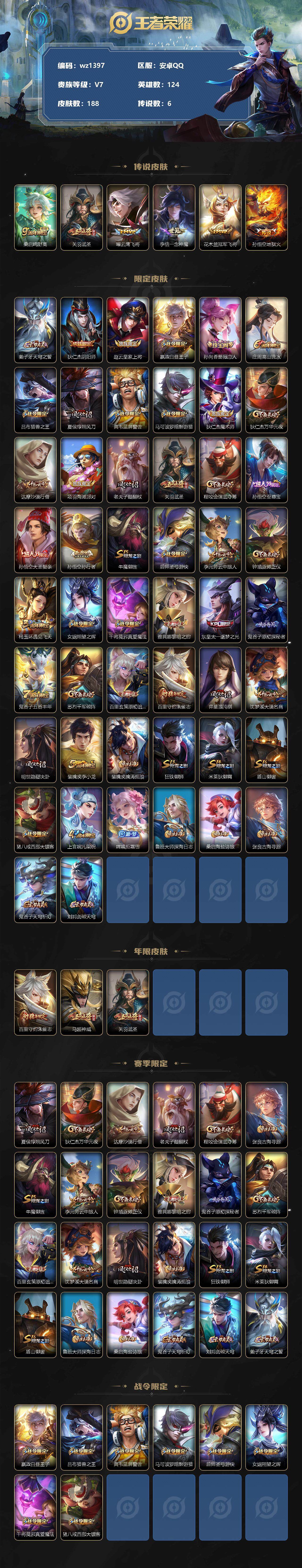【游戏多多】【王者荣耀】【编号:3339516】【可二次实名】【wz1397】【商品标题】:安卓Q-V7-最强王者段位-124英雄-188皮肤-0典藏-0珍品无双-0无双-0珍品传说-6传说-51史诗 【传说皮肤】:桑启鸣野蒿,关羽武圣,曜云鹰飞将,李信一念神魔,花木兰冠军飞将,孙悟空地狱火 【限定皮肤】:姜子牙天穹之誓,狄仁杰阴阳师,赵云皇家上将,嬴政白昼王子,孙尚香蔷薇恋人,庄周高山流水,吕布猎兽之王,夏侯惇朔风刀,典韦蓝屏警告,马可波罗暗影游猎,狄仁杰魔术师,狄仁杰万华元夜,达摩沙漠行僧,项羽海滩派对,老夫子醍醐杖,关羽武圣,程咬金演武夺筹,孙悟空至尊宝,孙悟空大圣娶亲,孙悟空孙行者,牛魔御旌,后羿圣弓游侠,李元芳云中旅人,钟馗驱傩正仪,杨玉环遇见飞天,女娲朔望之晖,干将莫邪真爱魔法,雅典娜黎明之约,东皇太一逐梦之光,鬼谷子原初探秘者,鬼谷子五谷丰年,苏烈千军破阵,百里玄策原初追逐者,百里守约朱雀志,弈星混沌棋,沈梦溪大漠名商,明世隐疑决卦,裴擒虎李小龙,裴擒虎擒涛扼浪,狂铁御狮,米莱狄御霄,盾山御銮,猪八戒西部大镖客,上官婉儿梁祝,嫦娥拒霜思,鲁班大师探海日志,桑启海盐诗旅,张良古海寻踪,鬼谷子天穹祈灯,刘邦剑破天穹 【年限皮肤】:百里守约朱雀志,马超神威,关羽武圣 【赛季限定】:夏侯惇朔风刀,狄仁杰万华元夜,达摩沙漠行僧,老夫子醍醐杖,程咬金演武夺筹,张良古海寻踪,牛魔御旌,李元芳云中旅人,钟馗驱傩正仪,雅典娜黎明之约,鬼谷子原初探秘者,苏烈千军破阵,百里玄策原初追逐者,弈星混沌棋,沈梦溪大漠名商,明世隐疑决卦,裴擒虎擒涛扼浪,狂铁御狮,米莱狄御霄,盾山御銮,鲁班大师探海日志,桑启海盐诗旅,鬼谷子天穹祈灯,刘邦剑破天穹,姜子牙天穹之誓 【战令限定】:嬴政白昼王子,吕布猎兽之王,典韦蓝屏警告,马可波罗暗影游猎,后羿圣弓游侠,女娲朔望之晖,干将莫邪真爱魔法,猪八戒西部大镖客 【史诗皮肤】:露娜紫霞仙子,赵云皇家上将,赵云未来纪元,貂蝉圣诞恋歌,狄仁杰魔术师,宫本武藏鬼剑武藏,孙尚香蔷薇恋人,孙尚香水果甜心,嬴政暗夜贵公子,妲己魅力维加斯,妲己女仆咖啡,墨子金属风暴,曹操幽灵船长,李白千年之狐,吕布末日机甲,张飞乱世虎臣,韩信白龙吟,孙悟空至尊宝,花木兰水晶猎龙者,夏侯惇乘风破浪,小乔缤纷独角兽,兰陵王暗隐猎兽者,安琪拉心灵骇客,百里守约特工魅影,铠曙光守护者,蔡文姬舞动绿茵,刘禅天才门将,杨玉环遇见飞天,东皇太一逐梦之光,嬴政白昼王子,孙策猫狗日记,百里守约朱雀志,孙悟空大圣娶亲,典韦蓝屏警告,狄仁杰鹰眼统帅,上官婉儿梁祝,橘右京修罗,马超神威,马可波罗暗影游猎,百里玄策原初追逐者,裴擒虎李小龙,干将莫邪真爱魔法,孙悟空孙行者,庄周高山流水,嫦娥拒霜思,雅典娜黎明之约,鬼谷子五谷丰年,牛魔星界战将,狂铁龙之律动,后羿石田雨龙,黄忠百相守梦 【其他皮肤】:项羽海滩派对,韩信教廷特使,韩信街头霸王,露娜哥特玫瑰,阿轲爱心护理,达摩大发明家,赵云忍炎影,芈月红桃皇后,程咬金星际陆战队,白起白色死神,牛魔西部大镖客,宫本武藏未来纪元,安琪拉玩偶对对碰,孙膑天使之翼,典韦黄金武士,亚瑟死亡骑士,花木兰兔女郎,张飞五福同心,甄姬花好人间,刘备万事如意,后羿阿尔法小队,狄仁杰阴阳师,关羽龙腾万里,钟无艳海滩丽影,宫本武藏霸王丸,狂铁命运角斗场,老夫子功夫老勺,孙尚香沉稳之力,诸葛亮掌控之力,李白敏锐之力,鬼谷子幻乐之宴,狂铁御狮,苏烈坚韧之力,米莱狄御霄,吕布猎兽之王,庄周奇妙博物学,牛魔御旌,女娲朔望之晖,小乔丁香结,吕布野性能量,盾山御銮,沈梦溪鲨炮海盗猫,姜子牙炽热元素使,夏侯惇朔风刀,弈星混沌棋,明世隐疑决卦,老夫子醍醐杖,猪八戒西部大镖客,狂铁特工战影,鬼谷子原初探秘者,狄仁杰万华元夜,程咬金演武夺筹,盘古重装意志,钟馗驱傩正仪,鲁班大师乓乓大师,苏烈千军破阵,后羿圣弓游侠,典韦铁甲之心,达摩沙漠行僧,程咬金无双福将,沈梦溪大漠名商,李元芳云中旅人,桑启海盐诗旅,猪八戒潮玩探月行,裴擒虎擒涛扼浪,鲁班大师探海日志,张良古海寻踪,海月王牌新星,鬼谷子天穹祈灯,廉颇功夫炙烤,刘邦剑破天穹,姜子牙天穹之誓,盘古敬我三分,东皇太一噬灭天穹,苍苍林狼骑,典韦铁骨偃魂,西施雪境奇遇,姜子牙星梦巡礼,钟馗虚灵犬护,阿古朵布丁狗之约,露娜命运加冕,姬小满小满鸭,白起死霸装,甄姬逆浪荇歌,庄周锦麟游梦,高渐离落日弦歌,莱西奥踏浪烽翎,鬼谷子克喵,鲁班七号福禄兄弟,高渐离金属狂潮,项羽帝国元帅,貂蝉异域舞娘,老夫子潮流仙人,王昭君精灵公主,张良一千零一夜,孙悟空西部大镖客,孙尚香火炮千金,后羿精灵王,兰陵王隐刃,李白范海辛,钟馗地府判官,李元芳特种部队,刘邦圣殿之光,关羽天启骑士,夏侯惇战争骑士,雅典娜战争女神,杨戬埃及法老,太乙真人圆桌骑士,哪吒三太子,黄忠芝加哥教父,大乔伊势巫女,干将莫邪第七人偶