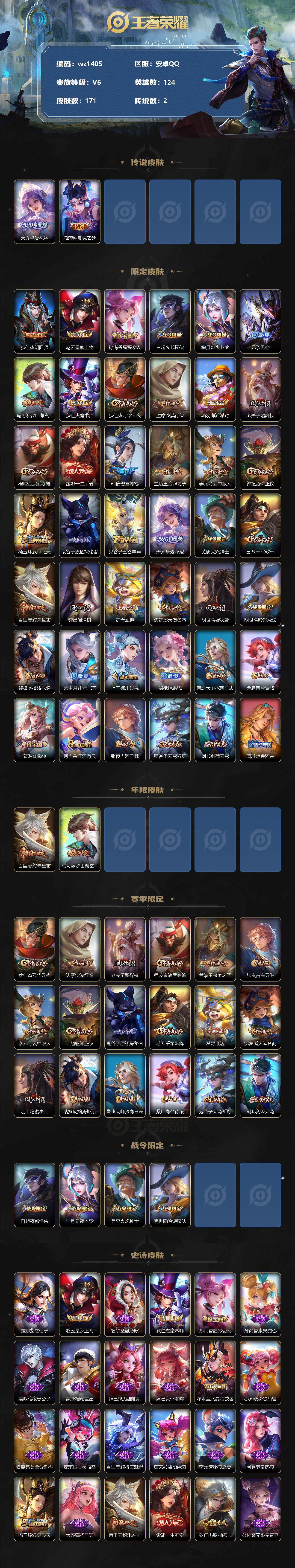 【游戏多多】【王者荣耀】【编号:3339519】【可二次实名】【wz1405】【商品标题】:安卓Q-V6-永恒钻石V段位-124英雄-171皮肤-0典藏-0珍品无双-0无双-0珍品传说-2传说-41史诗 【传说皮肤】:大乔挚爱花嫁,貂蝉仲夏夜之梦 【限定皮肤】:狄仁杰阴阳师,赵云皇家上将,孙尚香蔷薇恋人,白起夜都怪侠,芈月幻夜卜梦,元歌无心,马可波罗山海玄木吟,狄仁杰魔术师,狄仁杰万华元夜,达摩沙漠行僧,项羽海滩派对,老夫子醍醐杖,程咬金演武夺筹,露娜一生所爱,韩信傲雪梅枪,兰陵王金庭之子,李元芳云中旅人,钟馗驱傩正仪,杨玉环遇见飞天,鬼谷子原初探秘者,鬼谷子五谷丰年,大乔挚爱花嫁,黄忠火炮绅士,苏烈千军破阵,百里守约朱雀志,弈星混沌棋,梦奇顽趣,沈梦溪大漠名商,明世隐疑决卦,明世隐吟游魔法,裴擒虎擒涛扼浪,云中君纤云弄巧,上官婉儿梁祝,嫦娥拒霜思,鲁班大师探海日志,桑启海盐诗旅,艾琳女武神,阿古朵江河有灵,张良古海寻踪,鬼谷子天穹祈灯,刘邦剑破天穹,周瑜熔金海岸 【年限皮肤】:百里守约朱雀志,马可波罗山海玄木吟 【赛季限定】:狄仁杰万华元夜,达摩沙漠行僧,老夫子醍醐杖,程咬金演武夺筹,兰陵王金庭之子,张良古海寻踪,李元芳云中旅人,钟馗驱傩正仪,鬼谷子原初探秘者,苏烈千军破阵,弈星混沌棋,梦奇顽趣,沈梦溪大漠名商,明世隐疑决卦,裴擒虎擒涛扼浪,鲁班大师探海日志,桑启海盐诗旅,鬼谷子天穹祈灯,刘邦剑破天穹 【战令限定】:白起夜都怪侠,芈月幻夜卜梦,黄忠火炮绅士,明世隐吟游魔法 【史诗皮肤】:露娜紫霞仙子,赵云皇家上将,貂蝉圣诞恋歌,狄仁杰魔术师,孙尚香蔷薇恋人,孙尚香水果甜心,嬴政暗夜贵公子,嬴政摇滚巨星,妲己魅力维加斯,妲己女仆咖啡,花木兰水晶猎龙者,小乔缤纷独角兽,诸葛亮黄金分割率,安琪拉心灵骇客,百里守约特工魅影,蔡文姬舞动绿茵,李元芳逐浪之夏,阿轲节奏热浪,杨玉环遇见飞天,大乔猫狗日记,百里守约朱雀志,露娜一生所爱,狄仁杰鹰眼统帅,公孙离无限星赏官,上官婉儿梁祝,小乔青蛇,不知火舞魅语,瑶遇见神鹿,孙尚香时之恋人,云中君纤云弄巧,嫦娥拒霜思,黄忠火炮绅士,韩信傲雪梅枪,艾琳奇遇舞章,明世隐吟游魔法,貂蝉唤灵魅影,鬼谷子五谷丰年,元歌无心,梦奇顽趣,马可波罗山海玄木吟,阿古朵江河有灵 【其他皮肤】:项羽海滩派对,韩信教廷特使,艾琳女武神,牛魔西部大镖客,扁鹊化身博士,扁鹊救世之瞳,安琪拉玩偶对对碰,孙膑天使之翼,姜子牙时尚教父,妲己少女阿狸,亚瑟死亡骑士,达摩拳王,花木兰兔女郎,甄姬花好人间,后羿阿尔法小队,狄仁杰阴阳师,刘备纽约教父,钟无艳海滩丽影,王昭君幻想奇妙夜,老夫子功夫老勺,牛魔制霸全明星,李白敏锐之力,鬼谷子幻乐之宴,大乔守护之力,项羽科学大爆炸,明世隐虹云星官,庄周奇妙博物学,小乔丁香结,吕布野性能量,孙膑归虚梦演,沈梦溪鲨炮海盗猫,姜子牙炽热元素使,弈星混沌棋,哪吒次元突破,鲁班七号黑桃队长,明世隐疑决卦,老夫子醍醐杖,鬼谷子原初探秘者,狄仁杰万华元夜,刘禅秘密基地,杨戬次元傲视,露娜瓷语鉴心,程咬金演武夺筹,张良缤纷绘卷,盘古重装意志,钟馗驱傩正仪,鲁班大师乓乓大师,苏烈千军破阵,典韦铁甲之心,妲己紫罗兰之誓,达摩沙漠行僧,芈月幻夜卜梦,程咬金无双福将,刘邦虎啸剑宗,白起夜都怪侠,兰陵王金庭之子,刘禅唤灵魔甲,米莱狄契约魔法,沈梦溪大漠名商,蒙犽胡桃狂想曲,蒙恬蔚蓝守将,李元芳云中旅人,桑启海盐诗旅,海月幻泉雾影,猪八戒潮玩探月行,裴擒虎擒涛扼浪,太乙真人劲辣红锅,鲁班大师探海日志,张良古海寻踪,后羿完美运算,鬼谷子天穹祈灯,廉颇功夫炙烤,刘邦剑破天穹,周瑜熔金海岸,东皇太一噬灭天穹,少司缘灵卦秘语,甄姬逆浪荇歌,云中君云械蓝图,高渐离金属狂潮,貂蝉异域舞娘,老夫子潮流仙人,王昭君精灵公主,小乔万圣前夜,孙膑未来旅行,孙悟空西部大镖客,周瑜海军大将,后羿精灵王,兰陵王隐刃,李白范海辛,李元芳特种部队,刘邦圣殿之光,虞姬加勒比小姐,蔡文姬蔷薇王座,马可波罗激情绿茵,太乙真人圆桌骑士,哪吒三太子,大乔伊势巫女,干将莫邪第七人偶,铠龙域领主,百里守约绝影神枪,百里玄策威尼斯狂欢,梦奇美梦成真,明世隐占星师,公孙离花间舞,杨玉环霓裳曲,裴擒虎街头旋风,弈星踏雪寻梅,元歌午夜歌剧院,孙策海之征途,司马懿魇语军师,盾山极冰防御线,伽罗花见巫女,沈梦溪棒球奇才,李信灼热之刃,上官婉儿修竹墨客,嫦娥露花倒影,瑶森,云中君荷鲁斯之眼,曜归虚梦演,马超幸存者,西施归虚梦演,镜冰刃幻境,蒙恬秩序猎龙将,澜孤猎,司空震启蛰,云缨赤焰之缨,暃碧珀绯影,桑启画中游 【内测皮肤】:孙尚香蔷薇恋人,艾琳女武神 【营地ID】:1830799814
