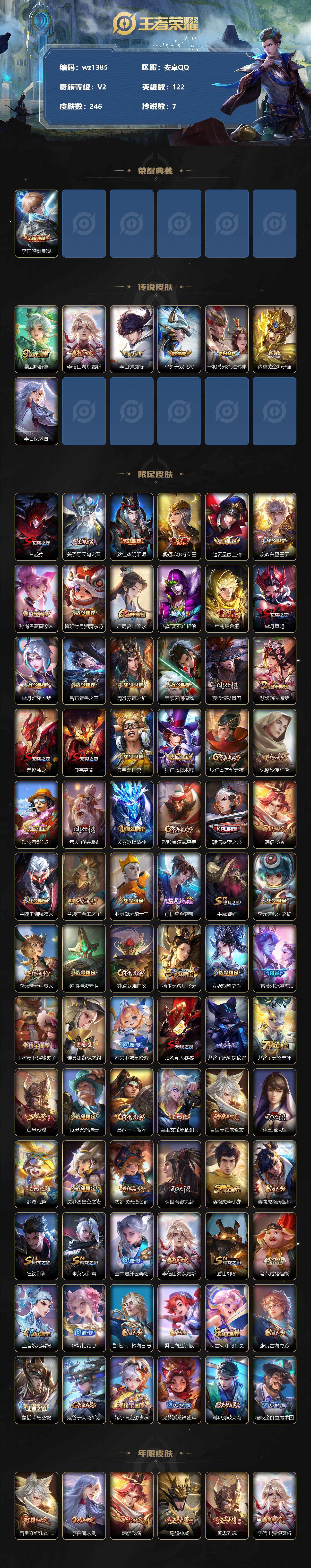 【游戏多多】【王者荣耀】【编号:3339523】【可二次实名】【wz1385】【商品标题】:安卓Q-V2-永恒钻石I段位-122英雄-246皮肤-1典藏-0珍品无双-0无双-0珍品传说-7传说-68史诗 【荣耀典藏】:李白鸣剑曳影 【传说皮肤】:桑启鸣野蒿,李信山海炽霜斩,李白诗剑行,马超无双飞将,干将莫邪久胜战神,达摩黄金狮子座,李白凤求凰 【限定皮肤】:白起狰,姜子牙天穹之誓,狄仁杰阴阳师,虞姬凯尔特女王,赵云皇家上将,嬴政白昼王子,孙尚香蔷薇恋人,鲁班七号狮舞东方,庄周高山流水,高渐离死亡摇滚,扁鹊炼金王,芈月重明,芈月幻夜卜梦,吕布猎兽之王,周瑜赤莲之焰,元歌云间偶戏,夏侯惇朔风刀,甄姬游园惊梦,曹操烛龙,典韦穷奇,典韦蓝屏警告,狄仁杰魔术师,狄仁杰万华元夜,达摩沙漠行僧,项羽海滩派对,老夫子醍醐杖,关羽冰锋战神,程咬金演武夺筹,韩信逐梦之影,韩信飞衡,兰陵王驯魔猎人,兰陵王金庭之子,亚瑟潮玩骑士王,孙悟空至尊宝,牛魔御旌,李元芳银河之约,李元芳云中旅人,钟馗神迹守卫,钟馗驱傩正仪,杨玉环遇见飞天,女娲朔望之晖,干将莫邪冰霜恋舞曲,干将莫邪胡桃夹子,雅典娜黎明之约,蔡文姬繁星吟游,太乙真人饕餮,鬼谷子原初探秘者,鬼谷子五谷丰年,黄忠烈魂,黄忠火炮绅士,苏烈千军破阵,百里玄策原初追逐者,百里守约朱雀志,弈星混沌棋,梦奇顽趣,沈梦溪星空之诺,沈梦溪大漠名商,明世隐疑决卦,裴擒虎李小龙,裴擒虎擒涛扼浪,狂铁御狮,米莱狄御霄,云中君纤云弄巧,李信山海炽霜斩,盾山御銮,猪八戒猪悟能,上官婉儿梁祝,嫦娥拒霜思,鲁班大师探海日志,桑启海盐诗旅,阿古朵江河有灵,张良古海寻踪,蒙恬荣光圣徽,鬼谷子天穹祈灯,姬小满妄想食味,沈梦溪龙舞盛年,刘邦剑破天穹,程咬金群星魔术团 【年限皮肤】:百里守约朱雀志,李白凤求凰,韩信飞衡,马超神威,黄忠烈魂,李信山海炽霜斩 【赛季限定】:扁鹊炼金王,白起狰,芈月重明,夏侯惇朔风刀,曹操烛龙,典韦穷奇,狄仁杰万华元夜,达摩沙漠行僧,老夫子醍醐杖,程咬金演武夺筹,兰陵王金庭之子,张良古海寻踪,牛魔御旌,李元芳云中旅人,虞姬凯尔特女王,钟馗驱傩正仪,雅典娜黎明之约,太乙真人饕餮,鬼谷子原初探秘者,苏烈千军破阵,百里玄策原初追逐者,弈星混沌棋,梦奇顽趣,沈梦溪大漠名商,明世隐疑决卦,裴擒虎擒涛扼浪,狂铁御狮,米莱狄御霄,盾山御銮,鲁班大师探海日志,桑启海盐诗旅,鬼谷子天穹祈灯,蒙恬荣光圣徽,刘邦剑破天穹,姜子牙天穹之誓 【战令限定】:嬴政白昼王子,鲁班七号狮舞东方,芈月幻夜卜梦,吕布猎兽之王,周瑜赤莲之焰,元歌云间偶戏,典韦蓝屏警告,兰陵王驯魔猎人,亚瑟潮玩骑士王,李元芳银河之约,钟馗神迹守卫,女娲朔望之晖,黄忠火炮绅士,沈梦溪星空之诺 【史诗皮肤】:鲁班七号电玩小子,阿轲暗夜猫娘,赵云皇家上将,赵云未来纪元,甄姬冰雪圆舞曲,王昭君偶像歌手,狄仁杰魔术师,廉颇地狱岩魂,宫本武藏鬼剑武藏,孙尚香蔷薇恋人,孙尚香水果甜心,嬴政摇滚巨星,妲己魅力维加斯,妲己女仆咖啡,墨子金属风暴,吕布圣诞狂欢,刘禅绅士熊喵,李白千年之狐,吕布末日机甲,张飞乱世虎臣,韩信白龙吟,关羽冰锋战神,孙悟空至尊宝,花木兰水晶猎龙者,刘邦德古拉伯爵,韩信逐梦之影,夏侯惇乘风破浪,小乔缤纷独角兽,兰陵王暗隐猎兽者,诸葛亮黄金分割率,甄姬游园惊梦,亚瑟心灵战警,雅典娜冰冠公主,安琪拉心灵骇客,百里守约特工魅影,刘禅天才门将,李元芳逐浪之夏,白起星夜王子,杨玉环遇见飞天,嬴政白昼王子,孙策猫狗日记,百里守约朱雀志,干将莫邪冰霜恋舞曲,典韦蓝屏警告,鲁班七号狮舞东方,狄仁杰鹰眼统帅,兰陵王驯魔猎人,上官婉儿梁祝,蔡文姬繁星吟游,李元芳银河之约,韩信飞衡,橘右京修罗,马超神威,黄忠烈魂,百里玄策原初追逐者,裴擒虎李小龙,云中君纤云弄巧,元歌云间偶戏,猪八戒猪悟能,庄周高山流水,嫦娥拒霜思,黄忠火炮绅士,雅典娜黎明之约,鬼谷子五谷丰年,梦奇顽趣,阿古朵江河有灵,蒙恬荣光圣徽,姬小满妄想食味 【其他皮肤】:项羽海滩派对,韩信教廷特使,韩信街头霸王,露娜哥特玫瑰,达摩大发明家,赵云白执事,赵云忍炎影,程咬金爱与正义,牛魔西部大镖客,扁鹊化身博士,扁鹊救世之瞳,姜子牙时尚教父,妲己少女阿狸,典韦黄金武士,亚瑟死亡骑士,达摩拳王,花木兰兔女郎,张飞五福同心,甄姬花好人间,刘备万事如意,宫本武藏万象初新,后羿阿尔法小队,狄仁杰阴阳师,刘备纽约教父,高渐离死亡摇滚,刘备汉昭烈帝,扁鹊炼金王,关羽龙腾万里,虞姬凯尔特女王,墨子进击墨子号,白起狰,钟无艳海滩丽影,太乙真人饕餮,宫本武藏霸王丸,曹操烛龙,王昭君幻想奇妙夜,芈月重明,老夫子功夫老勺,牛魔制霸全明星,孙尚香沉稳之力,典韦穷奇,诸葛亮掌控之力,李白敏锐之力,鬼谷子幻乐之宴,狂铁御狮,苏烈坚韧之力,大乔守护之力,米莱狄御霄,吕布猎兽之王,明世隐虹云星官,张良幽兰居士,庄周奇