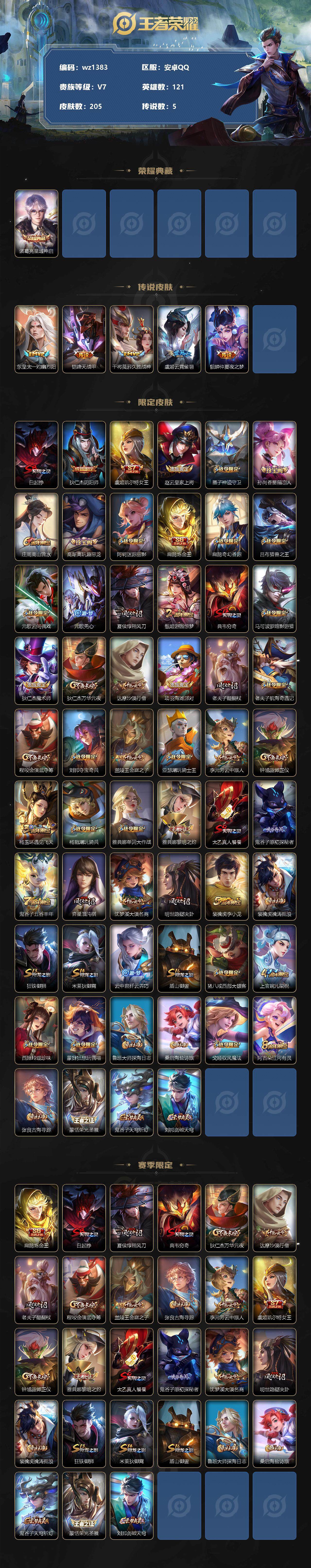【游戏多多】【王者荣耀】【编号:3339524】【可二次实名】【wz1383】【商品标题】:安卓Q-V7-最强王者段位-121英雄-205皮肤-1典藏-0珍品无双-0无双-0珍品传说-5传说-49史诗 【荣耀典藏】:诸葛亮星域神启 【传说皮肤】:东皇太一灼幽烈阳,铠绛天战甲,干将莫邪久胜战神,虞姬云霓雀翎,貂蝉仲夏夜之梦 【限定皮肤】:白起狰,狄仁杰阴阳师,虞姬凯尔特女王,赵云皇家上将,墨子神迹守卫,孙尚香蔷薇恋人,庄周高山流水,高渐离玩趣恶龙,阿轲迷踪丽影,扁鹊炼金王,扁鹊奇幻香踪,吕布猎兽之王,元歌云间偶戏,元歌无心,夏侯惇朔风刀,甄姬游园惊梦,典韦穷奇,马可波罗暗影游猎,狄仁杰魔术师,狄仁杰万华元夜,达摩沙漠行僧,项羽海滩派对,老夫子醍醐杖,老夫子航海奇遇记,程咬金演武夺筹,刘邦夺宝奇兵,兰陵王金庭之子,亚瑟潮玩骑士王,李元芳云中旅人,钟馗驱傩正仪,杨玉环遇见飞天,杨戬潮玩骑兵,雅典娜单词大作战,雅典娜黎明之约,太乙真人饕餮,鬼谷子原初探秘者,鬼谷子五谷丰年,弈星混沌棋,沈梦溪大漠名商,明世隐疑决卦,裴擒虎李小龙,裴擒虎擒涛扼浪,狂铁御狮,米莱狄御霄,云中君纤云弄巧,盾山御銮,猪八戒西部大镖客,上官婉儿梁祝,西施玲珑珍味,蒙犽狂想玩偶喵,鲁班大师探海日志,桑启海盐诗旅,戈娅驭风魔法,阿古朵江河有灵,张良古海寻踪,蒙恬荣光圣徽,鬼谷子天穹祈灯,刘邦剑破天穹 【赛季限定】:扁鹊炼金王,白起狰,夏侯惇朔风刀,典韦穷奇,狄仁杰万华元夜,达摩沙漠行僧,老夫子醍醐杖,程咬金演武夺筹,兰陵王金庭之子,张良古海寻踪,李元芳云中旅人,虞姬凯尔特女王,钟馗驱傩正仪,雅典娜黎明之约,太乙真人饕餮,鬼谷子原初探秘者,弈星混沌棋,沈梦溪大漠名商,明世隐疑决卦,裴擒虎擒涛扼浪,狂铁御狮,米莱狄御霄,盾山御銮,鲁班大师探海日志,桑启海盐诗旅,鬼谷子天穹祈灯,蒙恬荣光圣徽,刘邦剑破天穹 【战令限定】:墨子神迹守卫,阿轲迷踪丽影,扁鹊奇幻香踪,吕布猎兽之王,元歌云间偶戏,马可波罗暗影游猎,老夫子航海奇遇记,刘邦夺宝奇兵,亚瑟潮玩骑士王,杨戬潮玩骑兵,雅典娜单词大作战,猪八戒西部大镖客,西施玲珑珍味,蒙犽狂想玩偶喵,戈娅驭风魔法 【史诗皮肤】:鲁班七号电玩小子,项羽苍穹之光,露娜紫霞仙子,赵云皇家上将,貂蝉圣诞恋歌,甄姬冰雪圆舞曲,王昭君偶像歌手,狄仁杰魔术师,宫本武藏鬼剑武藏,孙尚香蔷薇恋人,孙尚香水果甜心,嬴政摇滚巨星,妲己魅力维加斯,妲己女仆咖啡,墨子龙骑士,墨子金属风暴,张飞乱世虎臣,夏侯惇乘风破浪,小乔缤纷独角兽,兰陵王暗隐猎兽者,甄姬游园惊梦,雅典娜冰冠公主,刘禅天才门将,李元芳逐浪之夏,程咬金功夫厨神,白起星夜王子,杨玉环遇见飞天,孙策猫狗日记,狄仁杰鹰眼统帅,上官婉儿梁祝,不知火舞魅语,阿轲迷踪丽影,瑶遇见神鹿,马可波罗暗影游猎,蒙犽狂想玩偶喵,裴擒虎李小龙,云中君纤云弄巧,元歌云间偶戏,老夫子航海奇遇记,庄周高山流水,雅典娜黎明之约,鬼谷子五谷丰年,元歌无心,扁鹊奇幻香踪,戈娅驭风魔法,莱西奥末日机甲,阿古朵江河有灵,蒙恬荣光圣徽,黄忠百相守梦 【其他皮肤】:项羽海滩派对,韩信教廷特使,韩信街头霸王,露娜哥特玫瑰,达摩大发明家,赵云忍炎影,白起白色死神,牛魔西部大镖客,扁鹊化身博士,宫本武藏未来纪元,安琪拉玩偶对对碰,孙膑天使之翼,姜子牙时尚教父,妲己少女阿狸,典韦黄金武士,亚瑟死亡骑士,达摩拳王,花木兰兔女郎,张飞五福同心,甄姬花好人间,刘备万事如意,宫本武藏万象初新,狄仁杰阴阳师,刘备纽约教父,刘备汉昭烈帝,扁鹊炼金王,关羽龙腾万里,虞姬凯尔特女王,墨子进击墨子号,白起狰,钟无艳海滩丽影,太乙真人饕餮,宫本武藏霸王丸,王昭君幻想奇妙夜,老夫子功夫老勺,牛魔制霸全明星,典韦穷奇,诸葛亮掌控之力,李白敏锐之力,鬼谷子幻乐之宴,狂铁御狮,大乔守护之力,项羽科学大爆炸,米莱狄御霄,吕布猎兽之王,明世隐虹云星官,小乔丁香结,吕布野性能量,盾山御銮,孙膑归虚梦演,高渐离玩趣恶龙,沈梦溪鲨炮海盗猫,姜子牙炽热元素使,夏侯惇朔风刀,弈星混沌棋,哪吒次元突破,明世隐疑决卦,刘邦夺宝奇兵,盾山圆桌骑士,老夫子醍醐杖,猪八戒西部大镖客,狂铁特工战影,廉颇无尽征程,鬼谷子原初探秘者,雅典娜单词大作战,狄仁杰万华元夜,亚瑟潮玩骑士王,刘禅秘密基地,杨戬次元傲视,露娜瓷语鉴心,程咬金演武夺筹,张良缤纷绘卷,盘古重装意志,钟馗驱傩正仪,墨子神迹守卫,鲁班大师乓乓大师,达摩沙漠行僧,程咬金无双福将,刘邦虎啸剑宗,兰陵王金庭之子,沈梦溪大漠名商,蒙恬蔚蓝守将,李元芳云中旅人,桑启海盐诗旅,猪八戒潮玩探月行,白起乐园追猎者,赵怀真太极少年,裴擒虎擒涛扼浪,杨戬潮玩骑兵,太乙真人劲辣红锅,莱西奥西部游侠,鲁班大师探海日志,西施玲珑珍味,姬小满零食大作战,李元芳妄想特派,哪吒热血海滩,张良古海寻踪,钟无艳聚星闪耀,亚连破局者,鬼谷