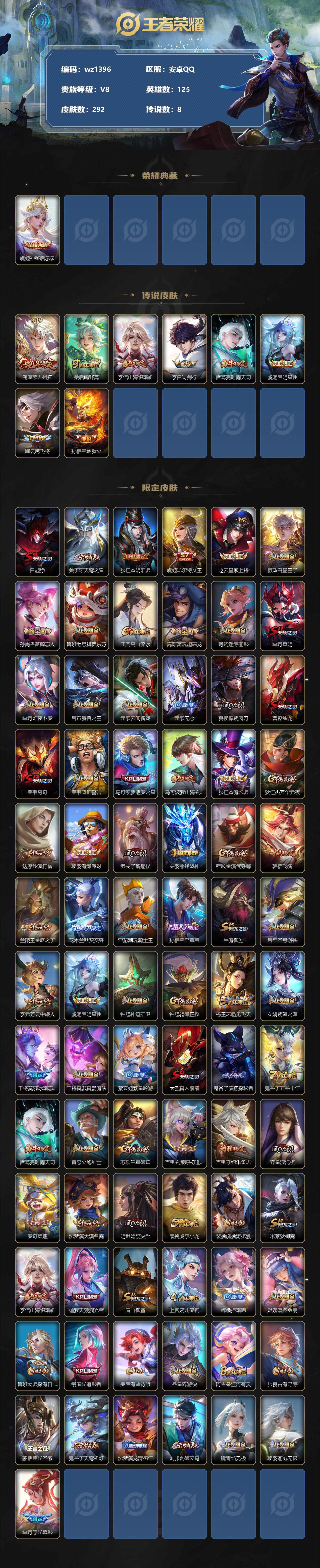 【游戏多多】【王者荣耀】【编号:3339526】【可二次实名】【wz1396】【商品标题】:安卓Q-V8-至尊星耀I段位-125英雄-292皮肤-1典藏-0珍品无双-0无双-0珍品传说-8传说-92史诗 【荣耀典藏】:虞姬神鉴启示录 【传说皮肤】:澜愿照九州拓,桑启鸣野蒿,李信山海炽霜斩,李白诗剑行,诸葛亮时雨天司,虞姬启明星使,曜云鹰飞将,孙悟空地狱火 【限定皮肤】:白起狰,姜子牙天穹之誓,狄仁杰阴阳师,虞姬凯尔特女王,赵云皇家上将,嬴政白昼王子,孙尚香蔷薇恋人,鲁班七号狮舞东方,庄周高山流水,高渐离玩趣恶龙,阿轲迷踪丽影,芈月重明,芈月幻夜卜梦,吕布猎兽之王,元歌云间偶戏,元歌无心,夏侯惇朔风刀,曹操烛龙,典韦穷奇,典韦蓝屏警告,马可波罗逐梦之星,马可波罗山海玄木吟,狄仁杰魔术师,狄仁杰万华元夜,达摩沙漠行僧,项羽海滩派对,老夫子醍醐杖,关羽冰锋战神,程咬金演武夺筹,韩信飞衡,兰陵王金庭之子,花木兰默契交锋,亚瑟潮玩骑士王,孙悟空至尊宝,牛魔御旌,后羿圣弓游侠,李元芳云中旅人,虞姬启明星使,钟馗神迹守卫,钟馗驱傩正仪,杨玉环遇见飞天,女娲朔望之晖,干将莫邪冰霜恋舞曲,干将莫邪真爱魔法,蔡文姬繁星吟游,太乙真人饕餮,鬼谷子原初探秘者,鬼谷子五谷丰年,诸葛亮时雨天司,黄忠火炮绅士,苏烈千军破阵,百里玄策原初追逐者,百里守约朱雀志,弈星混沌棋,梦奇顽趣,沈梦溪大漠名商,明世隐疑决卦,裴擒虎李小龙,裴擒虎擒涛扼浪,米莱狄御霄,李信山海炽霜斩,伽罗天狼溯光者,盾山御銮,上官婉儿梁祝,嫦娥拒霜思,嫦娥暖冬兔眠,鲁班大师探海日志,镜匿光追影者,桑启海盐诗旅,暃星界游侠,阿古朵江河有灵,张良古海寻踪,蒙恬荣光圣徽,鬼谷子天穹祈灯,沈梦溪龙舞盛年,刘邦剑破天穹,镜青焰无极,项羽苍威无极,芈月浮光幕影 【年限皮肤】:百里守约朱雀志,诸葛亮时雨天司,韩信飞衡,马超神威,马可波罗山海玄木吟,李信山海炽霜斩 【赛季限定】:白起狰,芈月重明,夏侯惇朔风刀,曹操烛龙,典韦穷奇,狄仁杰万华元夜,达摩沙漠行僧,老夫子醍醐杖,程咬金演武夺筹,兰陵王金庭之子,张良古海寻踪,牛魔御旌,李元芳云中旅人,虞姬凯尔特女王,钟馗驱傩正仪,太乙真人饕餮,鬼谷子原初探秘者,苏烈千军破阵,百里玄策原初追逐者,弈星混沌棋,梦奇顽趣,沈梦溪大漠名商,明世隐疑决卦,裴擒虎擒涛扼浪,米莱狄御霄,盾山御銮,鲁班大师探海日志,桑启海盐诗旅,鬼谷子天穹祈灯,蒙恬荣光圣徽,刘邦剑破天穹,姜子牙天穹之誓 【战令限定】:嬴政白昼王子,鲁班七号狮舞东方,阿轲迷踪丽影,芈月幻夜卜梦,吕布猎兽之王,元歌云间偶戏,典韦蓝屏警告,亚瑟潮玩骑士王,后羿圣弓游侠,钟馗神迹守卫,女娲朔望之晖,干将莫邪真爱魔法,黄忠火炮绅士,嫦娥暖冬兔眠,暃星界游侠,镜青焰无极,项羽苍威无极 【史诗皮肤】:鲁班七号电玩小子,露娜紫霞仙子,赵云皇家上将,赵云未来纪元,貂蝉圣诞恋歌,甄姬冰雪圆舞曲,王昭君偶像歌手,狄仁杰魔术师,廉颇地狱岩魂,宫本武藏鬼剑武藏,孙尚香蔷薇恋人,孙尚香水果甜心,嬴政暗夜贵公子,嬴政摇滚巨星,妲己魅力维加斯,妲己女仆咖啡,墨子龙骑士,墨子金属风暴,吕布圣诞狂欢,刘禅绅士熊喵,曹操幽灵船长,李白千年之狐,吕布末日机甲,张飞乱世虎臣,韩信白龙吟,关羽冰锋战神,孙悟空至尊宝,花木兰水晶猎龙者,刘邦德古拉伯爵,夏侯惇乘风破浪,小乔缤纷独角兽,兰陵王暗隐猎兽者,诸葛亮黄金分割率,马可波罗逐梦之星,亚瑟心灵战警,安琪拉心灵骇客,百里守约特工魅影,铠曙光守护者,蔡文姬舞动绿茵,刘禅天才门将,李元芳逐浪之夏,程咬金功夫厨神,白起星夜王子,阿轲节奏热浪,杨玉环遇见飞天,嬴政白昼王子,孙策猫狗日记,大乔猫狗日记,百里守约朱雀志,干将莫邪冰霜恋舞曲,典韦蓝屏警告,伽罗箭羽风息,鲁班七号狮舞东方,狄仁杰鹰眼统帅,上官婉儿梁祝,蔡文姬繁星吟游,韩信飞衡,大乔白蛇,不知火舞魅语,阿轲迷踪丽影,橘右京修罗,马超神威,百里玄策原初追逐者,裴擒虎李小龙,元歌云间偶戏,花木兰默契交锋,伽罗天狼溯光者,杨戬天秀启明,干将莫邪真爱魔法,沈梦溪月团寄思,钟馗乐园奇幻夜,庄周高山流水,嫦娥拒霜思,镜匿光追影者,黄忠火炮绅士,鬼谷子五谷丰年,元歌无心,梦奇顽趣,暃星界游侠,马可波罗山海玄木吟,阿古朵江河有灵,蒙恬荣光圣徽,镜青焰无极,黄忠怒海争锋,芈月浮光幕影,亚连破空之剑,百里守约百相守梦,孙膑茶境仙,弈星万物之道,赵怀真器灵浮梦炉,刘禅鸭鸭历险记,扁鹊灵蛊蚀心 【其他皮肤】:项羽海滩派对,韩信教廷特使,韩信街头霸王,露娜哥特玫瑰,阿轲致命风华,达摩大发明家,赵云白执事,赵云忍炎影,芈月红桃皇后,牛魔西部大镖客,扁鹊化身博士,宫本武藏未来纪元,安琪拉玩偶对对碰,孙膑天使之翼,姜子牙时尚教父,妲己少女阿狸,典韦黄金武士,亚瑟死亡骑士,达摩拳王,花木兰兔女郎,甄姬花好人间,刘备万事如意,后羿阿尔法小队,狄仁杰