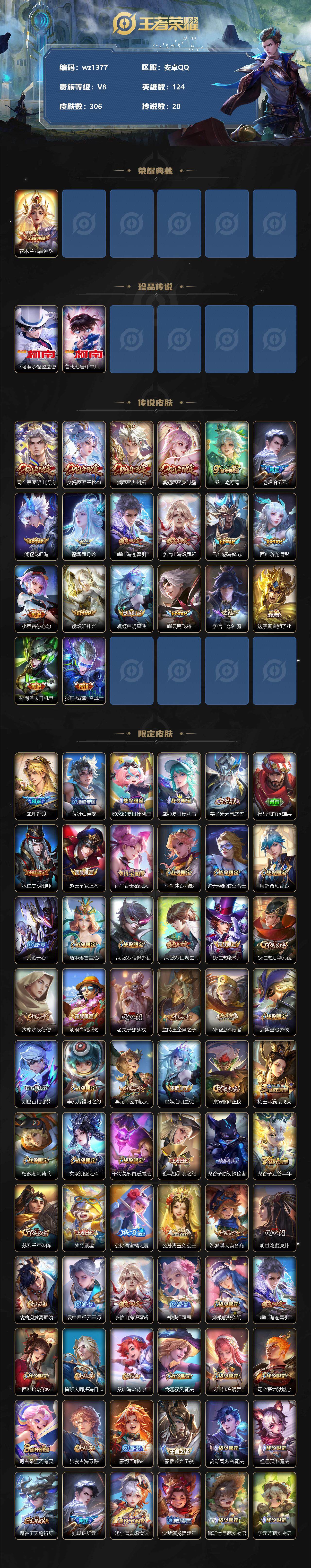 【游戏多多】【王者荣耀】【编号:3339535】【可二次实名】【wz1377】【商品标题】:安卓Q-V8-至尊星耀IV段位-124英雄-306皮肤-1典藏-0珍品无双-0无双-2珍品传说-20传说-80史诗 【荣耀典藏】:花木兰九霄神辉 【珍品传说】:马可波罗怪盗基德,鲁班七号江户川柯南 【传说皮肤】:司空震愿照山河定,女娲愿照千秋盛,澜愿照九州拓,虞姬愿照岁时盈,桑启鸣野蒿,铠琥珀纪元,澜逐花归海,露娜霜月吟,曜山海苍雷引,李信山海炽霜斩,吕布怒海麟威,西施游龙清影,小乔音你心动,镜炽阳神光,虞姬启明星使,曜云鹰飞将,李信一念神魔,达摩黄金狮子座,孙尚香末日机甲,狄仁杰超时空战士 【限定皮肤】:暃埋骨钱,蒙犽顽岩魄,蔡文姬夏日便利店,虞姬夏日便利店,姜子牙天穹之誓,杨戬破阵退雄兵,狄仁杰阴阳师,赵云皇家上将,孙尚香蔷薇恋人,阿轲迷踪丽影,钟无艳超时空战士,扁鹊奇幻香踪,元歌无心,甄姬落雪兰心,马可波罗暗影游猎,马可波罗山海玄木吟,狄仁杰魔术师,狄仁杰万华元夜,达摩沙漠行僧,项羽海滩派对,老夫子醍醐杖,兰陵王金庭之子,孙悟空孙行者,后羿圣弓游侠,刘备百相守梦,李元芳银河之约,李元芳云中旅人,虞姬启明星使,钟馗驱傩正仪,杨玉环遇见飞天,杨戬潮玩骑兵,女娲朔望之晖,干将莫邪真爱魔法,雅典娜黎明之约,鬼谷子原初探秘者,鬼谷子五谷丰年,苏烈千军破阵,梦奇顽趣,公孙离蜜橘之夏,公孙离玉兔公主,沈梦溪大漠名商,明世隐疑决卦,裴擒虎擒涛扼浪,云中君纤云弄巧,李信山海炽霜斩,嫦娥拒霜思,嫦娥暖冬兔眠,曜山海苍雷引,西施玲珑珍味,鲁班大师探海日志,桑启海盐诗旅,戈娅驭风魔法,艾琳流音漫舞,司空震地狱燃心,阿古朵江河有灵,张良古海寻踪,蒙犽百解令,蒙恬荣光圣徽,高渐离燃音魔法,妲己灵卜魔法,鬼谷子天穹祈灯,铠琥珀纪元,姬小满妄想食味,沈梦溪龙舞盛年,鲁班七号蔬乡物语,李元芳蔬乡物语,刘邦剑破天穹,程咬金群星魔术团,周瑜熔金海岸 【年限皮肤】:马可波罗山海玄木吟,李信山海炽霜斩,曜山海苍雷引 【赛季限定】:狄仁杰万华元夜,达摩沙漠行僧,老夫子醍醐杖,兰陵王金庭之子,张良古海寻踪,李元芳云中旅人,钟馗驱傩正仪,雅典娜黎明之约,鬼谷子原初探秘者,苏烈千军破阵,梦奇顽趣,沈梦溪大漠名商,明世隐疑决卦,裴擒虎擒涛扼浪,鲁班大师探海日志,桑启海盐诗旅,鬼谷子天穹祈灯,蒙恬荣光圣徽,刘邦剑破天穹,姜子牙天穹之誓 【战令限定】:蔡文姬夏日便利店,虞姬夏日便利店,阿轲迷踪丽影,钟无艳超时空战士,扁鹊奇幻香踪,甄姬落雪兰心,马可波罗暗影游猎,艾琳流音漫舞,后羿圣弓游侠,李元芳银河之约,杨戬潮玩骑兵,女娲朔望之晖,干将莫邪真爱魔法,嫦娥暖冬兔眠,西施玲珑珍味,司空震地狱燃心,戈娅驭风魔法,高渐离燃音魔法,妲己灵卜魔法,鲁班七号蔬乡物语,李元芳蔬乡物语 【史诗皮肤】:露娜紫霞仙子,阿轲暗夜猫娘,赵云皇家上将,赵云未来纪元,貂蝉圣诞恋歌,甄姬冰雪圆舞曲,王昭君偶像歌手,狄仁杰魔术师,廉颇地狱岩魂,宫本武藏鬼剑武藏,孙尚香蔷薇恋人,孙尚香水果甜心,嬴政摇滚巨星,妲己魅力维加斯,妲己女仆咖啡,墨子金属风暴,吕布末日机甲,张飞乱世虎臣,花木兰水晶猎龙者,夏侯惇乘风破浪,小乔缤纷独角兽,诸葛亮黄金分割率,亚瑟心灵战警,百里守约特工魅影,刘禅天才门将,公孙离蜜橘之夏,李元芳逐浪之夏,白起星夜王子,杨玉环遇见飞天,孙策猫狗日记,大乔猫狗日记,伽罗箭羽风息,狄仁杰鹰眼统帅,李元芳银河之约,娜可露露晚萤,不知火舞魅语,阿轲迷踪丽影,橘右京修罗,马可波罗暗影游猎,云中君纤云弄巧,杨戬天秀启明,干将莫邪真爱魔法,孙悟空孙行者,司马懿暗渊魔法,嫦娥拒霜思,雅典娜黎明之约,夏洛特永昼,公孙离玉兔公主,钟无艳超时空战士,弈星滕王阁序,鬼谷子五谷丰年,元歌无心,梦奇顽趣,马可波罗山海玄木吟,扁鹊奇幻香踪,刘备百相守梦,刘禅电玩爆裂旋风,戈娅驭风魔法,司空震地狱燃心,阿古朵江河有灵,蒙犽百解令,周瑜雪夜绮愿,妲己灵卜魔法,高渐离燃音魔法,蒙恬荣光圣徽,姬小满妄想食味,鲁班七号蔬乡物语,蔡文姬夏日便利店,蒙犽顽岩魄,暃埋骨钱,大司命东方月初,亚连破空之剑,百里守约百相守梦,牛魔星界战将,孙膑茶境仙,弈星万物之道,苍狼魂孤将,阿轲化蝶舞,刘禅鸭鸭历险记,狂铁龙之律动,黄忠百相守梦 【其他皮肤】:项羽海滩派对,韩信教廷特使,韩信街头霸王,露娜哥特玫瑰,达摩大发明家,赵云白执事,赵云忍炎影,芈月红桃皇后,程咬金星际陆战队,白起白色死神,牛魔西部大镖客,扁鹊化身博士,宫本武藏未来纪元,安琪拉玩偶对对碰,孙膑天使之翼,姜子牙时尚教父,典韦黄金武士,亚瑟死亡骑士,达摩拳王,花木兰兔女郎,张飞五福同心,甄姬花好人间,刘备万事如意,宫本武藏万象初新,后羿阿尔法小队,狄仁杰阴阳师,刘备纽约教父,刘备汉昭烈帝,关羽龙腾万里,钟无艳海滩丽影,王昭君幻想奇妙夜,狂铁命运角斗场,老夫子