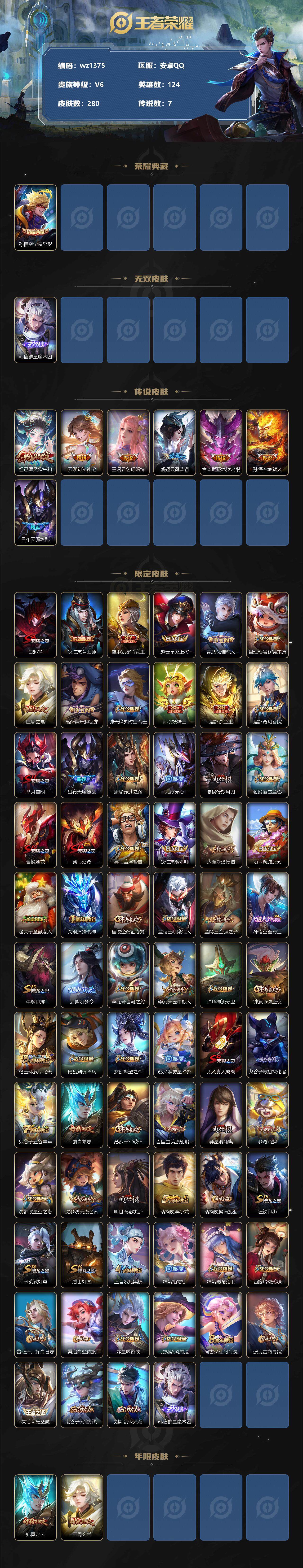 【游戏多多】【王者荣耀】【编号:3339541】【可二次实名】【wz1375】【商品标题】:安卓Q-V6-至尊星耀III段位-124英雄-280皮肤-1典藏-0珍品无双-1无双-0珍品传说-7传说-65史诗 【荣耀典藏】:孙悟空全息碎影 【无双皮肤】:韩信群星魔术团 【传说皮肤】:妲己愿照众生和,云缨幻光神枪,王昭君乞巧织情,虞姬云霓雀翎,宫本武藏地狱之眼,孙悟空地狱火,吕布天魔缭乱 【限定皮肤】:白起狰,狄仁杰阴阳师,虞姬凯尔特女王,赵云皇家上将,嬴政优雅恋人,鲁班七号狮舞东方,庄周玄嵩,高渐离玩趣恶龙,钟无艳超时空战士,孙膑妖精王,扁鹊炼金王,扁鹊奇幻香踪,芈月重明,吕布天魔缭乱,周瑜赤莲之焰,元歌无心,夏侯惇朔风刀,甄姬落雪兰心,曹操烛龙,典韦穷奇,典韦蓝屏警告,狄仁杰魔术师,达摩沙漠行僧,项羽海滩派对,老夫子圣诞老人,关羽冰锋战神,程咬金演武夺筹,兰陵王驯魔猎人,兰陵王金庭之子,孙悟空至尊宝,牛魔御旌,后羿如梦令,李元芳银河之约,李元芳云中旅人,钟馗神迹守卫,钟馗驱傩正仪,杨玉环遇见飞天,杨戬潮玩骑兵,女娲朔望之晖,蔡文姬繁星吟游,太乙真人饕餮,鬼谷子原初探秘者,鬼谷子五谷丰年,铠青龙志,苏烈千军破阵,百里玄策原初追逐者,弈星混沌棋,梦奇顽趣,沈梦溪星空之诺,沈梦溪大漠名商,明世隐疑决卦,裴擒虎李小龙,裴擒虎擒涛扼浪,狂铁御狮,米莱狄御霄,盾山御銮,上官婉儿梁祝,嫦娥拒霜思,嫦娥暖冬兔眠,西施玲珑珍味,鲁班大师探海日志,桑启海盐诗旅,暃星界游侠,戈娅驭风魔法,阿古朵江河有灵,张良古海寻踪,蒙恬荣光圣徽,鬼谷子天穹祈灯,刘邦剑破天穹,韩信群星魔术团 【年限皮肤】:铠青龙志,庄周玄嵩 【赛季限定】:孙膑妖精王,扁鹊炼金王,白起狰,芈月重明,夏侯惇朔风刀,曹操烛龙,典韦穷奇,达摩沙漠行僧,程咬金演武夺筹,兰陵王金庭之子,张良古海寻踪,牛魔御旌,李元芳云中旅人,虞姬凯尔特女王,钟馗驱傩正仪,太乙真人饕餮,鬼谷子原初探秘者,苏烈千军破阵,百里玄策原初追逐者,弈星混沌棋,梦奇顽趣,沈梦溪大漠名商,明世隐疑决卦,裴擒虎擒涛扼浪,狂铁御狮,米莱狄御霄,盾山御銮,鲁班大师探海日志,桑启海盐诗旅,鬼谷子天穹祈灯,蒙恬荣光圣徽,刘邦剑破天穹 【战令限定】:鲁班七号狮舞东方,钟无艳超时空战士,扁鹊奇幻香踪,周瑜赤莲之焰,甄姬落雪兰心,典韦蓝屏警告,兰陵王驯魔猎人,李元芳银河之约,钟馗神迹守卫,杨戬潮玩骑兵,女娲朔望之晖,沈梦溪星空之诺,嫦娥暖冬兔眠,西施玲珑珍味,暃星界游侠,戈娅驭风魔法 【史诗皮肤】:鲁班七号电玩小子,阿轲暗夜猫娘,赵云皇家上将,赵云未来纪元,貂蝉圣诞恋歌,老夫子圣诞老人,甄姬冰雪圆舞曲,狄仁杰魔术师,廉颇地狱岩魂,宫本武藏鬼剑武藏,孙尚香水果甜心,嬴政优雅恋人,嬴政摇滚巨星,墨子金属风暴,吕布圣诞狂欢,刘禅绅士熊喵,曹操幽灵船长,李白千年之狐,张飞乱世虎臣,关羽冰锋战神,孙悟空至尊宝,花木兰水晶猎龙者,刘邦德古拉伯爵,夏侯惇乘风破浪,小乔缤纷独角兽,兰陵王暗隐猎兽者,亚瑟心灵战警,雅典娜冰冠公主,百里守约特工魅影,蔡文姬舞动绿茵,刘禅天才门将,李元芳逐浪之夏,程咬金功夫厨神,白起星夜王子,阿轲节奏热浪,杨玉环遇见飞天,孙策猫狗日记,铠青龙志,典韦蓝屏警告,鲁班七号狮舞东方,狄仁杰鹰眼统帅,兰陵王驯魔猎人,上官婉儿梁祝,蔡文姬繁星吟游,李元芳银河之约,庄周玄嵩,后羿如梦令,不知火舞魅语,橘右京修罗,百里玄策原初追逐者,裴擒虎李小龙,嫦娥拒霜思,钟无艳超时空战士,鬼谷子五谷丰年,元歌无心,梦奇顽趣,暃星界游侠,扁鹊奇幻香踪,刘禅电玩爆裂旋风,戈娅驭风魔法,阿古朵江河有灵,蒙恬荣光圣徽,赵怀真器灵浮梦炉,阿轲化蝶舞,狂铁龙之律动 【其他皮肤】:项羽海滩派对,韩信教廷特使,韩信街头霸王,露娜哥特玫瑰,阿轲致命风华,阿轲爱心护理,达摩大发明家,赵云白执事,赵云忍炎影,芈月红桃皇后,程咬金星际陆战队,白起白色死神,牛魔西部大镖客,武则天东方不败,扁鹊化身博士,扁鹊救世之瞳,庄周鲤鱼之梦,宫本武藏未来纪元,安琪拉玩偶对对碰,孙膑天使之翼,姜子牙时尚教父,妲己少女阿狸,典韦黄金武士,亚瑟死亡骑士,达摩拳王,花木兰兔女郎,张飞五福同心,甄姬花好人间,刘备万事如意,宫本武藏万象初新,后羿阿尔法小队,狄仁杰阴阳师,刘备纽约教父,孙膑妖精王,刘备汉昭烈帝,扁鹊炼金王,关羽龙腾万里,虞姬凯尔特女王,墨子进击墨子号,白起狰,钟无艳海滩丽影,太乙真人饕餮,宫本武藏霸王丸,曹操烛龙,芈月重明,狂铁命运角斗场,老夫子功夫老勺,孙尚香沉稳之力,典韦穷奇,诸葛亮掌控之力,李白敏锐之力,鬼谷子幻乐之宴,狂铁御狮,安琪拉如懿,苏烈坚韧之力,大乔守护之力,米莱狄御霄,明世隐虹云星官,张良幽兰居士,庄周奇妙博物学,牛魔御旌,女娲朔望之晖,小乔丁香结,吕布野性能量,钟馗神迹守卫,盾山御銮,孙膑归虚梦演,高渐离玩趣恶龙,沈梦溪鲨