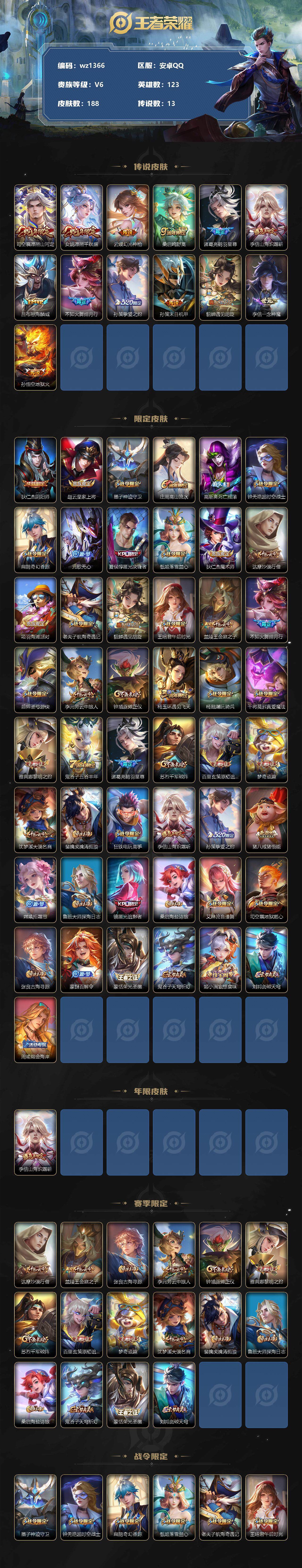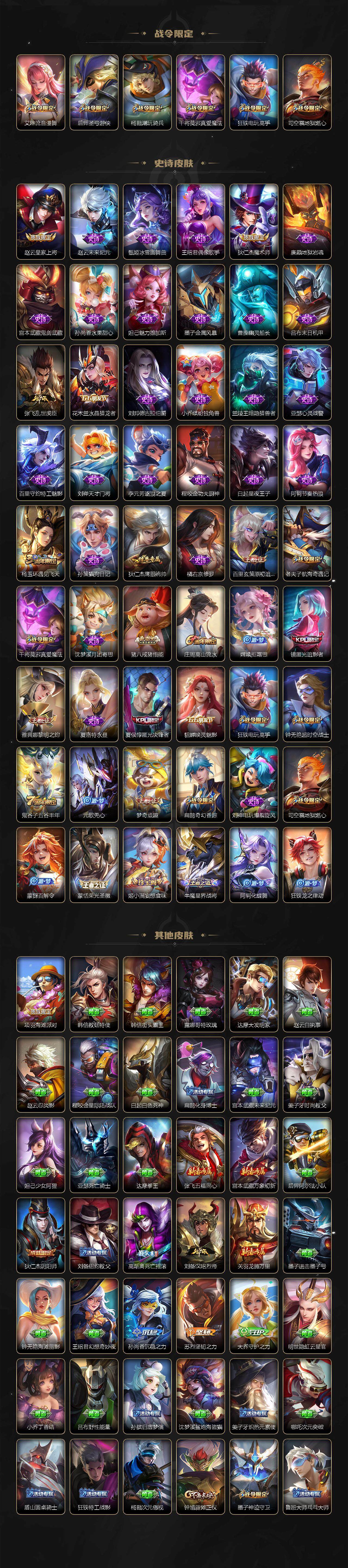 【游戏多多】【王者荣耀】【编号:3339543】【可二次实名】【wz1366】【商品标题】:安卓Q-V6-最强王者段位-123英雄-188皮肤-0典藏-0珍品无双-0无双-0珍品传说-13传说-54史诗 【传说皮肤】:司空震愿照山河定,女娲愿照千秋盛,云缨幻光神枪,桑启鸣野蒿,诸葛亮鹤羽星尊,李信山海炽霜斩,吕布怒海麟威,不知火舞绯月行,孙策挚爱之约,孙策末日机甲,貂蝉遇见胡旋,李信一念神魔,孙悟空地狱火 【限定皮肤】:狄仁杰阴阳师,赵云皇家上将,墨子神迹守卫,庄周高山流水,高渐离死亡摇滚,钟无艳超时空战士,扁鹊奇幻香踪,元歌无心,夏侯惇匿光决锋者,甄姬落雪兰心,狄仁杰魔术师,达摩沙漠行僧,项羽海滩派对,老夫子航海奇遇记,貂蝉遇见胡旋,王昭君午后时光,兰陵王金庭之子,不知火舞绯月行,后羿圣弓游侠,李元芳云中旅人,钟馗驱傩正仪,杨玉环遇见飞天,杨戬潮玩骑兵,干将莫邪真爱魔法,雅典娜黎明之约,鬼谷子五谷丰年,诸葛亮鹤羽星尊,苏烈千军破阵,百里玄策原初追逐者,梦奇顽趣,沈梦溪大漠名商,裴擒虎擒涛扼浪,狂铁电玩高手,李信山海炽霜斩,孙策挚爱之约,猪八戒猪悟能,嫦娥拒霜思,鲁班大师探海日志,镜匿光追影者,桑启海盐诗旅,艾琳流音漫舞,司空震地狱燃心,张良古海寻踪,蒙犽百解令,蒙恬荣光圣徽,鬼谷子天穹祈灯,姬小满妄想食味,刘邦剑破天穹,周瑜熔金海岸 【年限皮肤】:李信山海炽霜斩 【赛季限定】:达摩沙漠行僧,兰陵王金庭之子,张良古海寻踪,李元芳云中旅人,钟馗驱傩正仪,雅典娜黎明之约,苏烈千军破阵,百里玄策原初追逐者,梦奇顽趣,沈梦溪大漠名商,裴擒虎擒涛扼浪,鲁班大师探海日志,桑启海盐诗旅,鬼谷子天穹祈灯,蒙恬荣光圣徽,刘邦剑破天穹 【战令限定】:墨子神迹守卫,钟无艳超时空战士,扁鹊奇幻香踪,甄姬落雪兰心,老夫子航海奇遇记,王昭君午后时光,艾琳流音漫舞,后羿圣弓游侠,杨戬潮玩骑兵,干将莫邪真爱魔法,狂铁电玩高手,司空震地狱燃心 【史诗皮肤】:赵云皇家上将,赵云未来纪元,甄姬冰雪圆舞曲,王昭君偶像歌手,狄仁杰魔术师,廉颇地狱岩魂,宫本武藏鬼剑武藏,孙尚香水果甜心,妲己魅力维加斯,墨子金属风暴,曹操幽灵船长,吕布末日机甲,张飞乱世虎臣,花木兰水晶猎龙者,刘邦德古拉伯爵,小乔缤纷独角兽,兰陵王暗隐猎兽者,亚瑟心灵战警,百里守约特工魅影,刘禅天才门将,李元芳逐浪之夏,程咬金功夫厨神,白起星夜王子,阿轲节奏热浪,杨玉环遇见飞天,孙策猫狗日记,狄仁杰鹰眼统帅,橘右京修罗,百里玄策原初追逐者,老夫子航海奇遇记,干将莫邪真爱魔法,沈梦溪月团寄思,猪八戒猪悟能,庄周高山流水,嫦娥拒霜思,镜匿光追影者,雅典娜黎明之约,夏洛特永昼,夏侯惇匿光决锋者,貂蝉唤灵魅影,狂铁电玩高手,钟无艳超时空战士,鬼谷子五谷丰年,元歌无心,梦奇顽趣,扁鹊奇幻香踪,刘禅电玩爆裂旋风,司空震地狱燃心,蒙犽百解令,蒙恬荣光圣徽,姬小满妄想食味,牛魔星界战将,阿轲化蝶舞,狂铁龙之律动 【其他皮肤】:项羽海滩派对,韩信教廷特使,韩信街头霸王,露娜哥特玫瑰,达摩大发明家,赵云白执事,赵云忍炎影,程咬金星际陆战队,白起白色死神,扁鹊化身博士,宫本武藏未来纪元,姜子牙时尚教父,妲己少女阿狸,亚瑟死亡骑士,达摩拳王,张飞五福同心,宫本武藏万象初新,后羿阿尔法小队,狄仁杰阴阳师,刘备纽约教父,高渐离死亡摇滚,刘备汉昭烈帝,关羽龙腾万里,墨子进击墨子号,钟无艳海滩丽影,王昭君幻想奇妙夜,孙尚香沉稳之力,苏烈坚韧之力,大乔守护之力,明世隐虹云星官,小乔丁香结,吕布野性能量,孙膑归虚梦演,沈梦溪鲨炮海盗猫,姜子牙炽热元素使,哪吒次元突破,盾山圆桌骑士,狂铁特工战影,杨戬次元傲视,钟馗驱傩正仪,墨子神迹守卫,鲁班大师乓乓大师,苏烈千军破阵,后羿圣弓游侠,典韦铁甲之心,达摩沙漠行僧,兰陵王金庭之子,米莱狄契约魔法,王昭君午后时光,沈梦溪大漠名商,蒙犽胡桃狂想曲,蒙恬蔚蓝守将,甄姬落雪兰心,李元芳云中旅人,戈娅危途狂花,刘备潮玩造梦师,桑启海盐诗旅,海月幻泉雾影,白起乐园追猎者,赵怀真太极少年,裴擒虎擒涛扼浪,杨戬潮玩骑兵,太乙真人劲辣红锅,莱西奥西部游侠,鲁班大师探海日志,姬小满零食大作战,艾琳流音漫舞,张良古海寻踪,亚连破局者,后羿完美运算,鬼谷子天穹祈灯,海诺时空谍影,廉颇功夫炙烤,刘邦剑破天穹,周瑜熔金海岸,东皇太一噬灭天穹,干将莫邪雾都夜雨,苍苍林狼骑,太乙真人谧流熔炉,典韦铁骨偃魂,影魅影绮裳,西施雪境奇遇,姜子牙星梦巡礼,达摩爆裂喵拳,明世隐景韶洛都,戈娅玫蓝誓约,刘备浪漫序章,钟馗虚灵犬护,苏烈春野闲踪,张良灵野札记,阿古朵布丁狗之约,露娜命运加冕,姬小满小满鸭,甄姬逆浪荇歌,高渐离金属狂潮,项羽帝国元帅,狄仁杰锦衣卫,张良一千零一夜,周瑜海军大将,刘禅英喵野望,李元芳特种部队,刘邦圣殿之光,虞姬加勒比小姐,马可波罗激情绿茵,苍维京掠夺者,梦奇美梦成真,女娲