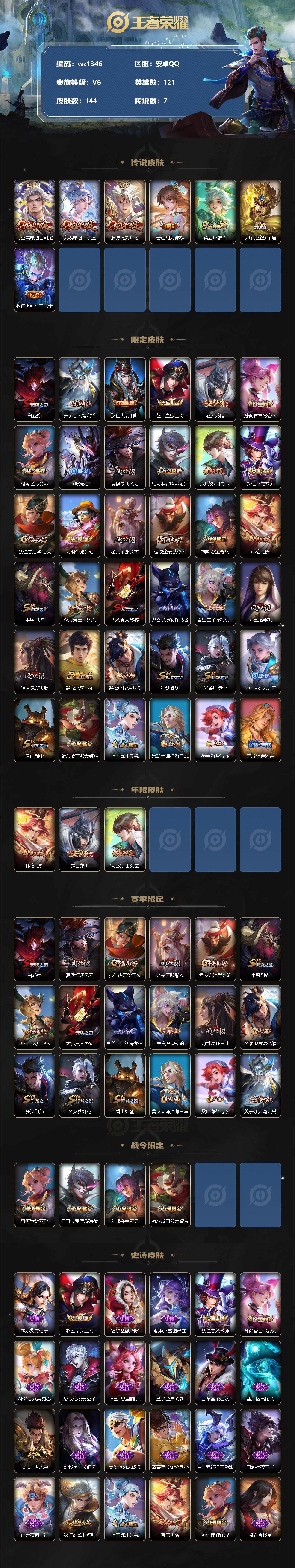 【游戏多多】【王者荣耀】【编号:3339563】【可二次实名】【wz1346】【商品标题】:安卓Q-V6-至尊星耀IV段位-121英雄-144皮肤-0典藏-0珍品无双-0无双-0珍品传说-7传说-34史诗 【传说皮肤】:司空震愿照山河定,女娲愿照千秋盛,澜愿照九州拓,云缨幻光神枪,桑启鸣野蒿,达摩黄金狮子座,狄仁杰超时空战士 【限定皮肤】:白起狰,姜子牙天穹之誓,狄仁杰阴阳师,赵云皇家上将,赵云龙胆,孙尚香蔷薇恋人,阿轲迷踪丽影,元歌无心,夏侯惇朔风刀,马可波罗暗影游猎,马可波罗山海玄木吟,狄仁杰魔术师,狄仁杰万华元夜,项羽海滩派对,老夫子醍醐杖,程咬金演武夺筹,刘邦夺宝奇兵,韩信飞衡,牛魔御旌,李元芳云中旅人,太乙真人饕餮,鬼谷子原初探秘者,百里玄策原初追逐者,弈星混沌棋,明世隐疑决卦,裴擒虎李小龙,裴擒虎擒涛扼浪,狂铁御狮,米莱狄御霄,云中君纤云弄巧,盾山御銮,猪八戒西部大镖客,上官婉儿梁祝,鲁班大师探海日志,桑启海盐诗旅,周瑜熔金海岸 【年限皮肤】:韩信飞衡,赵云龙胆,马可波罗山海玄木吟 【赛季限定】:白起狰,夏侯惇朔风刀,狄仁杰万华元夜,老夫子醍醐杖,程咬金演武夺筹,牛魔御旌,李元芳云中旅人,太乙真人饕餮,鬼谷子原初探秘者,百里玄策原初追逐者,弈星混沌棋,明世隐疑决卦,裴擒虎擒涛扼浪,狂铁御狮,米莱狄御霄,盾山御銮,鲁班大师探海日志,桑启海盐诗旅,姜子牙天穹之誓 【战令限定】:阿轲迷踪丽影,马可波罗暗影游猎,刘邦夺宝奇兵,猪八戒西部大镖客 【史诗皮肤】:露娜紫霞仙子,赵云皇家上将,貂蝉圣诞恋歌,甄姬冰雪圆舞曲,狄仁杰魔术师,孙尚香蔷薇恋人,孙尚香水果甜心,嬴政暗夜贵公子,妲己魅力维加斯,墨子金属风暴,吕布圣诞狂欢,曹操幽灵船长,张飞乱世虎臣,刘邦德古拉伯爵,夏侯惇乘风破浪,诸葛亮黄金分割率,百里守约特工魅影,白起星夜王子,孙策猫狗日记,狄仁杰鹰眼统帅,上官婉儿梁祝,韩信飞衡,阿轲迷踪丽影,橘右京修罗,赵云龙胆,马可波罗暗影游猎,百里玄策原初追逐者,裴擒虎李小龙,云中君纤云弄巧,钟馗乐园奇幻夜,元歌无心,马可波罗山海玄木吟,刘禅鸭鸭历险记,狂铁龙之律动 【其他皮肤】:项羽海滩派对,韩信教廷特使,韩信街头霸王,露娜哥特玫瑰,赵云忍炎影,白起白色死神,牛魔西部大镖客,扁鹊化身博士,孙膑天使之翼,姜子牙时尚教父,妲己少女阿狸,典韦黄金武士,亚瑟死亡骑士,达摩拳王,花木兰兔女郎,张飞五福同心,甄姬花好人间,宫本武藏万象初新,狄仁杰阴阳师,刘备纽约教父,关羽龙腾万里,白起狰,钟无艳海滩丽影,太乙真人饕餮,宫本武藏霸王丸,鬼谷子幻乐之宴,狂铁御狮,苏烈坚韧之力,米莱狄御霄,牛魔御旌,小乔丁香结,盾山御銮,姜子牙炽热元素使,夏侯惇朔风刀,弈星混沌棋,哪吒次元突破,鲁班七号黑桃队长,明世隐疑决卦,刘邦夺宝奇兵,盾山圆桌骑士,老夫子醍醐杖,猪八戒西部大镖客,鬼谷子原初探秘者,狄仁杰万华元夜,杨戬次元傲视,程咬金演武夺筹,张良缤纷绘卷,鲁班大师乓乓大师,李元芳云中旅人,桑启海盐诗旅,海月幻泉雾影,猪八戒潮玩探月行,牛魔牛运亨通,白起乐园追猎者,裴擒虎擒涛扼浪,鲁班大师探海日志,廉颇功夫炙烤,姜子牙天穹之誓,周瑜熔金海岸,苍苍林狼骑,太乙真人谧流熔炉,西施雪境奇遇,达摩爆裂喵拳,钟馗虚灵犬护,沈梦溪鸭鸭历险记,苏烈春野闲踪,张良灵野札记,阿古朵布丁狗之约,露娜命运加冕,白起死霸装,高渐离金属狂潮,貂蝉异域舞娘,花木兰剑舞者,老夫子潮流仙人,曹操死神来了,孙悟空西部大镖客,兰陵王隐刃,李白范海辛,钟馗地府判官,虞姬加勒比小姐,雅典娜战争女神,马可波罗激情绿茵,苍维京掠夺者,杨戬埃及法老,太乙真人圆桌骑士,诸葛亮星航指挥官,铠龙域领主,百里守约绝影神枪,百里玄策威尼斯狂欢,梦奇美梦成真,裴擒虎街头旋风,弈星踏雪寻梅,元歌午夜歌剧院,孙策海之征途,司马懿魇语军师,沈梦溪棒球奇才,李信灼热之刃,嫦娥露花倒影,云中君荷鲁斯之眼,曜归虚梦演,马超幸存者,西施归虚梦演,司空震启蛰 【内测皮肤】:孙尚香蔷薇恋人 【营地ID】:2133105746