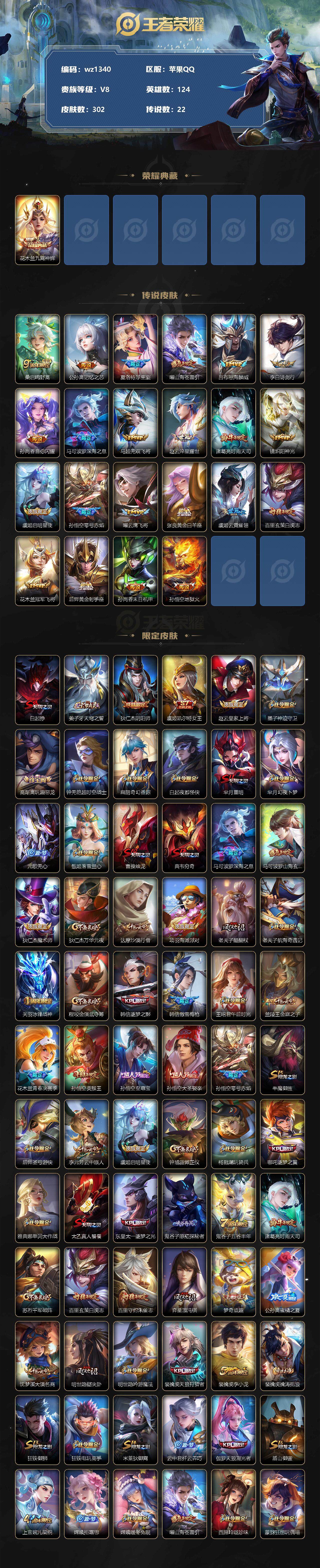 【游戏多多】【王者荣耀】【编号:3339564】【可二次实名】【wz1340】【商品标题】:苹果Q-V8-最强王者段位-124英雄-302皮肤-1典藏-0珍品无双-0无双-0珍品传说-22传说-78史诗 【荣耀典藏】:花木兰九霄神辉 【传说皮肤】:桑启鸣野蒿,公孙离记忆之芯,夏洛特浮生妄,曜山海苍雷引,吕布怒海麟威,李白诗剑行,孙尚香音你闪耀,马可波罗深海之息,马超无双飞将,赵云淬星耀世,诸葛亮时雨天司,镜炽阳神光,虞姬启明星使,孙悟空零号赤焰,曜云鹰飞将,张良黄金白羊座,虞姬云霓雀翎,百里玄策白虎志,花木兰冠军飞将,后羿黄金射手座,孙尚香末日机甲,孙悟空地狱火 【限定皮肤】:白起狰,姜子牙天穹之誓,狄仁杰阴阳师,虞姬凯尔特女王,赵云皇家上将,墨子神迹守卫,高渐离玩趣恶龙,钟无艳超时空战士,扁鹊奇幻香踪,白起夜都怪侠,芈月重明,芈月幻夜卜梦,元歌无心,甄姬落雪兰心,曹操烛龙,典韦穷奇,马可波罗深海之息,马可波罗山海玄木吟,狄仁杰魔术师,狄仁杰万华元夜,达摩沙漠行僧,项羽海滩派对,老夫子醍醐杖,老夫子航海奇遇记,关羽冰锋战神,程咬金演武夺筹,韩信逐梦之影,韩信傲雪梅枪,王昭君午后时光,兰陵王金庭之子,花木兰青春决赛季,孙悟空美猴王,孙悟空至尊宝,孙悟空大圣娶亲,孙悟空零号赤焰,牛魔御旌,后羿圣弓游侠,李元芳云中旅人,虞姬启明星使,钟馗驱傩正仪,杨戬潮玩骑兵,哪吒逐梦之翼,雅典娜单词大作战,太乙真人饕餮,东皇太一逐梦之光,鬼谷子原初探秘者,鬼谷子五谷丰年,诸葛亮时雨天司,苏烈千军破阵,百里玄策白虎志,百里守约朱雀志,弈星混沌棋,梦奇顽趣,公孙离蜜橘之夏,沈梦溪大漠名商,明世隐疑决卦,明世隐吟游魔法,裴擒虎天狼狩猎者,裴擒虎李小龙,裴擒虎擒涛扼浪,狂铁御狮,狂铁电玩高手,米莱狄御霄,云中君纤云弄巧,伽罗天狼溯光者,盾山御銮,上官婉儿梁祝,嫦娥拒霜思,嫦娥暖冬兔眠,曜山海苍雷引,西施玲珑珍味,蒙犽狂想玩偶喵,鲁班大师探海日志,镜匿光追影者,桑启海盐诗旅,夏洛特浮生妄,暃星界游侠,戈娅驭风魔法,艾琳女武神,艾琳流音漫舞,司空震地狱燃心,阿古朵江河有灵,张良古海寻踪,蒙犽百解令,蒙恬荣光圣徽,鬼谷子天穹祈灯,鲁班七号蔬乡物语,李元芳蔬乡物语,刘邦剑破天穹,程咬金群星魔术团,周瑜熔金海岸 【年限皮肤】:百里玄策白虎志,百里守约朱雀志,孙悟空美猴王,诸葛亮时雨天司,马可波罗山海玄木吟,曜山海苍雷引 【赛季限定】:白起狰,芈月重明,曹操烛龙,典韦穷奇,狄仁杰万华元夜,达摩沙漠行僧,老夫子醍醐杖,程咬金演武夺筹,兰陵王金庭之子,张良古海寻踪,牛魔御旌,李元芳云中旅人,虞姬凯尔特女王,钟馗驱傩正仪,太乙真人饕餮,鬼谷子原初探秘者,苏烈千军破阵,弈星混沌棋,梦奇顽趣,沈梦溪大漠名商,明世隐疑决卦,裴擒虎擒涛扼浪,狂铁御狮,米莱狄御霄,盾山御銮,鲁班大师探海日志,桑启海盐诗旅,鬼谷子天穹祈灯,蒙恬荣光圣徽,刘邦剑破天穹,姜子牙天穹之誓 【战令限定】:墨子神迹守卫,钟无艳超时空战士,扁鹊奇幻香踪,白起夜都怪侠,芈月幻夜卜梦,甄姬落雪兰心,老夫子航海奇遇记,王昭君午后时光,艾琳流音漫舞,后羿圣弓游侠,杨戬潮玩骑兵,雅典娜单词大作战,明世隐吟游魔法,狂铁电玩高手,嫦娥暖冬兔眠,西施玲珑珍味,蒙犽狂想玩偶喵,司空震地狱燃心,暃星界游侠,戈娅驭风魔法,鲁班七号蔬乡物语,李元芳蔬乡物语 【史诗皮肤】:露娜紫霞仙子,阿轲暗夜猫娘,赵云皇家上将,赵云未来纪元,貂蝉圣诞恋歌,甄姬冰雪圆舞曲,王昭君偶像歌手,狄仁杰魔术师,廉颇地狱岩魂,宫本武藏鬼剑武藏,孙尚香水果甜心,嬴政摇滚巨星,妲己魅力维加斯,妲己女仆咖啡,墨子金属风暴,吕布圣诞狂欢,曹操幽灵船长,李白千年之狐,吕布末日机甲,张飞乱世虎臣,韩信白龙吟,关羽冰锋战神,孙悟空至尊宝,花木兰水晶猎龙者,刘邦德古拉伯爵,韩信逐梦之影,夏侯惇乘风破浪,兰陵王暗隐猎兽者,诸葛亮黄金分割率,雅典娜冰冠公主,安琪拉心灵骇客,花木兰青春决赛季,百里守约特工魅影,铠曙光守护者,蔡文姬舞动绿茵,哪吒逐梦之翼,公孙离蜜橘之夏,李元芳逐浪之夏,程咬金功夫厨神,白起星夜王子,阿轲节奏热浪,东皇太一逐梦之光,孙策猫狗日记,百里守约朱雀志,孙悟空大圣娶亲,裴擒虎天狼狩猎者,狄仁杰鹰眼统帅,上官婉儿梁祝,不知火舞魅语,橘右京修罗,蒙犽狂想玩偶喵,裴擒虎李小龙,云中君纤云弄巧,老夫子航海奇遇记,伽罗天狼溯光者,嫦娥拒霜思,镜匿光追影者,韩信傲雪梅枪,夏洛特永昼,澜赏金猎手,明世隐吟游魔法,狂铁电玩高手,钟无艳超时空战士,鬼谷子五谷丰年,元歌无心,梦奇顽趣,暃星界游侠,马可波罗山海玄木吟,扁鹊奇幻香踪,刘禅电玩爆裂旋风,戈娅驭风魔法,司空震地狱燃心,阿古朵江河有灵,蒙犽百解令,蒙恬荣光圣徽,鲁班七号蔬乡物语,狂铁龙之律动,黄忠百相守梦 【其他皮肤】:项羽海滩派对,韩信教廷特使,韩信街头霸王,露娜哥特玫瑰,阿轲致