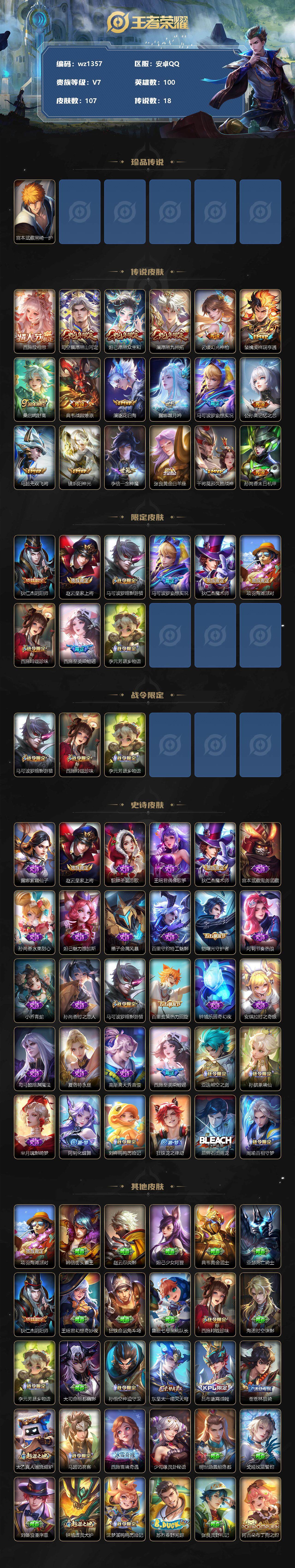 【游戏多多】【王者荣耀】【编号:3339568】【可二次实名】【wz1357】【商品标题】:安卓Q-V7-至尊星耀IV段位-100英雄-107皮肤-0典藏-0珍品无双-0无双-1珍品传说-18传说-30史诗 【珍品传说】:宫本武藏黑崎一护 【传说皮肤】:西施续相思,司空震愿照山河定,妲己愿照众生和,澜愿照九州拓,云缨幻光神枪,裴擒虎祥瑞亨通,桑启鸣野蒿,典韦战鼓燎原,澜逐花归海,露娜霜月吟,马可波罗妄想实况,公孙离记忆之芯,马超无双飞将,镜炽阳神光,李信一念神魔,张良黄金白羊座,干将莫邪久胜战神,孙尚香末日机甲 【限定皮肤】:狄仁杰阴阳师,赵云皇家上将,马可波罗暗影游猎,马可波罗妄想实况,狄仁杰魔术师,项羽海滩派对,西施玲珑珍味,西施至美乘鲤谣,李元芳蔬乡物语 【战令限定】:马可波罗暗影游猎,西施玲珑珍味,李元芳蔬乡物语 【史诗皮肤】:露娜紫霞仙子,赵云皇家上将,貂蝉圣诞恋歌,王昭君偶像歌手,狄仁杰魔术师,宫本武藏鬼剑武藏,孙尚香水果甜心,妲己魅力维加斯,墨子金属风暴,百里守约特工魅影,铠曙光守护者,阿轲节奏热浪,小乔青蛇,孙尚香时之恋人,马可波罗暗影游猎,百里玄策热力回旋,钟馗乐园奇幻夜,安琪拉时之奇旅,司马懿暗渊魔法,夏洛特永昼,高渐离天秀音浪,西施至美乘鲤谣,亚连破空之剑,孙膑茶境仙,芈月瑰影绮梦,阿轲化蝶舞,刘禅鸭鸭历险记,狂铁龙之律动,后羿石田雨龙,周瑜百相守梦 【其他皮肤】:项羽海滩派对,韩信街头霸王,赵云忍炎影,妲己少女阿狸,典韦黄金武士,亚瑟死亡骑士,狄仁杰阴阳师,王昭君幻想奇妙夜,狂铁命运角斗场,鲁班七号黑桃队长,西施玲珑珍味,海诺时空谍影,李元芳蔬乡物语,大司命暗都幽影,孙悟空神迹守卫,东皇太一噬灭天穹,吕布逐霄战戟,苍苍林狼骑,太乙真人谧流熔炉,马超访茗客,西施雪境奇遇,少司缘灵卦秘语,明世隐景韶洛都,戈娅玫蓝誓约,刘备浪漫序章,钟馗虚灵犬护,沈梦溪鸭鸭历险记,苏烈春野闲踪,张良灵野札记,阿古朵布丁狗之约,露娜命运加冕,姬小满小满鸭,白起死霸装,甄姬逆浪荇歌,孙策百相守梦,空空儿戏梦巡演,老夫子潮流仙人,后羿精灵王,虞姬加勒比小姐,关羽天启骑士,马可波罗激情绿茵,杨戬埃及法老,太乙真人圆桌骑士,黄忠芝加哥教父,鬼谷子阿摩司公爵,铠龙域领主,百里守约绝影神枪,百里玄策威尼斯狂欢,梦奇美梦成真,明世隐占星师,裴擒虎街头旋风,元歌午夜歌剧院,孙策海之征途,沈梦溪棒球奇才,瑶森,蒙犽归虚梦演,澜孤猎,暃碧珀绯影 【营地ID】:1636585155