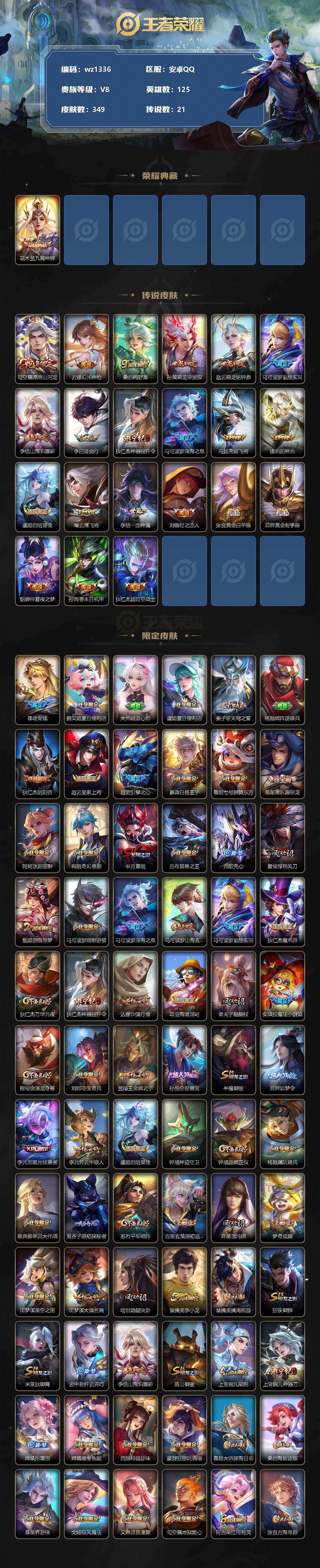 【游戏多多】【王者荣耀】【编号:3339570】【可二次实名】【wz1336】【商品标题】:安卓Q-V8-至尊星耀I段位-125英雄-349皮肤-1典藏-0珍品无双-0无双-0珍品传说-21传说-107史诗 【荣耀典藏】:花木兰九霄神辉 【传说皮肤】:司空震愿照山河定,云缨幻光神枪,桑启鸣野蒿,孙策乘龙淬吴钩,赵云乘龙铭钟鼎,马可波罗妄想实况,李信山海炽霜斩,李白诗剑行,狄仁杰神器狴犴令,马可波罗深海之息,马超无双飞将,镜炽阳神光,虞姬启明星使,曜云鹰飞将,李信一念神魔,刘备时之恋人,张良黄金白羊座,后羿黄金射手座,貂蝉仲夏夜之梦,孙尚香末日机甲,狄仁杰超时空战士 【限定皮肤】:暃埋骨钱,蔡文姬夏日便利店,大乔绒语心约,虞姬夏日便利店,姜子牙天穹之誓,杨戬破阵退雄兵,狄仁杰阴阳师,赵云皇家上将,赵云引擎之心,嬴政白昼王子,鲁班七号狮舞东方,高渐离玩趣恶龙,阿轲迷踪丽影,扁鹊奇幻香踪,芈月重明,吕布猎兽之王,元歌无心,夏侯惇朔风刀,甄姬游园惊梦,马可波罗暗影游猎,马可波罗深海之息,马可波罗山海玄木吟,马可波罗妄想实况,狄仁杰魔术师,狄仁杰万华元夜,狄仁杰神器狴犴令,达摩沙漠行僧,项羽海滩派对,老夫子醍醐杖,安琪拉魔法小厨娘,程咬金演武夺筹,刘邦夺宝奇兵,兰陵王金庭之子,孙悟空至尊宝,牛魔御旌,后羿如梦令,李元芳匿光侦查者,李元芳云中旅人,虞姬启明星使,钟馗神迹守卫,钟馗驱傩正仪,杨戬潮玩骑兵,雅典娜单词大作战,鬼谷子原初探秘者,苏烈千军破阵,百里玄策原初追逐者,弈星混沌棋,梦奇顽趣,沈梦溪星空之诺,沈梦溪大漠名商,明世隐疑决卦,裴擒虎李小龙,裴擒虎擒涛扼浪,狂铁御狮,米莱狄御霄,云中君纤云弄巧,李信山海炽霜斩,盾山御銮,上官婉儿梁祝,上官婉儿神器万象笔,嫦娥拒霜思,嫦娥暖冬兔眠,西施玲珑珍味,蒙犽狂想玩偶喵,鲁班大师探海日志,桑启海盐诗旅,暃星界游侠,戈娅驭风魔法,艾琳流音漫舞,司空震地狱燃心,阿古朵江河有灵,张良古海寻踪,蒙犽百解令,蒙恬荣光圣徽,高渐离燃音魔法,妲己灵卜魔法,鬼谷子天穹祈灯,伽罗琥珀纪元,姬小满妄想食味,孙策乘龙淬吴钩,赵云乘龙铭钟鼎,沈梦溪龙舞盛年,鲁班七号蔬乡物语,李元芳蔬乡物语,刘邦剑破天穹,程咬金群星魔术团,镜青焰无极,项羽苍威无极,海诺心动手记,刘备异域游侠,芈月浮光幕影,周瑜熔金海岸 【年限皮肤】:马可波罗山海玄木吟,李信山海炽霜斩,孙策乘龙淬吴钩,赵云乘龙铭钟鼎 【赛季限定】:芈月重明,夏侯惇朔风刀,狄仁杰万华元夜,达摩沙漠行僧,老夫子醍醐杖,程咬金演武夺筹,兰陵王金庭之子,张良古海寻踪,牛魔御旌,李元芳云中旅人,钟馗驱傩正仪,鬼谷子原初探秘者,苏烈千军破阵,百里玄策原初追逐者,弈星混沌棋,梦奇顽趣,沈梦溪大漠名商,明世隐疑决卦,裴擒虎擒涛扼浪,狂铁御狮,米莱狄御霄,盾山御銮,鲁班大师探海日志,桑启海盐诗旅,鬼谷子天穹祈灯,蒙恬荣光圣徽,刘邦剑破天穹,姜子牙天穹之誓 【战令限定】:蔡文姬夏日便利店,虞姬夏日便利店,嬴政白昼王子,鲁班七号狮舞东方,阿轲迷踪丽影,扁鹊奇幻香踪,吕布猎兽之王,马可波罗暗影游猎,刘邦夺宝奇兵,艾琳流音漫舞,钟馗神迹守卫,杨戬潮玩骑兵,雅典娜单词大作战,沈梦溪星空之诺,嫦娥暖冬兔眠,西施玲珑珍味,蒙犽狂想玩偶喵,司空震地狱燃心,暃星界游侠,戈娅驭风魔法,高渐离燃音魔法,妲己灵卜魔法,鲁班七号蔬乡物语,李元芳蔬乡物语,镜青焰无极,项羽苍威无极 【史诗皮肤】:露娜紫霞仙子,阿轲暗夜猫娘,赵云皇家上将,赵云未来纪元,貂蝉圣诞恋歌,甄姬冰雪圆舞曲,王昭君偶像歌手,狄仁杰魔术师,廉颇地狱岩魂,宫本武藏鬼剑武藏,孙尚香水果甜心,嬴政暗夜贵公子,嬴政摇滚巨星,妲己魅力维加斯,妲己女仆咖啡,墨子龙骑士,墨子金属风暴,吕布圣诞狂欢,刘禅绅士熊喵,曹操幽灵船长,李白千年之狐,吕布末日机甲,安琪拉魔法小厨娘,张飞乱世虎臣,韩信白龙吟,孙悟空至尊宝,赵云引擎之心,花木兰水晶猎龙者,刘邦德古拉伯爵,夏侯惇乘风破浪,小乔缤纷独角兽,兰陵王暗隐猎兽者,诸葛亮黄金分割率,甄姬游园惊梦,亚瑟心灵战警,安琪拉心灵骇客,百里守约特工魅影,铠曙光守护者,蔡文姬舞动绿茵,刘禅天才门将,李元芳逐浪之夏,程咬金功夫厨神,白起星夜王子,阿轲节奏热浪,嬴政白昼王子,孙策猫狗日记,大乔猫狗日记,伽罗箭羽风息,鲁班七号狮舞东方,狄仁杰鹰眼统帅,公孙离无限星赏官,上官婉儿梁祝,娜可露露晚萤,后羿如梦令,大乔白蛇,小乔青蛇,不知火舞魅语,阿轲迷踪丽影,橘右京修罗,孙尚香时之恋人,马可波罗暗影游猎,蒙犽狂想玩偶喵,百里玄策原初追逐者,裴擒虎李小龙,云中君纤云弄巧,杨戬天秀启明,沈梦溪月团寄思,司马懿暗渊魔法,嫦娥拒霜思,澜赏金猎手,貂蝉唤灵魅影,上官婉儿神器万象笔,元歌无心,梦奇顽趣,暃星界游侠,马可波罗山海玄木吟,扁鹊奇幻香踪,刘禅电玩爆裂旋风,戈娅驭风魔法,莱西奥末日机甲,李元芳匿光