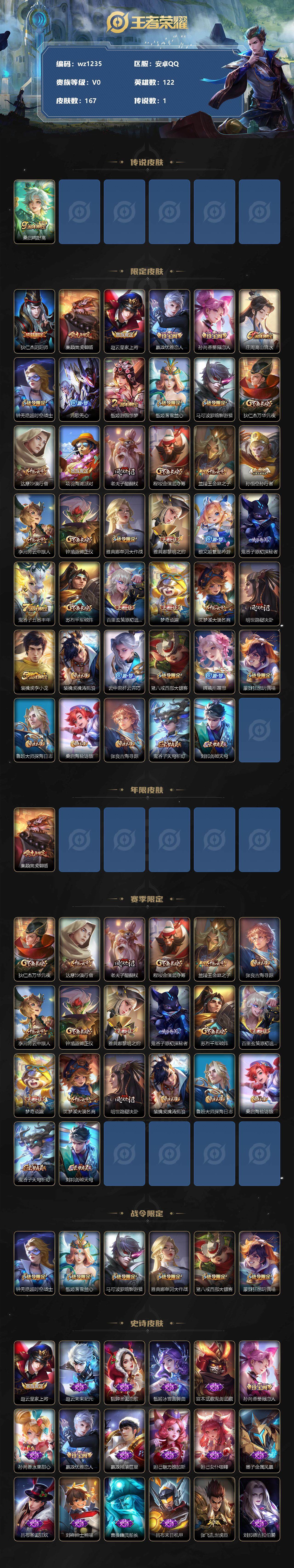 【游戏多多】【王者荣耀】【编号:3339637】【可二次实名】【wz1235】【商品标题】:安卓Q-V0-永恒钻石V段位-122英雄-167皮肤-0典藏-0珍品无双-0无双-0珍品传说-1传说-42史诗 【传说皮肤】:桑启鸣野蒿 【限定皮肤】:狄仁杰阴阳师,廉颇寅虎御盾,赵云皇家上将,嬴政优雅恋人,孙尚香蔷薇恋人,庄周高山流水,钟无艳超时空战士,元歌无心,甄姬游园惊梦,甄姬落雪兰心,马可波罗暗影游猎,狄仁杰万华元夜,达摩沙漠行僧,项羽海滩派对,老夫子醍醐杖,程咬金演武夺筹,兰陵王金庭之子,孙悟空孙行者,李元芳云中旅人,钟馗驱傩正仪,雅典娜单词大作战,雅典娜黎明之约,蔡文姬繁星吟游,鬼谷子原初探秘者,鬼谷子五谷丰年,苏烈千军破阵,百里玄策原初追逐者,梦奇顽趣,沈梦溪大漠名商,明世隐疑决卦,裴擒虎李小龙,裴擒虎擒涛扼浪,云中君纤云弄巧,猪八戒西部大镖客,嫦娥拒霜思,蒙犽狂想玩偶喵,鲁班大师探海日志,桑启海盐诗旅,张良古海寻踪,鬼谷子天穹祈灯,刘邦剑破天穹 【年限皮肤】:廉颇寅虎御盾 【赛季限定】:狄仁杰万华元夜,达摩沙漠行僧,老夫子醍醐杖,程咬金演武夺筹,兰陵王金庭之子,张良古海寻踪,李元芳云中旅人,钟馗驱傩正仪,雅典娜黎明之约,鬼谷子原初探秘者,苏烈千军破阵,百里玄策原初追逐者,梦奇顽趣,沈梦溪大漠名商,明世隐疑决卦,裴擒虎擒涛扼浪,鲁班大师探海日志,桑启海盐诗旅,鬼谷子天穹祈灯,刘邦剑破天穹 【战令限定】:钟无艳超时空战士,甄姬落雪兰心,马可波罗暗影游猎,雅典娜单词大作战,猪八戒西部大镖客,蒙犽狂想玩偶喵 【史诗皮肤】:赵云皇家上将,赵云未来纪元,貂蝉圣诞恋歌,甄姬冰雪圆舞曲,宫本武藏鬼剑武藏,孙尚香蔷薇恋人,孙尚香水果甜心,嬴政优雅恋人,嬴政摇滚巨星,妲己魅力维加斯,妲己女仆咖啡,墨子金属风暴,吕布圣诞狂欢,刘禅绅士熊喵,曹操幽灵船长,吕布末日机甲,张飞乱世虎臣,刘邦德古拉伯爵,夏侯惇乘风破浪,兰陵王暗隐猎兽者,甄姬游园惊梦,亚瑟心灵战警,安琪拉心灵骇客,百里守约特工魅影,蔡文姬舞动绿茵,白起星夜王子,狄仁杰鹰眼统帅,蔡文姬繁星吟游,马可波罗暗影游猎,蒙犽狂想玩偶喵,百里玄策原初追逐者,裴擒虎李小龙,云中君纤云弄巧,孙悟空孙行者,庄周高山流水,嫦娥拒霜思,雅典娜黎明之约,廉颇寅虎御盾,钟无艳超时空战士,鬼谷子五谷丰年,元歌无心,梦奇顽趣 【其他皮肤】:项羽海滩派对,韩信教廷特使,韩信街头霸王,达摩大发明家,赵云白执事,程咬金星际陆战队,程咬金爱与正义,白起白色死神,扁鹊化身博士,安琪拉玩偶对对碰,孙膑天使之翼,妲己少女阿狸,亚瑟死亡骑士,花木兰兔女郎,张飞五福同心,甄姬花好人间,刘备万事如意,后羿阿尔法小队,狄仁杰阴阳师,刘备纽约教父,关羽龙腾万里,钟无艳海滩丽影,王昭君幻想奇妙夜,老夫子功夫老勺,牛魔制霸全明星,孙尚香沉稳之力,鬼谷子幻乐之宴,苏烈坚韧之力,大乔守护之力,项羽科学大爆炸,明世隐虹云星官,庄周奇妙博物学,小乔丁香结,吕布野性能量,孙膑归虚梦演,沈梦溪鲨炮海盗猫,姜子牙炽热元素使,哪吒次元突破,明世隐疑决卦,老夫子醍醐杖,猪八戒西部大镖客,狂铁特工战影,廉颇无尽征程,鬼谷子原初探秘者,雅典娜单词大作战,狄仁杰万华元夜,刘禅秘密基地,杨戬次元傲视,程咬金演武夺筹,张良缤纷绘卷,盘古重装意志,钟馗驱傩正仪,鲁班大师乓乓大师,苏烈千军破阵,达摩沙漠行僧,程咬金无双福将,刘邦虎啸剑宗,兰陵王金庭之子,刘禅唤灵魔甲,沈梦溪大漠名商,蒙恬蔚蓝守将,甄姬落雪兰心,李元芳云中旅人,刘备潮玩造梦师,桑启海盐诗旅,海月幻泉雾影,猪八戒潮玩探月行,牛魔牛运亨通,白起乐园追猎者,裴擒虎擒涛扼浪,太乙真人劲辣红锅,鲁班大师探海日志,张良古海寻踪,后羿完美运算,鬼谷子天穹祈灯,廉颇功夫炙烤,钟无艳春野之旅,刘邦剑破天穹,东皇太一噬灭天穹,鲁班七号福禄兄弟,鲁班七号木偶奇遇记,高渐离金属狂潮,花木兰剑舞者,老夫子潮流仙人,王昭君精灵公主,曹操超能战警,小乔万圣前夜,孙膑未来旅行,孙悟空西部大镖客,后羿精灵王,刘禅英喵野望,李白范海辛,钟馗地府判官,李元芳特种部队,刘邦圣殿之光,虞姬加勒比小姐,夏侯惇战争骑士,雅典娜战争女神,苍维京掠夺者,杨戬埃及法老,哪吒三太子,诸葛亮星航指挥官,黄忠芝加哥教父,干将莫邪第七人偶,鬼谷子阿摩司公爵,铠龙域领主,百里玄策威尼斯狂欢,梦奇美梦成真,公孙离花间舞,杨玉环霓裳曲,米莱狄精准探案法,伽罗花见巫女,李信灼热之刃,嫦娥露花倒影,猪八戒年年有余,盘古创世神祝,瑶森,云中君荷鲁斯之眼,蒙恬秩序猎龙将,澜孤猎,司空震启蛰,云缨赤焰之缨,暃碧珀绯影,桑启画中游 【内测皮肤】:孙尚香蔷薇恋人,嬴政优雅恋人,狂铁特工战影 【营地ID】:2130332485