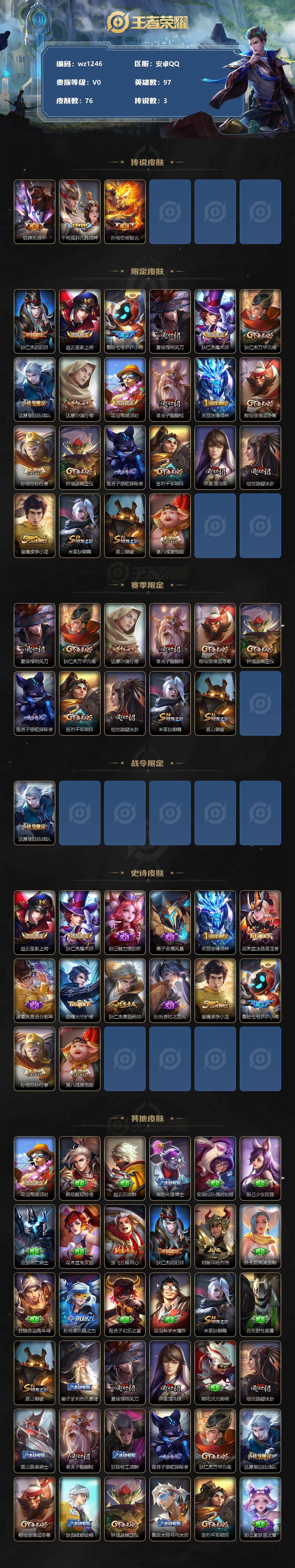 【游戏多多】【王者荣耀】【编号:3339639】【可二次实名】【wz1246】【商品标题】:安卓Q-V0-荣耀黄金I段位-97英雄-76皮肤-0典藏-0珍品无双-0无双-0珍品传说-3传说-14史诗 【传说皮肤】:铠绛天战甲,干将莫邪久胜战神,孙悟空地狱火 【限定皮肤】:狄仁杰阴阳师,赵云皇家上将,鲁班七号乒乒小将,夏侯惇朔风刀,狄仁杰魔术师,狄仁杰万华元夜,达摩星际陆战队,达摩沙漠行僧,项羽海滩派对,老夫子醍醐杖,关羽冰锋战神,程咬金演武夺筹,孙悟空孙行者,钟馗驱傩正仪,鬼谷子原初探秘者,苏烈千军破阵,弈星混沌棋,明世隐疑决卦,裴擒虎李小龙,米莱狄御霄,盾山御銮,猪八戒猪悟能 【赛季限定】:夏侯惇朔风刀,狄仁杰万华元夜,达摩沙漠行僧,老夫子醍醐杖,程咬金演武夺筹,钟馗驱傩正仪,鬼谷子原初探秘者,苏烈千军破阵,弈星混沌棋,明世隐疑决卦,米莱狄御霄,盾山御銮 【战令限定】:达摩星际陆战队 【史诗皮肤】:赵云皇家上将,狄仁杰魔术师,妲己魅力维加斯,墨子金属风暴,关羽冰锋战神,花木兰水晶猎龙者,诸葛亮黄金分割率,铠曙光守护者,狄仁杰鹰眼统帅,孙尚香时之恋人,裴擒虎李小龙,鲁班七号乒乒小将,孙悟空孙行者,猪八戒猪悟能 【其他皮肤】:项羽海滩派对,韩信教廷特使,赵云忍炎影,扁鹊化身博士,安琪拉玩偶对对碰,妲己少女阿狸,亚瑟死亡骑士,花木兰兔女郎,张飞五福同心,狄仁杰阴阳师,刘备汉昭烈帝,钟无艳海滩丽影,狂铁命运角斗场,孙尚香沉稳之力,鬼谷子幻乐之宴,项羽科学大爆炸,米莱狄御霄,吕布野性能量,盾山御銮,姜子牙炽热元素使,夏侯惇朔风刀,弈星混沌棋,哪吒次元突破,明世隐疑决卦,盾山圆桌骑士,老夫子醍醐杖,狂铁特工战影,鬼谷子原初探秘者,狄仁杰万华元夜,达摩星际陆战队,程咬金演武夺筹,张良缤纷绘卷,钟馗驱傩正仪,鲁班大师乓乓大师,苏烈千军破阵,妲己紫罗兰之誓,达摩沙漠行僧,露娜命运加冕,鲁班七号木偶奇遇记,露娜绯红之刃,小乔万圣前夜,孙悟空西部大镖客,后羿精灵王,兰陵王隐刃,李元芳特种部队,关羽天启骑士,蔡文姬蔷薇王座,黄忠芝加哥教父,干将莫邪第七人偶,鬼谷子阿摩司公爵,苏烈爱与和平,元歌午夜歌剧院,盾山极冰防御线,沈梦溪棒球奇才,李信灼热之刃,盘古创世神祝,瑶森,云中君荷鲁斯之眼,蒙恬秩序猎龙将 【内测皮肤】:狂铁特工战影 【营地ID】:1578629746