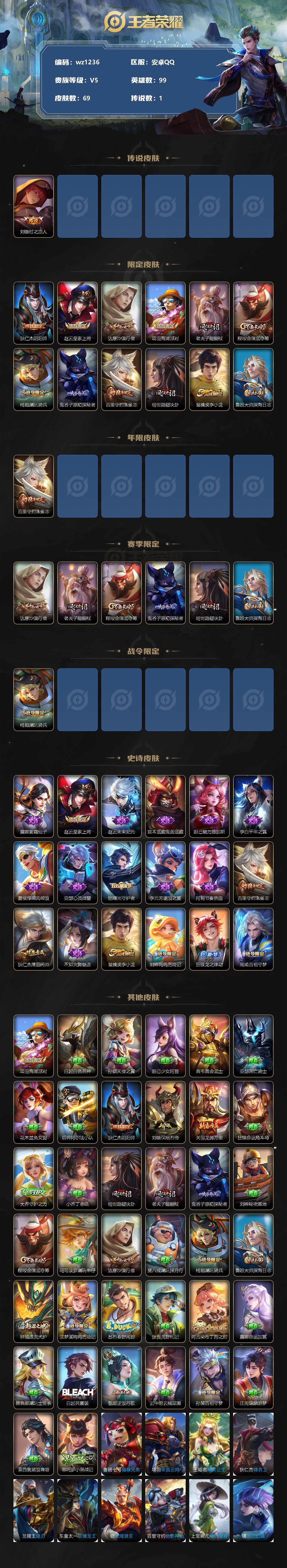 【游戏多多】【王者荣耀】【编号:3339641】【可二次实名】【wz1236】【商品标题】:安卓Q-V5-至尊星耀III段位-99英雄-69皮肤-0典藏-0珍品无双-0无双-0珍品传说-1传说-18史诗 【传说皮肤】:刘备时之恋人 【限定皮肤】:狄仁杰阴阳师,赵云皇家上将,达摩沙漠行僧,项羽海滩派对,老夫子醍醐杖,程咬金演武夺筹,杨戬潮玩骑兵,鬼谷子原初探秘者,百里守约朱雀志,明世隐疑决卦,裴擒虎李小龙,鲁班大师探海日志 【年限皮肤】:百里守约朱雀志 【赛季限定】:达摩沙漠行僧,老夫子醍醐杖,程咬金演武夺筹,鬼谷子原初探秘者,明世隐疑决卦,鲁班大师探海日志 【战令限定】:杨戬潮玩骑兵 【史诗皮肤】:露娜紫霞仙子,赵云皇家上将,赵云未来纪元,宫本武藏鬼剑武藏,妲己魅力维加斯,李白千年之狐,夏侯惇乘风破浪,亚瑟心灵战警,铠曙光守护者,李元芳逐浪之夏,阿轲节奏热浪,百里守约朱雀志,狄仁杰鹰眼统帅,不知火舞魅语,裴擒虎李小龙,刘禅鸭鸭历险记,狂铁龙之律动,周瑜百相守梦 【其他皮肤】:项羽海滩派对,白起白色死神,孙膑天使之翼,妲己少女阿狸,典韦黄金武士,亚瑟死亡骑士,花木兰兔女郎,后羿阿尔法小队,狄仁杰阴阳师,刘备汉昭烈帝,关羽龙腾万里,狂铁命运角斗场,大乔守护之力,小乔丁香结,明世隐疑决卦,老夫子醍醐杖,鬼谷子原初探秘者,刘禅秘密基地,程咬金演武夺筹,马可波罗潮玩牛仔,达摩沙漠行僧,猪八戒潮玩探月行,杨戬潮玩骑兵,鲁班大师探海日志,钟馗虚灵犬护,沈梦溪鸭鸭历险记,苏烈春野闲踪,张良灵野札记,阿古朵布丁狗之约,露娜命运加冕,雅典娜潮玩士官长,白起死霸装,甄姬逆浪荇歌,云中君云械蓝图,孙策百相守梦,庄周锦麟游梦,莱西奥踏浪烽翎,哪吒罗小黑战记,鲁班七号福禄兄弟,项羽帝国元帅,王昭君精灵公主,狄仁杰锦衣卫,兰陵王隐刃,东皇太一东海龙王,铠龙域领主,百里守约绝影神枪,上官婉儿修竹墨客,镜冰刃幻境,蒙恬秩序猎龙将,司空震启蛰 【营地ID】:1899785461