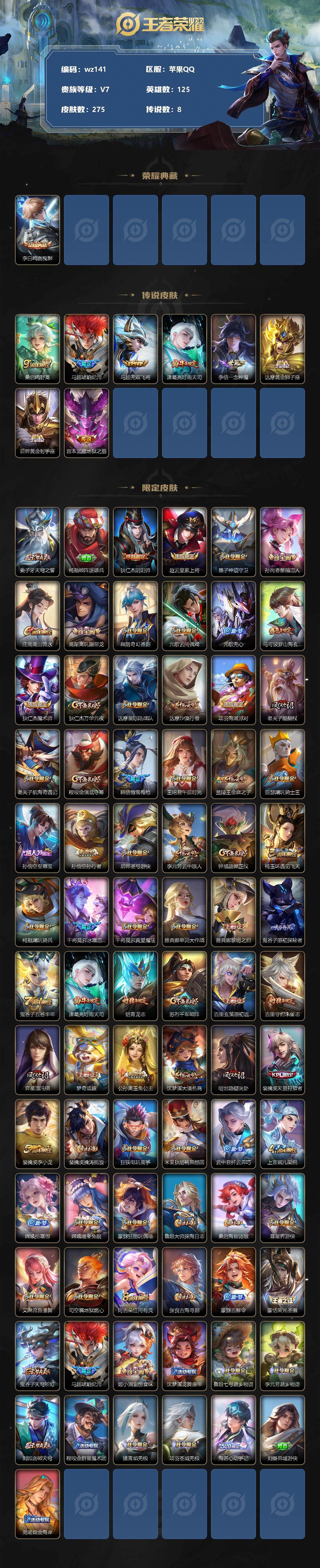 【游戏多多】【王者荣耀】【编号:3339662】【可二次实名】【wz141】【商品标题】:苹果Q-V7-最强王者段位-125英雄-275皮肤-1典藏-0珍品无双-0无双-0珍品传说-8传说-83史诗 【荣耀典藏】:李白鸣剑曳影 【传说皮肤】:桑启鸣野蒿,马超琥珀纪元,马超无双飞将,诸葛亮时雨天司,李信一念神魔,达摩黄金狮子座,后羿黄金射手座,宫本武藏地狱之眼 【限定皮肤】:姜子牙天穹之誓,杨戬破阵退雄兵,狄仁杰阴阳师,赵云皇家上将,墨子神迹守卫,孙尚香蔷薇恋人,庄周高山流水,高渐离玩趣恶龙,扁鹊奇幻香踪,元歌云间偶戏,元歌无心,马可波罗山海玄木吟,狄仁杰魔术师,狄仁杰万华元夜,达摩星际陆战队,达摩沙漠行僧,项羽海滩派对,老夫子醍醐杖,老夫子航海奇遇记,程咬金演武夺筹,韩信傲雪梅枪,王昭君午后时光,兰陵王金庭之子,亚瑟潮玩骑士王,孙悟空至尊宝,孙悟空孙行者,后羿圣弓游侠,李元芳云中旅人,钟馗驱傩正仪,杨玉环遇见飞天,杨戬潮玩骑兵,干将莫邪冰霜恋舞曲,干将莫邪真爱魔法,雅典娜单词大作战,雅典娜黎明之约,鬼谷子原初探秘者,鬼谷子五谷丰年,诸葛亮时雨天司,铠青龙志,苏烈千军破阵,百里玄策原初追逐者,百里守约朱雀志,弈星混沌棋,梦奇顽趣,公孙离玉兔公主,沈梦溪大漠名商,明世隐疑决卦,裴擒虎天狼狩猎者,裴擒虎李小龙,裴擒虎擒涛扼浪,狂铁电玩高手,米莱狄胡桃异想国,云中君纤云弄巧,上官婉儿梁祝,嫦娥拒霜思,嫦娥暖冬兔眠,蒙犽狂想玩偶喵,鲁班大师探海日志,桑启海盐诗旅,暃星界游侠,艾琳流音漫舞,司空震地狱燃心,阿古朵江河有灵,张良古海寻踪,蒙犽百解令,蒙恬荣光圣徽,鬼谷子天穹祈灯,马超琥珀纪元,姬小满妄想食味,沈梦溪龙舞盛年,鲁班七号蔬乡物语,李元芳蔬乡物语,刘邦剑破天穹,程咬金群星魔术团,镜青焰无极,项羽苍威无极,海诺心动手记,刘备异域游侠,周瑜熔金海岸 【年限皮肤】:百里守约朱雀志,铠青龙志,诸葛亮时雨天司,马可波罗山海玄木吟 【赛季限定】:狄仁杰万华元夜,达摩沙漠行僧,老夫子醍醐杖,程咬金演武夺筹,兰陵王金庭之子,张良古海寻踪,李元芳云中旅人,钟馗驱傩正仪,雅典娜黎明之约,鬼谷子原初探秘者,苏烈千军破阵,百里玄策原初追逐者,弈星混沌棋,梦奇顽趣,沈梦溪大漠名商,明世隐疑决卦,裴擒虎擒涛扼浪,鲁班大师探海日志,桑启海盐诗旅,鬼谷子天穹祈灯,蒙恬荣光圣徽,刘邦剑破天穹,姜子牙天穹之誓 【战令限定】:墨子神迹守卫,扁鹊奇幻香踪,元歌云间偶戏,达摩星际陆战队,老夫子航海奇遇记,王昭君午后时光,艾琳流音漫舞,亚瑟潮玩骑士王,后羿圣弓游侠,杨戬潮玩骑兵,干将莫邪真爱魔法,雅典娜单词大作战,狂铁电玩高手,米莱狄胡桃异想国,嫦娥暖冬兔眠,蒙犽狂想玩偶喵,司空震地狱燃心,暃星界游侠,鲁班七号蔬乡物语,李元芳蔬乡物语,镜青焰无极,项羽苍威无极 【史诗皮肤】:鲁班七号电玩小子,项羽苍穹之光,露娜紫霞仙子,阿轲暗夜猫娘,赵云皇家上将,赵云未来纪元,甄姬冰雪圆舞曲,王昭君偶像歌手,狄仁杰魔术师,宫本武藏鬼剑武藏,孙尚香蔷薇恋人,孙尚香水果甜心,嬴政暗夜贵公子,嬴政摇滚巨星,妲己女仆咖啡,墨子金属风暴,吕布圣诞狂欢,刘禅绅士熊喵,曹操幽灵船长,李白千年之狐,吕布末日机甲,孙悟空至尊宝,花木兰水晶猎龙者,刘邦德古拉伯爵,夏侯惇乘风破浪,小乔缤纷独角兽,兰陵王暗隐猎兽者,亚瑟心灵战警,安琪拉心灵骇客,百里守约特工魅影,铠曙光守护者,蔡文姬舞动绿茵,李元芳逐浪之夏,程咬金功夫厨神,白起星夜王子,杨玉环遇见飞天,孙策猫狗日记,铠青龙志,百里守约朱雀志,干将莫邪冰霜恋舞曲,伽罗箭羽风息,裴擒虎天狼狩猎者,狄仁杰鹰眼统帅,公孙离无限星赏官,上官婉儿梁祝,娜可露露晚萤,橘右京修罗,蒙犽狂想玩偶喵,百里玄策原初追逐者,裴擒虎李小龙,云中君纤云弄巧,元歌云间偶戏,米莱狄胡桃异想国,老夫子航海奇遇记,干将莫邪真爱魔法,沈梦溪月团寄思,孙悟空孙行者,庄周高山流水,嫦娥拒霜思,雅典娜黎明之约,韩信傲雪梅枪,夏洛特永昼,公孙离玉兔公主,澜赏金猎手,狂铁电玩高手,鬼谷子五谷丰年,元歌无心,梦奇顽趣,暃星界游侠,马可波罗山海玄木吟,扁鹊奇幻香踪,司空震地狱燃心,阿古朵江河有灵,蒙犽百解令,蒙恬荣光圣徽,姬小满妄想食味,鲁班七号蔬乡物语,镜青焰无极,海诺心动手记,百里守约百相守梦,牛魔星界战将,黄忠百相守梦,公孙离涂山容容 【其他皮肤】:项羽海滩派对,韩信教廷特使,韩信街头霸王,露娜哥特玫瑰,阿轲爱心护理,达摩大发明家,赵云白执事,赵云忍炎影,芈月红桃皇后,程咬金爱与正义,白起白色死神,牛魔西部大镖客,武则天东方不败,扁鹊化身博士,扁鹊救世之瞳,宫本武藏未来纪元,安琪拉玩偶对对碰,孙膑天使之翼,妲己少女阿狸,典韦黄金武士,亚瑟死亡骑士,达摩拳王,花木兰兔女郎,张飞五福同心,甄姬花好人间,刘备万事如意,宫本武藏万象初新,后羿阿尔法小队,狄仁杰阴阳师,刘备
