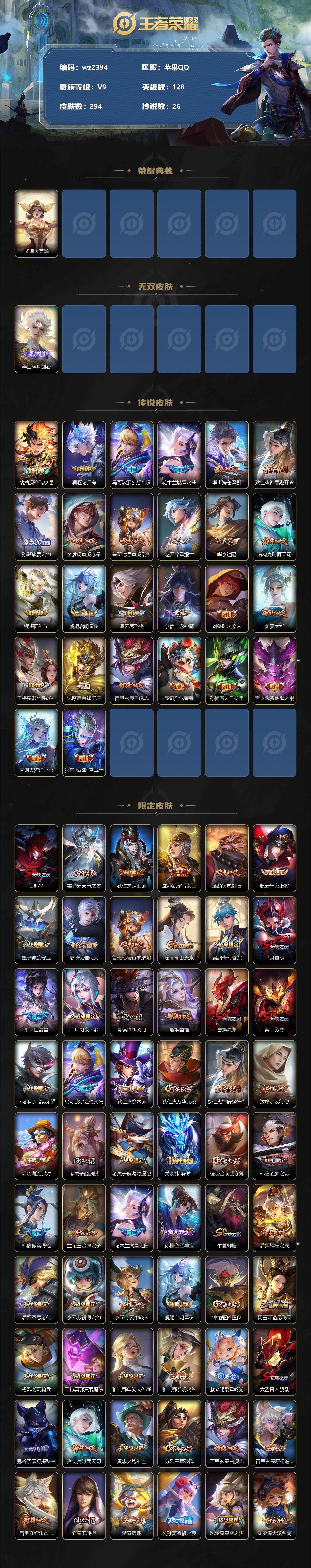 【游戏多多】【王者荣耀】【编号:3339664】【可二次实名】【wz2394】苹果Q-V9-至尊星耀III段位-128英雄-294皮肤-0典藏-0珍品无双-1无双-0珍品传说-26传说-84史诗 【英雄全皮】:孙权全皮,空空儿全皮,影全皮,海诺全皮 【荣耀典藏】:武则天英雄 【无双皮肤】:李白碎月剑心 【传说皮肤】:裴擒虎祥瑞亨通,澜逐花归海,马可波罗妄想实况,花木兰燃星之曲,曜山海苍雷引,狄仁杰神器狴犴令,孙策挚爱之约,裴擒虎寅虎赤拳,鲁班七号寅虎瑞焰,赵云淬星耀世,曜李逍遥 ,诸葛亮时雨天司,镜炽阳神光,虞姬启明星使,曜云鹰飞将,李信一念神魔,刘备时之恋人,伽罗太华,干将莫邪久胜战神,达摩黄金狮子座,百里玄策白虎志,梦奇胖达荣荣,孙尚香末日机甲,宫本武藏地狱之眼,武则天海洋之心,狄仁杰超时空战士 【限定皮肤】:白起狰,姜子牙天穹之誓,狄仁杰阴阳师,虞姬凯尔特女王,廉颇寅虎御盾,赵云皇家上将,墨子神迹守卫,嬴政优雅恋人,鲁班七号寅虎瑞焰,庄周高山流水,扁鹊奇幻香踪,芈月重明,芈月白晶晶,芈月幻夜卜梦,夏侯惇朔风刀,甄姬幽恒,曹操烛龙,典韦穷奇,马可波罗暗影游猎,马可波罗妄想实况,狄仁杰魔术师,狄仁杰万华元夜,狄仁杰神器狴犴令,达摩沙漠行僧,项羽海滩派对,老夫子醍醐杖,老夫子航海奇遇记,关羽冰锋战神,程咬金演武夺筹,韩信逐梦之影,韩信傲雪梅枪,兰陵王金庭之子,花木兰燃星之曲,孙悟空至尊宝,牛魔御旌,后羿辉光之辰,后羿圣弓游侠,李元芳银河之约,李元芳云中旅人,虞姬启明星使,钟馗驱傩正仪,杨玉环遇见飞天,杨戬潮玩骑兵,干将莫邪真爱魔法,雅典娜单词大作战,雅典娜黎明之约,蔡文姬繁星吟游,太乙真人饕餮,鬼谷子原初探秘者,诸葛亮时雨天司,黄忠火炮绅士,苏烈千军破阵,百里玄策白虎志,百里玄策原初追逐者,百里守约朱雀志,弈星混沌棋,梦奇顽趣,公孙离蜜橘之夏,沈梦溪星空之诺,沈梦溪大漠名商,明世隐疑决卦,裴擒虎李小龙,裴擒虎寅虎赤拳,裴擒虎擒涛扼浪,狂铁御狮,米莱狄御霄,云中君纤云弄巧,伽罗太华,盾山御銮,孙策挚爱之约,上官婉儿梁祝,嫦娥拒霜思,曜李逍遥 ,曜山海苍雷引,蒙犽狂想玩偶喵,鲁班大师探海日志,镜匿光追影者,桑启海盐诗旅,艾琳流音漫舞,司空震地狱燃心,张良古海寻踪,蒙恬荣光圣徽,高渐离燃音魔法,妲己灵卜魔法,鬼谷子天穹祈灯,李白碎月剑心,刘邦剑破天穹,海诺心动手记,刘备异域游侠 【年限皮肤】:百里玄策白虎志,百里守约朱雀志,裴擒虎寅虎赤拳,鲁班七号寅虎瑞焰,廉颇寅虎御盾,后羿辉光之辰,诸葛亮时雨天司,伽罗太华,甄姬幽恒,马超神威,曜山海苍雷引 【赛季限定】:白起狰,芈月重明,夏侯惇朔风刀,曹操烛龙,典韦穷奇,狄仁杰万华元夜,达摩沙漠行僧,老夫子醍醐杖,程咬金演武夺筹,兰陵王金庭之子,张良古海寻踪,牛魔御旌,李元芳云中旅人,虞姬凯尔特女王,钟馗驱傩正仪,雅典娜黎明之约,太乙真人饕餮,鬼谷子原初探秘者,苏烈千军破阵,百里玄策原初追逐者,弈星混沌棋,梦奇顽趣,沈梦溪大漠名商,明世隐疑决卦,裴擒虎擒涛扼浪,狂铁御狮,米莱狄御霄,盾山御銮,鲁班大师探海日志,桑启海盐诗旅,鬼谷子天穹祈灯,蒙恬荣光圣徽,刘邦剑破天穹,姜子牙天穹之誓 【战令限定】:墨子神迹守卫,扁鹊奇幻香踪,芈月幻夜卜梦,马可波罗暗影游猎,老夫子航海奇遇记,艾琳流音漫舞,后羿圣弓游侠,李元芳银河之约,杨戬潮玩骑兵,干将莫邪真爱魔法,雅典娜单词大作战,黄忠火炮绅士,沈梦溪星空之诺,蒙犽狂想玩偶喵,司空震地狱燃心,高渐离燃音魔法,妲己灵卜魔法 【史诗皮肤】:鲁班七号电玩小子,露娜紫霞仙子,阿轲暗夜猫娘,赵云皇家上将,貂蝉圣诞恋歌,甄姬冰雪圆舞曲,王昭君偶像歌手,狄仁杰魔术师,廉颇地狱岩魂,宫本武藏鬼剑武藏,孙尚香水果甜心,嬴政优雅恋人,嬴政摇滚巨星,妲己魅力维加斯,妲己女仆咖啡,墨子龙骑士,墨子金属风暴,吕布圣诞狂欢,曹操幽灵船长,李白千年之狐,张飞乱世虎臣,关羽冰锋战神,孙悟空至尊宝,花木兰水晶猎龙者,刘邦德古拉伯爵,韩信逐梦之影,夏侯惇乘风破浪,小乔缤纷独角兽,兰陵王暗隐猎兽者,诸葛亮黄金分割率,亚瑟心灵战警,安琪拉心灵骇客,后羿辉光之辰,刘禅天才门将,公孙离蜜橘之夏,李元芳逐浪之夏,程咬金功夫厨神,阿轲节奏热浪,杨玉环遇见飞天,孙策猫狗日记,百里守约朱雀志,狄仁杰鹰眼统帅,上官婉儿梁祝,蔡文姬繁星吟游,李元芳银河之约,娜可露露晚萤,甄姬幽恒,不知火舞魅语,橘右京修罗,马超神威,马可波罗暗影游猎,蒙犽狂想玩偶喵,百里玄策原初追逐者,裴擒虎李小龙,云中君纤云弄巧,芈月白晶晶,百里玄策热力回旋,蒙犽龙鼓争鸣,老夫子航海奇遇记,干将莫邪真爱魔法,安琪拉时之奇旅,庄周高山流水,司马懿暗渊魔法,嫦娥拒霜思,镜匿光追影者,黄忠火炮绅士,雅典娜黎明之约,韩信傲雪梅枪,廉颇寅虎御盾,夏洛特永昼,弈星滕王阁序,梦奇顽趣,扁鹊奇幻香踪,莱西奥末日机甲,司空