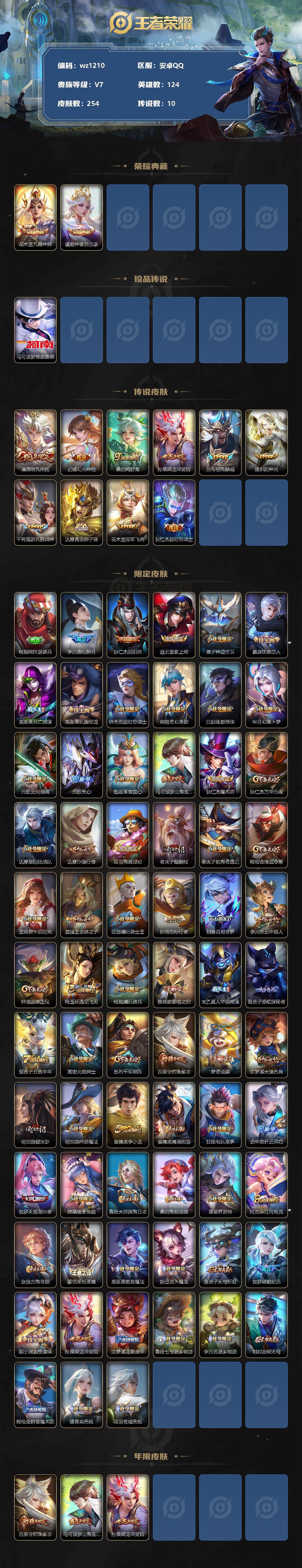 【游戏多多】【王者荣耀】【编号:3339667】【可二次实名】【wz1210】【商品标题】:安卓Q-V7-永恒钻石IV段位-124英雄-254皮肤-2典藏-0珍品无双-0无双-1珍品传说-10传说-75史诗 【荣耀典藏】:花木兰九霄神辉,虞姬神鉴启示录 【珍品传说】:马可波罗怪盗基德 【传说皮肤】:澜愿照九州拓,云缨幻光神枪,桑启鸣野蒿,孙策乘龙淬吴钩,吕布怒海麟威,镜炽阳神光,干将莫邪久胜战神,达摩黄金狮子座,花木兰冠军飞将,狄仁杰超时空战士 【限定皮肤】:杨戬破阵退雄兵,李白谪仙醉月,狄仁杰阴阳师,赵云皇家上将,墨子神迹守卫,嬴政优雅恋人,高渐离死亡摇滚,高渐离玩趣恶龙,钟无艳超时空战士,扁鹊奇幻香踪,白起夜都怪侠,芈月幻夜卜梦,元歌云间偶戏,元歌无心,甄姬落雪兰心,马可波罗山海玄木吟,狄仁杰魔术师,狄仁杰万华元夜,达摩星际陆战队,达摩沙漠行僧,项羽海滩派对,老夫子醍醐杖,老夫子航海奇遇记,程咬金演武夺筹,王昭君午后时光,兰陵王金庭之子,亚瑟潮玩骑士王,孙悟空孙行者,刘备百相守梦,李元芳云中旅人,钟馗驱傩正仪,杨玉环遇见飞天,杨戬潮玩骑兵,雅典娜黎明之约,太乙真人华丽摇滚,鬼谷子原初探秘者,鬼谷子五谷丰年,黄忠火炮绅士,苏烈千军破阵,百里守约朱雀志,梦奇顽趣,沈梦溪大漠名商,明世隐疑决卦,明世隐吟游魔法,裴擒虎李小龙,裴擒虎擒涛扼浪,狂铁电玩高手,云中君纤云弄巧,伽罗天狼溯光者,嫦娥暖冬兔眠,鲁班大师探海日志,桑启海盐诗旅,暃星界游侠,阿古朵江河有灵,张良古海寻踪,蒙恬荣光圣徽,高渐离燃音魔法,妲己灵卜魔法,鬼谷子天穹祈灯,伽罗琥珀纪元,姬小满妄想食味,孙策乘龙淬吴钩,沈梦溪龙舞盛年,鲁班七号蔬乡物语,李元芳蔬乡物语,刘邦剑破天穹,程咬金群星魔术团,镜青焰无极,项羽苍威无极 【年限皮肤】:百里守约朱雀志,马可波罗山海玄木吟,孙策乘龙淬吴钩 【赛季限定】:狄仁杰万华元夜,达摩沙漠行僧,老夫子醍醐杖,程咬金演武夺筹,兰陵王金庭之子,张良古海寻踪,李元芳云中旅人,钟馗驱傩正仪,雅典娜黎明之约,鬼谷子原初探秘者,苏烈千军破阵,梦奇顽趣,沈梦溪大漠名商,明世隐疑决卦,裴擒虎擒涛扼浪,鲁班大师探海日志,桑启海盐诗旅,鬼谷子天穹祈灯,蒙恬荣光圣徽,刘邦剑破天穹 【战令限定】:墨子神迹守卫,钟无艳超时空战士,扁鹊奇幻香踪,白起夜都怪侠,芈月幻夜卜梦,元歌云间偶戏,甄姬落雪兰心,达摩星际陆战队,老夫子航海奇遇记,王昭君午后时光,亚瑟潮玩骑士王,杨戬潮玩骑兵,黄忠火炮绅士,明世隐吟游魔法,狂铁电玩高手,嫦娥暖冬兔眠,暃星界游侠,高渐离燃音魔法,妲己灵卜魔法,鲁班七号蔬乡物语,李元芳蔬乡物语,镜青焰无极,项羽苍威无极 【史诗皮肤】:鲁班七号电玩小子,露娜紫霞仙子,阿轲暗夜猫娘,赵云皇家上将,赵云未来纪元,貂蝉圣诞恋歌,甄姬冰雪圆舞曲,王昭君偶像歌手,狄仁杰魔术师,廉颇地狱岩魂,宫本武藏鬼剑武藏,孙尚香水果甜心,嬴政优雅恋人,嬴政暗夜贵公子,嬴政摇滚巨星,妲己魅力维加斯,妲己女仆咖啡,墨子金属风暴,吕布圣诞狂欢,刘禅绅士熊喵,曹操幽灵船长,吕布末日机甲,张飞乱世虎臣,花木兰水晶猎龙者,刘邦德古拉伯爵,夏侯惇乘风破浪,兰陵王暗隐猎兽者,诸葛亮黄金分割率,亚瑟心灵战警,雅典娜冰冠公主,安琪拉心灵骇客,百里守约特工魅影,铠曙光守护者,刘禅天才门将,李元芳逐浪之夏,程咬金功夫厨神,白起星夜王子,阿轲节奏热浪,杨玉环遇见飞天,孙策猫狗日记,百里守约朱雀志,狄仁杰鹰眼统帅,不知火舞魅语,裴擒虎李小龙,云中君纤云弄巧,元歌云间偶戏,老夫子航海奇遇记,伽罗天狼溯光者,杨戬天秀启明,沈梦溪月团寄思,孙悟空孙行者,黄忠火炮绅士,雅典娜黎明之约,明世隐吟游魔法,狂铁电玩高手,钟无艳超时空战士,鬼谷子五谷丰年,元歌无心,梦奇顽趣,暃星界游侠,马可波罗山海玄木吟,扁鹊奇幻香踪,刘备百相守梦,阿古朵江河有灵,妲己灵卜魔法,高渐离燃音魔法,蒙恬荣光圣徽,伽罗琥珀纪元,姬小满妄想食味,鲁班七号蔬乡物语,镜青焰无极,李白谪仙醉月,牛魔星界战将,赵怀真器灵浮梦炉,阿轲化蝶舞,后羿石田雨龙 【其他皮肤】:项羽海滩派对,韩信教廷特使,韩信街头霸王,露娜哥特玫瑰,达摩大发明家,赵云忍炎影,程咬金星际陆战队,程咬金爱与正义,白起白色死神,牛魔西部大镖客,扁鹊化身博士,宫本武藏未来纪元,安琪拉玩偶对对碰,孙膑天使之翼,妲己少女阿狸,典韦黄金武士,亚瑟死亡骑士,达摩拳王,花木兰兔女郎,张飞五福同心,甄姬花好人间,狄仁杰阴阳师,高渐离死亡摇滚,刘备汉昭烈帝,李元芳黑猫爱糖果,关羽龙腾万里,钟无艳海滩丽影,王昭君幻想奇妙夜,狂铁命运角斗场,老夫子功夫老勺,孙尚香沉稳之力,诸葛亮掌控之力,李白敏锐之力,鬼谷子幻乐之宴,太乙真人华丽摇滚,苏烈坚韧之力,大乔守护之力,明世隐虹云星官,庄周奇妙博物学,小乔丁香结,吕布野性能量,高渐离玩趣恶龙,沈梦溪鲨炮海盗猫,姜