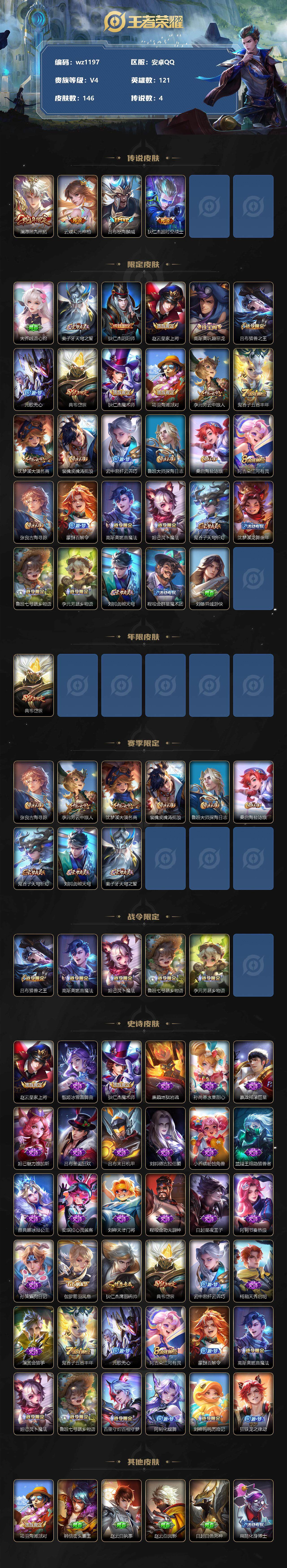 【游戏多多】【王者荣耀】【编号:3339671】【可二次实名】【wz1197】【商品标题】:安卓Q-V4-永恒钻石II段位-121英雄-146皮肤-0典藏-0珍品无双-0无双-0珍品传说-4传说-35史诗 【传说皮肤】:澜愿照九州拓,云缨幻光神枪,吕布怒海麟威,狄仁杰超时空战士 【限定皮肤】:大乔绒语心约,姜子牙天穹之誓,狄仁杰阴阳师,赵云皇家上将,高渐离玩趣恶龙,吕布猎兽之王,元歌无心,典韦岱宗,狄仁杰魔术师,项羽海滩派对,李元芳云中旅人,鬼谷子五谷丰年,沈梦溪大漠名商,裴擒虎擒涛扼浪,云中君纤云弄巧,鲁班大师探海日志,桑启海盐诗旅,阿古朵江河有灵,张良古海寻踪,蒙犽百解令,高渐离燃音魔法,妲己灵卜魔法,鬼谷子天穹祈灯,沈梦溪龙舞盛年,鲁班七号蔬乡物语,李元芳蔬乡物语,刘邦剑破天穹,程咬金群星魔术团,刘备异域游侠 【年限皮肤】:典韦岱宗 【赛季限定】:张良古海寻踪,李元芳云中旅人,沈梦溪大漠名商,裴擒虎擒涛扼浪,鲁班大师探海日志,桑启海盐诗旅,鬼谷子天穹祈灯,刘邦剑破天穹,姜子牙天穹之誓 【战令限定】:吕布猎兽之王,高渐离燃音魔法,妲己灵卜魔法,鲁班七号蔬乡物语,李元芳蔬乡物语 【史诗皮肤】:赵云皇家上将,甄姬冰雪圆舞曲,狄仁杰魔术师,廉颇地狱岩魂,孙尚香水果甜心,嬴政摇滚巨星,妲己魅力维加斯,吕布圣诞狂欢,吕布末日机甲,刘邦德古拉伯爵,小乔缤纷独角兽,兰陵王暗隐猎兽者,雅典娜冰冠公主,安琪拉心灵骇客,刘禅天才门将,程咬金功夫厨神,白起星夜王子,阿轲节奏热浪,孙策猫狗日记,伽罗箭羽风息,狄仁杰鹰眼统帅,典韦岱宗,云中君纤云弄巧,杨戬天秀启明,澜赏金猎手,鬼谷子五谷丰年,元歌无心,阿古朵江河有灵,蒙犽百解令,妲己灵卜魔法,高渐离燃音魔法,鲁班七号蔬乡物语,百里守约百相守梦,阿轲化蝶舞,刘禅鸭鸭历险记,狂铁龙之律动 【其他皮肤】:项羽海滩派对,韩信街头霸王,赵云白执事,赵云忍炎影,白起白色死神,扁鹊化身博士,宫本武藏未来纪元,安琪拉玩偶对对碰,亚瑟死亡骑士,达摩拳王,张飞五福同心,甄姬花好人间,宫本武藏万象初新,狄仁杰阴阳师,刘备汉昭烈帝,老夫子功夫老勺,孙尚香沉稳之力,鬼谷子幻乐之宴,大乔守护之力,吕布猎兽之王,吕布野性能量,高渐离玩趣恶龙,姜子牙炽热元素使,狂铁特工战影,刘禅秘密基地,杨戬次元傲视,马可波罗潮玩牛仔,刘禅唤灵魔甲,沈梦溪大漠名商,蒙恬蔚蓝守将,李元芳云中旅人,桑启海盐诗旅,猪八戒潮玩探月行,白起乐园追猎者,赵怀真太极少年,裴擒虎擒涛扼浪,太乙真人劲辣红锅,鲁班大师探海日志,姬小满零食大作战,李元芳妄想特派,哪吒热血海滩,张良古海寻踪,钟无艳聚星闪耀,亚连破局者,兰陵王幻夜行动,曹操决胜大满贯,后羿完美运算,鬼谷子天穹祈灯,妲己灵卜魔法,嫦娥漠中幻影,廉颇功夫炙烤,亚瑟鸿运当头,沈梦溪龙舞盛年,钟无艳春野之旅,李元芳蔬乡物语,扁鹊无尽旅途,刘邦剑破天穹,盘古经纬探寻者,程咬金群星魔术团,大司命暗都幽影,刘备异域游侠,貂蝉长夏之忆,姜子牙天穹之誓,大乔绒语心约,东皇太一噬灭天穹,老夫子百相守梦,干将莫邪雾都夜雨,吕布逐霄战戟,苍苍林狼骑,太乙真人谧流熔炉,典韦铁骨偃魂,影魅影绮裳,西施雪境奇遇,姜子牙星梦巡礼,东皇太一金福满堂,达摩爆裂喵拳,少司缘灵卦秘语,戈娅玫蓝誓约,刘备浪漫序章,钟馗虚灵犬护,沈梦溪鸭鸭历险记,苏烈春野闲踪,小乔秘证寻踪,张良灵野札记,阿古朵布丁狗之约,露娜命运加冕,雅典娜潮玩士官长,姬小满小满鸭,白起死霸装,貂蝉异域舞娘,孙膑未来旅行,孙悟空西部大镖客,后羿精灵王,马可波罗激情绿茵,苍维京掠夺者,杨戬埃及法老,诸葛亮星航指挥官,黄忠芝加哥教父,百里守约绝影神枪,百里玄策威尼斯狂欢,元歌午夜歌剧院,李信灼热之刃,盘古创世神祝,镜冰刃幻境,阿古朵熊喵少女,澜孤猎,司空震启蛰 【内测皮肤】:高渐离玩趣恶龙,狂铁特工战影 【营地ID】:1774868358