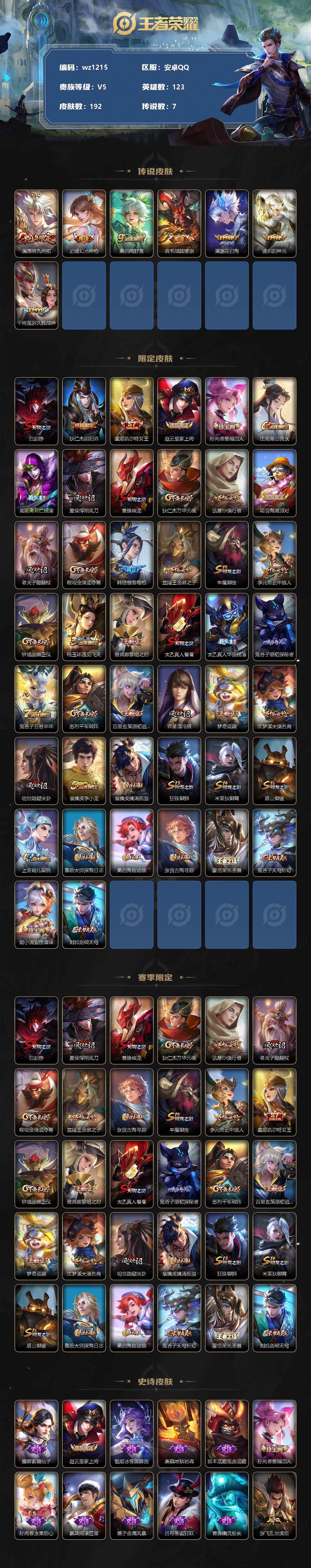 【游戏多多】【王者荣耀】【编号:3339673】【可二次实名】【wz1215】【商品标题】:安卓Q-V5-最强王者段位-123英雄-192皮肤-0典藏-0珍品无双-0无双-0珍品传说-7传说-38史诗 【传说皮肤】:澜愿照九州拓,云缨幻光神枪,桑启鸣野蒿,典韦战鼓燎原,澜逐花归海,镜炽阳神光,干将莫邪久胜战神 【限定皮肤】:白起狰,狄仁杰阴阳师,虞姬凯尔特女王,赵云皇家上将,孙尚香蔷薇恋人,庄周高山流水,高渐离死亡摇滚,夏侯惇朔风刀,曹操烛龙,狄仁杰万华元夜,达摩沙漠行僧,项羽海滩派对,老夫子醍醐杖,程咬金演武夺筹,韩信傲雪梅枪,兰陵王金庭之子,牛魔御旌,李元芳云中旅人,钟馗驱傩正仪,杨玉环遇见飞天,雅典娜黎明之约,太乙真人饕餮,太乙真人华丽摇滚,鬼谷子原初探秘者,鬼谷子五谷丰年,苏烈千军破阵,百里玄策原初追逐者,弈星混沌棋,梦奇顽趣,沈梦溪大漠名商,明世隐疑决卦,裴擒虎李小龙,裴擒虎擒涛扼浪,狂铁御狮,米莱狄御霄,盾山御銮,上官婉儿梁祝,鲁班大师探海日志,桑启海盐诗旅,张良古海寻踪,蒙恬荣光圣徽,鬼谷子天穹祈灯,姬小满妄想食味,刘邦剑破天穹 【赛季限定】:白起狰,夏侯惇朔风刀,曹操烛龙,狄仁杰万华元夜,达摩沙漠行僧,老夫子醍醐杖,程咬金演武夺筹,兰陵王金庭之子,张良古海寻踪,牛魔御旌,李元芳云中旅人,虞姬凯尔特女王,钟馗驱傩正仪,雅典娜黎明之约,太乙真人饕餮,鬼谷子原初探秘者,苏烈千军破阵,百里玄策原初追逐者,弈星混沌棋,梦奇顽趣,沈梦溪大漠名商,明世隐疑决卦,裴擒虎擒涛扼浪,狂铁御狮,米莱狄御霄,盾山御銮,鲁班大师探海日志,桑启海盐诗旅,鬼谷子天穹祈灯,蒙恬荣光圣徽,刘邦剑破天穹 【史诗皮肤】:露娜紫霞仙子,赵云皇家上将,甄姬冰雪圆舞曲,廉颇地狱岩魂,宫本武藏鬼剑武藏,孙尚香蔷薇恋人,孙尚香水果甜心,嬴政摇滚巨星,墨子金属风暴,吕布圣诞狂欢,曹操幽灵船长,张飞乱世虎臣,花木兰水晶猎龙者,兰陵王暗隐猎兽者,亚瑟心灵战警,白起星夜王子,阿轲节奏热浪,杨玉环遇见飞天,孙策猫狗日记,狄仁杰鹰眼统帅,上官婉儿梁祝,橘右京修罗,百里玄策原初追逐者,裴擒虎李小龙,钟馗乐园奇幻夜,庄周高山流水,雅典娜黎明之约,韩信傲雪梅枪,鬼谷子五谷丰年,梦奇顽趣,蒙恬荣光圣徽,姬小满妄想食味,百里守约百相守梦,牛魔星界战将,孙膑茶境仙,狂铁龙之律动,黄忠百相守梦,公孙离涂山容容 【其他皮肤】:项羽海滩派对,韩信教廷特使,韩信街头霸王,露娜哥特玫瑰,阿轲爱心护理,达摩大发明家,赵云白执事,赵云忍炎影,程咬金星际陆战队,白起白色死神,安琪拉玩偶对对碰,孙膑天使之翼,妲己少女阿狸,典韦黄金武士,亚瑟死亡骑士,花木兰兔女郎,张飞五福同心,甄姬花好人间,宫本武藏万象初新,后羿阿尔法小队,狄仁杰阴阳师,刘备纽约教父,高渐离死亡摇滚,刘备汉昭烈帝,关羽龙腾万里,虞姬凯尔特女王,白起狰,钟无艳海滩丽影,太乙真人饕餮,宫本武藏霸王丸,曹操烛龙,王昭君幻想奇妙夜,老夫子功夫老勺,鬼谷子幻乐之宴,狂铁御狮,太乙真人华丽摇滚,苏烈坚韧之力,米莱狄御霄,明世隐虹云星官,牛魔御旌,小乔丁香结,吕布野性能量,盾山御銮,孙膑归虚梦演,沈梦溪鲨炮海盗猫,夏侯惇朔风刀,弈星混沌棋,哪吒次元突破,明世隐疑决卦,盾山圆桌骑士,老夫子醍醐杖,鬼谷子原初探秘者,狄仁杰万华元夜,刘禅秘密基地,杨戬次元傲视,程咬金演武夺筹,张良缤纷绘卷,钟馗驱傩正仪,鲁班大师乓乓大师,苏烈千军破阵,达摩沙漠行僧,程咬金无双福将,兰陵王金庭之子,沈梦溪大漠名商,蒙恬蔚蓝守将,李元芳云中旅人,桑启海盐诗旅,猪八戒潮玩探月行,赵怀真太极少年,裴擒虎擒涛扼浪,鲁班大师探海日志,姬小满零食大作战,李元芳妄想特派,张良古海寻踪,后羿完美运算,鬼谷子天穹祈灯,嫦娥漠中幻影,廉颇功夫炙烤,刘邦剑破天穹,东皇太一噬灭天穹,老夫子百相守梦,干将莫邪雾都夜雨,吕布逐霄战戟,苍苍林狼骑,太乙真人谧流熔炉,典韦铁骨偃魂,马超访茗客,西施雪境奇遇,姜子牙星梦巡礼,少司缘灵卦秘语,明世隐景韶洛都,戈娅玫蓝誓约,刘备浪漫序章,钟馗虚灵犬护,苏烈春野闲踪,张良灵野札记,露娜命运加冕,甄姬逆浪荇歌,莱西奥踏浪烽翎,鲁班七号福禄兄弟,鲁班七号木偶奇遇记,高渐离金属狂潮,钟无艳生化警戒,貂蝉异域舞娘,花木兰剑舞者,王昭君精灵公主,曹操超能战警,张良一千零一夜,孙悟空西部大镖客,周瑜海军大将,后羿精灵王,李白范海辛,李元芳特种部队,虞姬加勒比小姐,关羽天启骑士,马可波罗激情绿茵,苍维京掠夺者,杨戬埃及法老,哪吒三太子,黄忠芝加哥教父,东皇太一东海龙王,干将莫邪第七人偶,鬼谷子阿摩司公爵,百里守约绝影神枪,梦奇美梦成真,公孙离花间舞,杨玉环霓裳曲,裴擒虎街头旋风,弈星踏雪寻梅,元歌午夜歌剧院,孙策海之征途,伽罗花见巫女,沈梦溪棒球奇才,李信灼热之刃,猪八戒年年有余,盘古创世神祝,云中君荷鲁斯之眼,曜归虚梦演,西施归