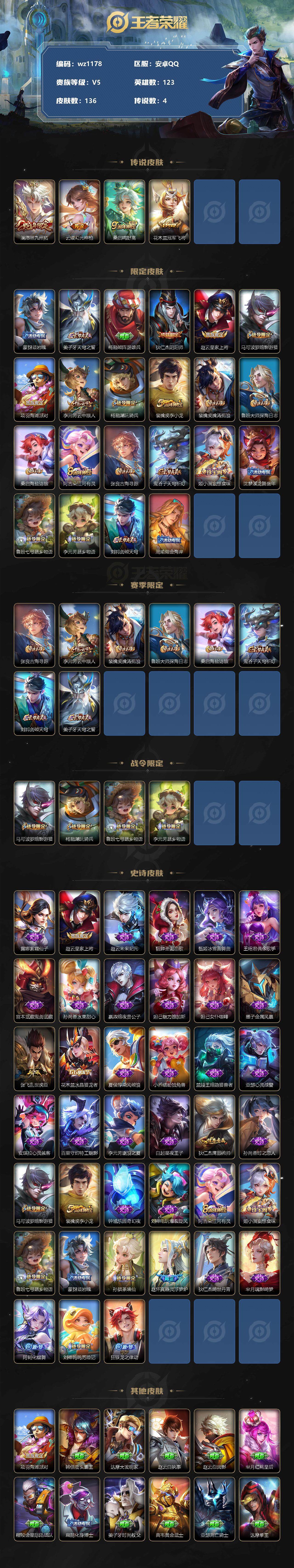 【游戏多多】【王者荣耀】【编号:3339684】【可二次实名】【wz1178】【商品标题】:安卓Q-V5-至尊星耀III段位-123英雄-136皮肤-0典藏-0珍品无双-0无双-0珍品传说-4传说-39史诗 【传说皮肤】:澜愿照九州拓,云缨幻光神枪,桑启鸣野蒿,花木兰冠军飞将 【限定皮肤】:蒙犽顽岩魄,姜子牙天穹之誓,杨戬破阵退雄兵,狄仁杰阴阳师,赵云皇家上将,马可波罗暗影游猎,项羽海滩派对,李元芳云中旅人,杨戬潮玩骑兵,裴擒虎李小龙,裴擒虎擒涛扼浪,鲁班大师探海日志,桑启海盐诗旅,阿古朵江河有灵,张良古海寻踪,鬼谷子天穹祈灯,姬小满妄想食味,沈梦溪龙舞盛年,鲁班七号蔬乡物语,李元芳蔬乡物语,刘邦剑破天穹,周瑜熔金海岸 【赛季限定】:张良古海寻踪,李元芳云中旅人,裴擒虎擒涛扼浪,鲁班大师探海日志,桑启海盐诗旅,鬼谷子天穹祈灯,刘邦剑破天穹,姜子牙天穹之誓 【战令限定】:马可波罗暗影游猎,杨戬潮玩骑兵,鲁班七号蔬乡物语,李元芳蔬乡物语 【史诗皮肤】:露娜紫霞仙子,赵云皇家上将,赵云未来纪元,貂蝉圣诞恋歌,甄姬冰雪圆舞曲,王昭君偶像歌手,宫本武藏鬼剑武藏,孙尚香水果甜心,嬴政暗夜贵公子,妲己魅力维加斯,妲己女仆咖啡,墨子金属风暴,张飞乱世虎臣,花木兰水晶猎龙者,夏侯惇乘风破浪,小乔缤纷独角兽,兰陵王暗隐猎兽者,亚瑟心灵战警,安琪拉心灵骇客,百里守约特工魅影,李元芳逐浪之夏,白起星夜王子,狄仁杰鹰眼统帅,孙尚香时之恋人,马可波罗暗影游猎,裴擒虎李小龙,钟馗乐园奇幻夜,刘禅电玩爆裂旋风,阿古朵江河有灵,姬小满妄想食味,鲁班七号蔬乡物语,蒙犽顽岩魄,孙膑茶境仙,赵怀真器灵浮梦炉,狄仁杰绮世丹青,芈月瑰影绮梦,阿轲化蝶舞,刘禅鸭鸭历险记,狂铁龙之律动 【其他皮肤】:项羽海滩派对,韩信街头霸王,达摩大发明家,赵云白执事,赵云忍炎影,芈月红桃皇后,程咬金星际陆战队,扁鹊化身博士,姜子牙时尚教父,典韦黄金武士,亚瑟死亡骑士,达摩拳王,花木兰兔女郎,刘备万事如意,宫本武藏万象初新,后羿阿尔法小队,狄仁杰阴阳师,刘备汉昭烈帝,关羽龙腾万里,王昭君幻想奇妙夜,老夫子功夫老勺,孙尚香沉稳之力,诸葛亮掌控之力,李白敏锐之力,鬼谷子幻乐之宴,苏烈坚韧之力,明世隐虹云星官,小乔丁香结,哪吒次元突破,狂铁特工战影,鲁班大师乓乓大师,程咬金无双福将,李元芳云中旅人,桑启海盐诗旅,猪八戒潮玩探月行,裴擒虎擒涛扼浪,杨戬潮玩骑兵,太乙真人劲辣红锅,鲁班大师探海日志,李元芳妄想特派,哪吒热血海滩,张良古海寻踪,亚连破局者,后羿完美运算,鬼谷子天穹祈灯,嫦娥漠中幻影,廉颇功夫炙烤,沈梦溪龙舞盛年,钟无艳春野之旅,李元芳蔬乡物语,刘邦剑破天穹,大司命暗都幽影,杨戬破阵退雄兵,姜子牙天穹之誓,周瑜熔金海岸,盘古敬我三分,东皇太一噬灭天穹,干将莫邪雾都夜雨,苍苍林狼骑,太乙真人谧流熔炉,典韦铁骨偃魂,马超访茗客,西施雪境奇遇,姜子牙星梦巡礼,明世隐景韶洛都,戈娅玫蓝誓约,刘备浪漫序章,钟馗虚灵犬护,沈梦溪鸭鸭历险记,苏烈春野闲踪,张良灵野札记,阿古朵布丁狗之约,露娜命运加冕,雅典娜潮玩士官长,姬小满小满鸭,白起死霸装,鲁班七号木偶奇遇记,露娜绯红之刃,孙悟空西部大镖客,后羿精灵王,关羽天启骑士,马可波罗激情绿茵,苍维京掠夺者,百里守约绝影神枪,明世隐占星师,公孙离花间舞,米莱狄精准探案法,元歌午夜歌剧院,伽罗花见巫女,瑶森,马超幸存者,澜孤猎,云缨赤焰之缨 【内测皮肤】:狂铁特工战影 【营地ID】:1767436973