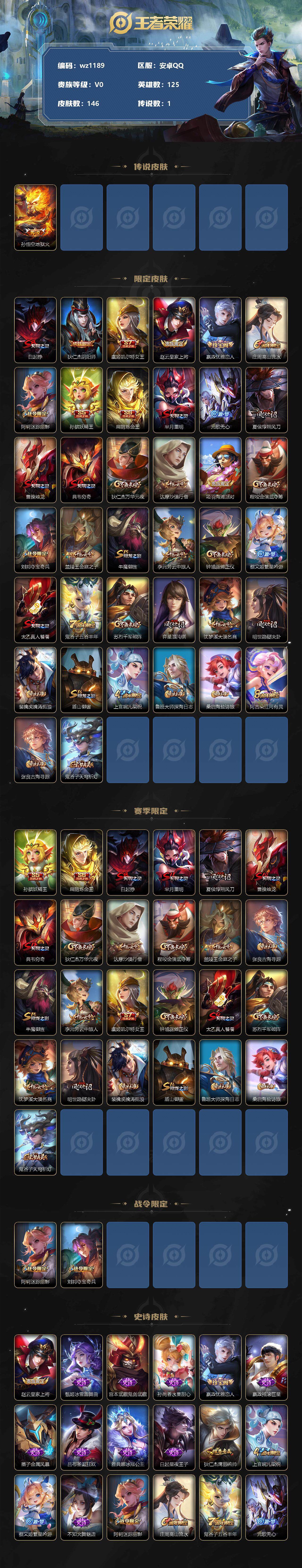 【游戏多多】【王者荣耀】【编号:3339695】【可二次实名】【wz1189】【商品标题】:安卓Q-V0-至尊星耀III段位-125英雄-146皮肤-0典藏-0珍品无双-0无双-0珍品传说-1传说-19史诗 【传说皮肤】:孙悟空地狱火 【限定皮肤】:白起狰,狄仁杰阴阳师,虞姬凯尔特女王,赵云皇家上将,嬴政优雅恋人,庄周高山流水,阿轲迷踪丽影,孙膑妖精王,扁鹊炼金王,芈月重明,元歌无心,夏侯惇朔风刀,曹操烛龙,典韦穷奇,狄仁杰万华元夜,达摩沙漠行僧,项羽海滩派对,程咬金演武夺筹,刘邦夺宝奇兵,兰陵王金庭之子,牛魔御旌,李元芳云中旅人,钟馗驱傩正仪,蔡文姬繁星吟游,太乙真人饕餮,鬼谷子五谷丰年,苏烈千军破阵,弈星混沌棋,沈梦溪大漠名商,明世隐疑决卦,裴擒虎擒涛扼浪,盾山御銮,上官婉儿梁祝,鲁班大师探海日志,桑启海盐诗旅,阿古朵江河有灵,张良古海寻踪,鬼谷子天穹祈灯 【赛季限定】:孙膑妖精王,扁鹊炼金王,白起狰,芈月重明,夏侯惇朔风刀,曹操烛龙,典韦穷奇,狄仁杰万华元夜,达摩沙漠行僧,程咬金演武夺筹,兰陵王金庭之子,张良古海寻踪,牛魔御旌,李元芳云中旅人,虞姬凯尔特女王,钟馗驱傩正仪,太乙真人饕餮,苏烈千军破阵,弈星混沌棋,沈梦溪大漠名商,明世隐疑决卦,裴擒虎擒涛扼浪,盾山御銮,鲁班大师探海日志,桑启海盐诗旅,鬼谷子天穹祈灯 【战令限定】:阿轲迷踪丽影,刘邦夺宝奇兵 【史诗皮肤】:赵云皇家上将,甄姬冰雪圆舞曲,宫本武藏鬼剑武藏,孙尚香水果甜心,嬴政优雅恋人,嬴政摇滚巨星,墨子金属风暴,吕布圣诞狂欢,雅典娜冰冠公主,白起星夜王子,狄仁杰鹰眼统帅,上官婉儿梁祝,蔡文姬繁星吟游,不知火舞魅语,阿轲迷踪丽影,庄周高山流水,鬼谷子五谷丰年,元歌无心,阿古朵江河有灵 【其他皮肤】:项羽海滩派对,韩信教廷特使,韩信街头霸王,阿轲致命风华,达摩大发明家,赵云忍炎影,白起白色死神,扁鹊化身博士,安琪拉玩偶对对碰,姜子牙时尚教父,妲己少女阿狸,典韦黄金武士,亚瑟死亡骑士,花木兰兔女郎,张飞五福同心,甄姬花好人间,宫本武藏万象初新,狄仁杰阴阳师,刘备纽约教父,孙膑妖精王,扁鹊炼金王,关羽龙腾万里,虞姬凯尔特女王,白起狰,钟无艳海滩丽影,太乙真人饕餮,宫本武藏霸王丸,曹操烛龙,芈月重明,老夫子功夫老勺,孙尚香沉稳之力,典韦穷奇,诸葛亮掌控之力,鬼谷子幻乐之宴,苏烈坚韧之力,大乔守护之力,项羽科学大爆炸,明世隐虹云星官,牛魔御旌,小乔丁香结,吕布野性能量,盾山御銮,沈梦溪鲨炮海盗猫,姜子牙炽热元素使,夏侯惇朔风刀,弈星混沌棋,哪吒次元突破,明世隐疑决卦,刘邦夺宝奇兵,盾山圆桌骑士,狂铁特工战影,狄仁杰万华元夜,刘禅秘密基地,程咬金演武夺筹,钟馗驱傩正仪,鲁班大师乓乓大师,苏烈千军破阵,典韦铁甲之心,妲己紫罗兰之誓,达摩沙漠行僧,程咬金无双福将,兰陵王金庭之子,刘禅唤灵魔甲,沈梦溪大漠名商,李元芳云中旅人,戈娅危途狂花,刘备潮玩造梦师,桑启海盐诗旅,猪八戒潮玩探月行,白起乐园追猎者,赵怀真太极少年,裴擒虎擒涛扼浪,太乙真人劲辣红锅,鲁班大师探海日志,张良古海寻踪,亚连破局者,鬼谷子天穹祈灯,廉颇功夫炙烤,太乙真人谧流熔炉,西施雪境奇遇,姜子牙星梦巡礼,明世隐景韶洛都,鲁班七号木偶奇遇记,高渐离金属狂潮,露娜绯红之刃,钟无艳生化警戒,貂蝉异域舞娘,花木兰剑舞者,王昭君精灵公主,曹操超能战警,孙悟空西部大镖客,后羿精灵王,兰陵王隐刃,李白范海辛,钟馗地府判官,李元芳特种部队,关羽天启骑士,夏侯惇战争骑士,雅典娜战争女神,马可波罗激情绿茵,苍维京掠夺者,杨戬埃及法老,哪吒三太子,诸葛亮星航指挥官,黄忠芝加哥教父,干将莫邪第七人偶,铠龙域领主,百里守约绝影神枪,百里玄策威尼斯狂欢,公孙离花间舞,杨玉环霓裳曲,裴擒虎街头旋风,米莱狄精准探案法,孙策海之征途,伽罗花见巫女,李信灼热之刃,瑶森,云中君荷鲁斯之眼,马超幸存者,蒙犽归虚梦演,镜冰刃幻境,阿古朵熊喵少女,澜孤猎,司空震启蛰,云缨赤焰之缨,桑启画中游 【内测皮肤】:嬴政优雅恋人,狂铁特工战影 【营地ID】:347368272