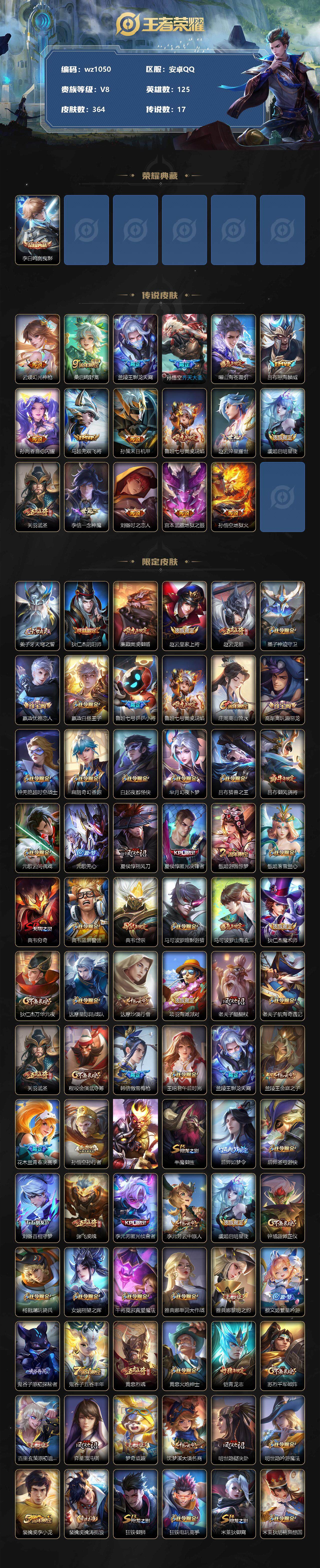 【游戏多多】【王者荣耀】【编号:3339734】【可二次实名】【wz1050】【商品标题】:安卓Q-V8-最强王者段位-125英雄-364皮肤-1典藏-0珍品无双-0无双-0珍品传说-17传说-120史诗 【荣耀典藏】:李白鸣剑曳影 【传说皮肤】:云缨幻光神枪,桑启鸣野蒿,兰陵王影龙天霄,孙悟空齐天大圣,曜山海苍雷引,吕布怒海麟威,孙尚香音你闪耀,马超无双飞将,孙策末日机甲,鲁班七号寅虎瑞焰,赵云淬星耀世,虞姬启明星使,关羽武圣,李信一念神魔,刘备时之恋人,宫本武藏地狱之眼,孙悟空地狱火 【限定皮肤】:姜子牙天穹之誓,狄仁杰阴阳师,廉颇寅虎御盾,赵云皇家上将,赵云龙胆,墨子神迹守卫,嬴政优雅恋人,嬴政白昼王子,鲁班七号乒乒小将,鲁班七号寅虎瑞焰,庄周高山流水,高渐离玩趣恶龙,钟无艳超时空战士,扁鹊奇幻香踪,白起夜都怪侠,芈月幻夜卜梦,吕布猎兽之王,吕布御风骁将,元歌云间偶戏,元歌无心,夏侯惇朔风刀,夏侯惇匿光决锋者,甄姬游园惊梦,甄姬落雪兰心,典韦穷奇,典韦蓝屏警告,典韦岱宗,马可波罗暗影游猎,马可波罗山海玄木吟,狄仁杰魔术师,狄仁杰万华元夜,达摩星际陆战队,达摩沙漠行僧,项羽海滩派对,老夫子醍醐杖,老夫子航海奇遇记,关羽武圣,程咬金演武夺筹,韩信傲雪梅枪,王昭君午后时光,兰陵王影龙天霄,兰陵王金庭之子,花木兰青春决赛季,孙悟空孙行者,孙悟空齐天大圣,牛魔御旌,后羿如梦令,后羿圣弓游侠,刘备百相守梦,张飞虎魄,李元芳匿光侦查者,李元芳云中旅人,虞姬启明星使,钟馗驱傩正仪,杨戬潮玩骑兵,女娲朔望之晖,干将莫邪真爱魔法,雅典娜单词大作战,雅典娜黎明之约,蔡文姬繁星吟游,鬼谷子原初探秘者,鬼谷子五谷丰年,黄忠烈魂,黄忠火炮绅士,铠青龙志,苏烈千军破阵,百里玄策原初追逐者,弈星混沌棋,梦奇顽趣,沈梦溪大漠名商,明世隐疑决卦,明世隐吟游魔法,裴擒虎李小龙,裴擒虎擒涛扼浪,狂铁御狮,狂铁电玩高手,米莱狄御霄,米莱狄胡桃异想国,瑶山海碧波行,云中君纤云弄巧,伽罗天狼溯光者,猪八戒西部大镖客,猪八戒猪悟能,上官婉儿梁祝,嫦娥拒霜思,嫦娥暖冬兔眠,曜山海苍雷引,西施玲珑珍味,蒙犽狂想玩偶喵,鲁班大师探海日志,镜匿光追影者,桑启海盐诗旅,暃星界游侠,戈娅驭风魔法,艾琳流音漫舞,司空震地狱燃心,阿古朵江河有灵,张良古海寻踪,蒙犽百解令,蒙恬荣光圣徽,高渐离燃音魔法,妲己灵卜魔法,鬼谷子天穹祈灯,伽罗琥珀纪元,姬小满妄想食味,沈梦溪龙舞盛年,鲁班七号蔬乡物语,李元芳蔬乡物语,刘邦剑破天穹,周瑜熔金海岸 【年限皮肤】:铠青龙志,鲁班七号寅虎瑞焰,廉颇寅虎御盾,吕布御风骁将,典韦岱宗,关羽武圣,黄忠烈魂,张飞虎魄,赵云龙胆,瑶山海碧波行,马可波罗山海玄木吟,曜山海苍雷引 【赛季限定】:夏侯惇朔风刀,典韦穷奇,狄仁杰万华元夜,达摩沙漠行僧,老夫子醍醐杖,程咬金演武夺筹,兰陵王金庭之子,张良古海寻踪,牛魔御旌,李元芳云中旅人,钟馗驱傩正仪,雅典娜黎明之约,鬼谷子原初探秘者,苏烈千军破阵,百里玄策原初追逐者,弈星混沌棋,梦奇顽趣,沈梦溪大漠名商,明世隐疑决卦,裴擒虎擒涛扼浪,狂铁御狮,米莱狄御霄,鲁班大师探海日志,桑启海盐诗旅,鬼谷子天穹祈灯,蒙恬荣光圣徽,刘邦剑破天穹,姜子牙天穹之誓 【战令限定】:墨子神迹守卫,嬴政白昼王子,钟无艳超时空战士,扁鹊奇幻香踪,白起夜都怪侠,芈月幻夜卜梦,吕布猎兽之王,元歌云间偶戏,甄姬落雪兰心,典韦蓝屏警告,马可波罗暗影游猎,达摩星际陆战队,老夫子航海奇遇记,王昭君午后时光,艾琳流音漫舞,后羿圣弓游侠,杨戬潮玩骑兵,女娲朔望之晖,干将莫邪真爱魔法,雅典娜单词大作战,黄忠火炮绅士,明世隐吟游魔法,狂铁电玩高手,米莱狄胡桃异想国,猪八戒西部大镖客,嫦娥暖冬兔眠,西施玲珑珍味,蒙犽狂想玩偶喵,司空震地狱燃心,暃星界游侠,戈娅驭风魔法,高渐离燃音魔法,妲己灵卜魔法,鲁班七号蔬乡物语,李元芳蔬乡物语 【史诗皮肤】:鲁班七号电玩小子,项羽苍穹之光,露娜紫霞仙子,阿轲暗夜猫娘,赵云皇家上将,赵云未来纪元,貂蝉圣诞恋歌,甄姬冰雪圆舞曲,狄仁杰魔术师,廉颇地狱岩魂,宫本武藏鬼剑武藏,孙尚香水果甜心,嬴政优雅恋人,嬴政暗夜贵公子,嬴政摇滚巨星,妲己魅力维加斯,妲己女仆咖啡,墨子龙骑士,墨子金属风暴,吕布圣诞狂欢,刘禅绅士熊喵,曹操幽灵船长,李白千年之狐,吕布末日机甲,张飞乱世虎臣,花木兰水晶猎龙者,刘邦德古拉伯爵,夏侯惇乘风破浪,小乔缤纷独角兽,兰陵王暗隐猎兽者,诸葛亮黄金分割率,甄姬游园惊梦,亚瑟心灵战警,雅典娜冰冠公主,安琪拉心灵骇客,花木兰青春决赛季,百里守约特工魅影,铠曙光守护者,蔡文姬舞动绿茵,刘禅天才门将,李元芳逐浪之夏,程咬金功夫厨神,白起星夜王子,阿轲节奏热浪,嬴政白昼王子,孙策猫狗日记,大乔猫狗日记,铠青龙志,典韦蓝屏警告,伽罗箭羽风息,狄仁杰鹰眼统帅,上官婉儿梁祝,蔡文姬繁星吟游,娜
