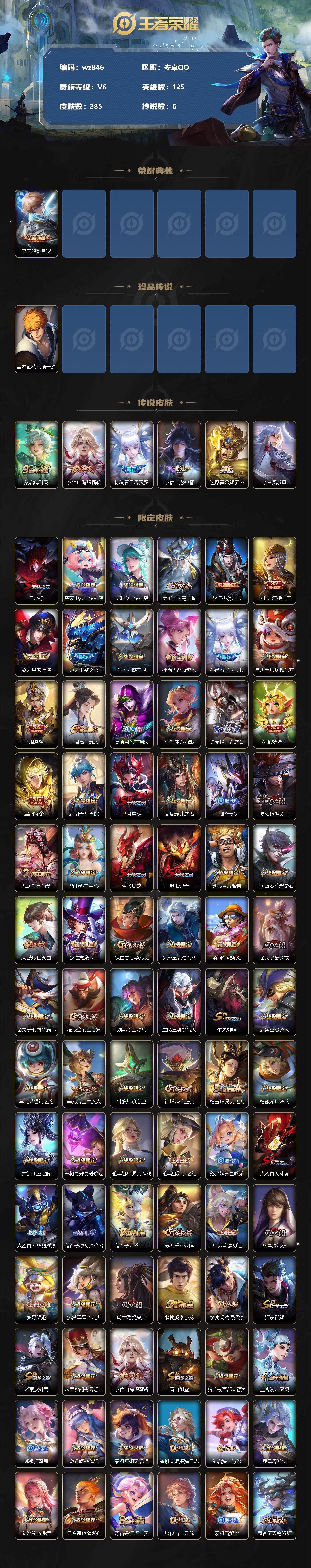 【游戏多多】【王者荣耀】【编号:3340204】【可二次实名】【wz846】【商品标题】:安卓Q-V6-最强王者段位-125英雄-285皮肤-1典藏-0珍品无双-0无双-1珍品传说-6传说-78史诗 【荣耀典藏】:李白鸣剑曳影 【珍品传说】:宫本武藏黑崎一护 【传说皮肤】:桑启鸣野蒿,李信山海炽霜斩,孙尚香异界灵契,李信一念神魔,达摩黄金狮子座,李白凤求凰 【限定皮肤】:白起狰,蔡文姬夏日便利店,虞姬夏日便利店,姜子牙天穹之誓,狄仁杰阴阳师,虞姬凯尔特女王,赵云皇家上将,赵云引擎之心,墨子神迹守卫,孙尚香蔷薇恋人,孙尚香异界灵契,鲁班七号狮舞东方,庄周蜃楼王,庄周高山流水,高渐离死亡摇滚,阿轲迷踪丽影,钟无艳王者之锤,孙膑妖精王,扁鹊炼金王,扁鹊奇幻香踪,芈月重明,周瑜赤莲之焰,元歌无心,夏侯惇朔风刀,甄姬游园惊梦,甄姬落雪兰心,曹操烛龙,典韦穷奇,典韦蓝屏警告,马可波罗暗影游猎,马可波罗山海玄木吟,狄仁杰魔术师,狄仁杰万华元夜,达摩星际陆战队,项羽海滩派对,老夫子醍醐杖,老夫子航海奇遇记,程咬金演武夺筹,刘邦夺宝奇兵,兰陵王驯魔猎人,牛魔御旌,后羿圣弓游侠,李元芳银河之约,李元芳云中旅人,钟馗神迹守卫,钟馗驱傩正仪,杨玉环遇见飞天,杨戬潮玩骑兵,女娲朔望之晖,干将莫邪真爱魔法,雅典娜单词大作战,雅典娜黎明之约,蔡文姬繁星吟游,太乙真人饕餮,太乙真人华丽摇滚,鬼谷子原初探秘者,鬼谷子五谷丰年,苏烈千军破阵,百里玄策原初追逐者,弈星混沌棋,梦奇顽趣,沈梦溪星空之诺,明世隐疑决卦,裴擒虎李小龙,裴擒虎擒涛扼浪,狂铁御狮,米莱狄御霄,米莱狄胡桃异想国,李信山海炽霜斩,盾山御銮,猪八戒西部大镖客,上官婉儿梁祝,嫦娥拒霜思,嫦娥暖冬兔眠,蒙犽狂想玩偶喵,鲁班大师探海日志,桑启海盐诗旅,暃星界游侠,艾琳流音漫舞,司空震地狱燃心,阿古朵江河有灵,张良古海寻踪,蒙犽百解令,鬼谷子天穹祈灯,沈梦溪龙舞盛年,刘邦剑破天穹,程咬金群星魔术团,刘备异域游侠 【年限皮肤】:李白凤求凰,马可波罗山海玄木吟,李信山海炽霜斩 【赛季限定】:庄周蜃楼王,孙膑妖精王,扁鹊炼金王,白起狰,芈月重明,夏侯惇朔风刀,曹操烛龙,典韦穷奇,狄仁杰万华元夜,老夫子醍醐杖,程咬金演武夺筹,张良古海寻踪,牛魔御旌,李元芳云中旅人,虞姬凯尔特女王,钟馗驱傩正仪,雅典娜黎明之约,太乙真人饕餮,鬼谷子原初探秘者,苏烈千军破阵,百里玄策原初追逐者,弈星混沌棋,梦奇顽趣,明世隐疑决卦,裴擒虎擒涛扼浪,狂铁御狮,米莱狄御霄,盾山御銮,鲁班大师探海日志,桑启海盐诗旅,鬼谷子天穹祈灯,刘邦剑破天穹,姜子牙天穹之誓 【战令限定】:墨子神迹守卫,蔡文姬夏日便利店,虞姬夏日便利店,鲁班七号狮舞东方,阿轲迷踪丽影,扁鹊奇幻香踪,周瑜赤莲之焰,甄姬落雪兰心,典韦蓝屏警告,马可波罗暗影游猎,达摩星际陆战队,老夫子航海奇遇记,刘邦夺宝奇兵,兰陵王驯魔猎人,艾琳流音漫舞,后羿圣弓游侠,李元芳银河之约,钟馗神迹守卫,杨戬潮玩骑兵,女娲朔望之晖,干将莫邪真爱魔法,雅典娜单词大作战,沈梦溪星空之诺,米莱狄胡桃异想国,猪八戒西部大镖客,嫦娥暖冬兔眠,蒙犽狂想玩偶喵,司空震地狱燃心,暃星界游侠 【史诗皮肤】:鲁班七号电玩小子,项羽苍穹之光,阿轲暗夜猫娘,钟无艳王者之锤,赵云皇家上将,赵云未来纪元,貂蝉圣诞恋歌,狄仁杰魔术师,宫本武藏鬼剑武藏,孙尚香蔷薇恋人,孙尚香水果甜心,嬴政暗夜贵公子,嬴政摇滚巨星,妲己魅力维加斯,妲己女仆咖啡,墨子金属风暴,吕布圣诞狂欢,刘禅绅士熊喵,曹操幽灵船长,李白千年之狐,赵云引擎之心,刘邦德古拉伯爵,夏侯惇乘风破浪,小乔缤纷独角兽,兰陵王暗隐猎兽者,诸葛亮黄金分割率,甄姬游园惊梦,亚瑟心灵战警,雅典娜冰冠公主,安琪拉心灵骇客,百里守约特工魅影,铠曙光守护者,蔡文姬舞动绿茵,刘禅天才门将,李元芳逐浪之夏,程咬金功夫厨神,白起星夜王子,阿轲节奏热浪,杨玉环遇见飞天,孙策猫狗日记,典韦蓝屏警告,伽罗箭羽风息,鲁班七号狮舞东方,狄仁杰鹰眼统帅,兰陵王驯魔猎人,上官婉儿梁祝,蔡文姬繁星吟游,李元芳银河之约,阿轲迷踪丽影,橘右京修罗,马可波罗暗影游猎,蒙犽狂想玩偶喵,百里玄策原初追逐者,裴擒虎李小龙,米莱狄胡桃异想国,老夫子航海奇遇记,干将莫邪真爱魔法,钟馗乐园奇幻夜,庄周高山流水,嫦娥拒霜思,雅典娜黎明之约,鬼谷子五谷丰年,元歌无心,梦奇顽趣,暃星界游侠,马可波罗山海玄木吟,扁鹊奇幻香踪,司空震地狱燃心,阿古朵江河有灵,蒙犽百解令,蔡文姬夏日便利店,弈星万物之道,阿轲化蝶舞,刘禅鸭鸭历险记,狂铁龙之律动,后羿石田雨龙,黄忠百相守梦,西施织梦人 【其他皮肤】:项羽海滩派对,韩信教廷特使,韩信街头霸王,露娜哥特玫瑰,阿轲致命风华,阿轲爱心护理,达摩大发明家,赵云白执事,赵云忍炎影,芈月红桃皇后,程咬金星际陆战队,白起白色死神,牛魔西部大镖客,扁鹊化身博士,扁鹊