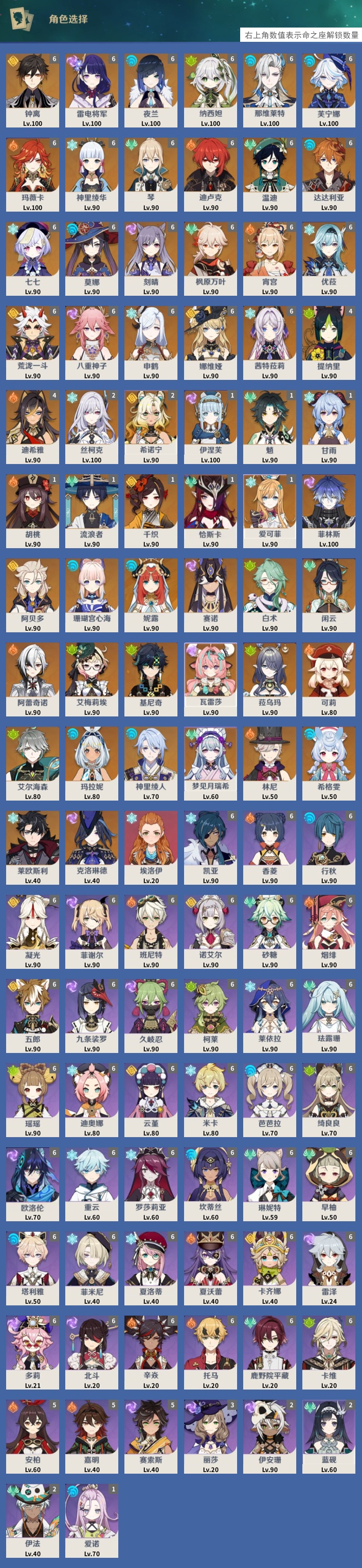 五星角色:胡桃,甘雨,阿贝多,刻晴,莫娜,七七,迪卢克,琴,温迪,可莉,钟离,达达利亚,优菈,荒泷一斗,八重神子,雷电将军,克洛琳德,阿蕾奇诺,千织,闲云,娜维娅,芙宁娜,莱欧斯利,那维莱特,林尼,纳西妲,赛诺,白术,提纳里,流浪者,迪希雅,妮露,枫原万叶,艾尔海森,神里绫华,宵宫,神里绫人,珊瑚宫心海,申鹤,夜兰