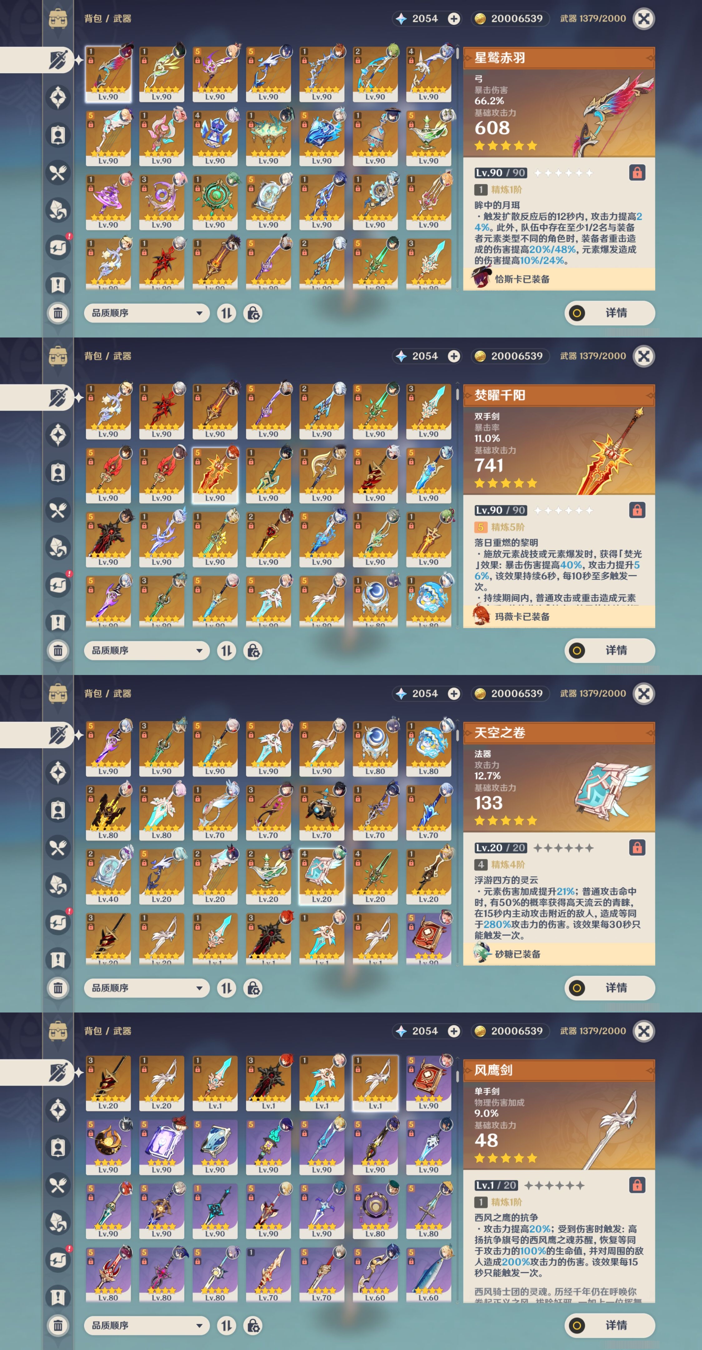 五星武器:阿莫斯之弓,天空之翼,天空之卷,天空之脊,天空之傲,天空之刃,四风原典,和璞鸢,狼的末路,风鹰剑,无工之剑,贯虹之槊,护摩之杖,赦罪,赤月之形,有乐御簾切,鹤鸣余音,裁断,静水流涌之辉,万世流涌大典,最初的大魔术,赤沙之杖,碧落之珑,猎人之径,裁叶萃光,波乱月白经津,千夜浮梦,图莱杜拉的回忆,圣显之钥,神乐之真意,风鹰剑,松籁响起之时,雾切之回光,飞雷之弦振,薙草之稻光,不灭月华,冬极白星,苍古自由之誓,息灾,赤角石溃杵,若水