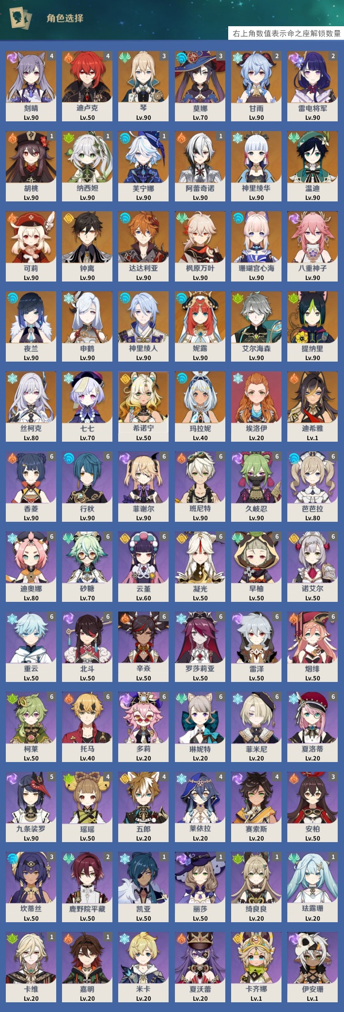 五星角色:胡桃,甘雨,刻晴,莫娜,七七,迪卢克,琴,温迪,可莉,钟离,达达利亚,八重神子,雷电将军,阿蕾奇诺,芙宁娜,纳西妲,提纳里,迪希雅,妮露,枫原万叶,艾尔海森,神里绫华,神里绫人,珊瑚宫心海,申鹤,夜兰