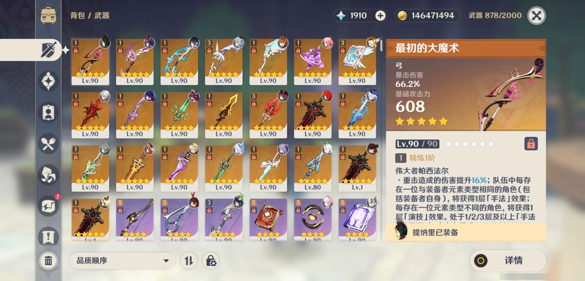 五星武器:阿莫斯之弓,天空之翼,天空之卷,和璞鸢,狼的末路,风鹰剑,贯虹之槊,护摩之杖,赤月之形,静水流涌之辉,最初的大魔术,裁叶萃光,圣显之钥,神乐之真意,风鹰剑,雾切之回光,飞雷之弦振,薙草之稻光,息灾