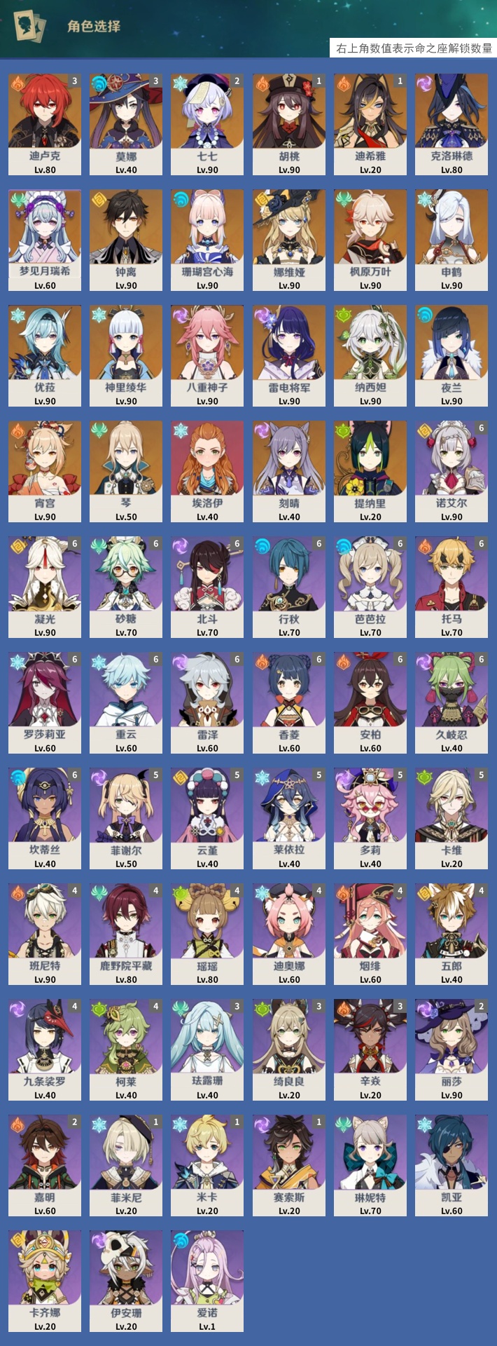 五星角色:胡桃,刻晴,莫娜,七七,迪卢克,琴,钟离,优菈,八重神子,雷电将军,克洛琳德,娜维娅,纳西妲,提纳里,迪希雅,枫原万叶,神里绫华,宵宫,珊瑚宫心海,申鹤,夜兰