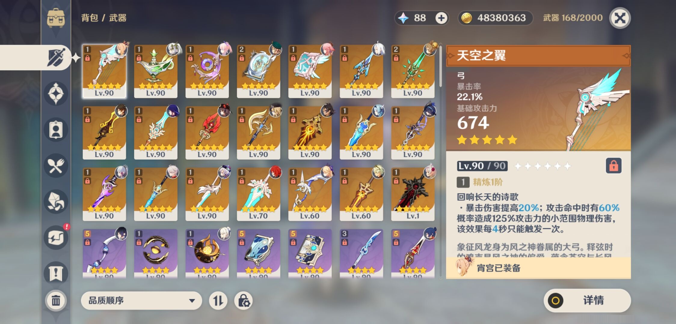 五星武器:阿莫斯之弓,天空之翼,天空之卷,天空之脊,天空之傲,四风原典,和璞鸢,狼的末路,风鹰剑,贯虹之槊,护摩之杖,赦罪,裁断,千夜浮梦,苇海信标,圣显之钥,风鹰剑,松籁响起之时,雾切之回光,不灭月华,苍古自由之誓,息灾