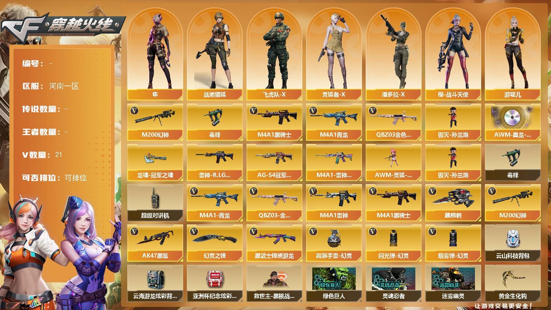 【游戏多多】 【可包人脸】ljh AK032599 河南一区 21V 0王者 0炫金【热门武器】:毒蜂,M4A1-青龙,M200-幻神,M4A1-黑骑士,QBZ03-金色蔷薇,毁灭-孙三炮【音效卡】:AWM-昌龙-怀旧【皮肤】:黑骑士-AG-S4冠军典藏,雷神-R.LGD-CFPLS18冠军,龙啸-冠军之啸,M4A1-雷神-巅峰荣耀【角色】:隼,战地猎狐,飞虎队-X,灵狐者-X,潘多拉-X,樱-战斗天使,游珑儿【人偶武器】:AWM-灵狐-15周年嘉年华,毁灭-孙三炮【暴走生化】:超级对讲机,毒蜂【英雄级武器】:AK47-黑鲨,幻灵之锋,M4A1-雷神,M4A1-黑骑士,M200-幻神,麒麟刺,M4A1-青龙,黑武士-锦绣游龙,QBZ03-金色蔷薇,高爆手雷-幻灵,闪光弹-幻灵,烟雾弹-幻灵【道具】:云山科技背包,云海游龙炫彩背包,亚洲杯纪念炫彩背包,救世主-黑桃战神,黄金生化钩,绿色巨人,灵魂忍者,迷雾幽灵,夺命之镰,防化服,金色流光-枪王排位,枪王排位28赛季金色流光,枪王排位29赛季金色流光,防弹头盔,防弹衣,C4工具钳【特殊枪械】:1黑骑士【更多炫彩背包/光效/名片/武器具体看图!截图或标题展示段位不代表实际段位,赛季更新等不可抗拒因素发生变化、时限道具不保证所剩时间、标题未写送点卷默认不送】
