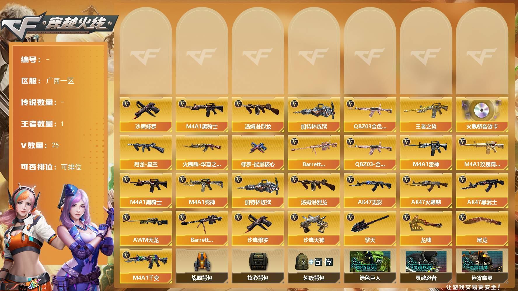 【游戏多多】 【可包人脸】广西一区 25V 1王者 0炫金【热门武器】:加特林-炼狱,M4A1-黑骑士,QBZ03-金色蔷薇,沙鹰-修罗,汤姆逊-烈龙【王者炫金武器】:王者之势【音效卡】:AK47-火麒麟【皮肤】:火麒麟-华夏之心,烈龙-星空,修罗-能量核心【英雄级武器】:AK47-火麒麟,AK47-无影,AK47-黑武士,AWM-天龙,Barrett-毁灭,加特林-炼狱,龙啸,M4A1-千变,M4A1-雷神,M4A1-黑骑士,M4A1-死神,M4A1-玫瑰精灵,擎天,沙鹰-修罗,沙鹰-天神,汤姆逊-烈龙【道具】:战舰背包,炫彩背包,超级背包,绿色巨人,灵魂忍者,迷雾幽灵,夺命之镰,防化服,防弹头盔,防弹衣,C4工具钳,手雷包【特殊枪械】:1炼狱,1黑骑士,1烈龙【更多炫彩背包/光效/名片/武器具体看图!截图或标题展示段位不代表实际段位,赛季更新等不可抗拒因素发生变化、时限道具不保证所剩时间、标题未写送点卷默认不送】