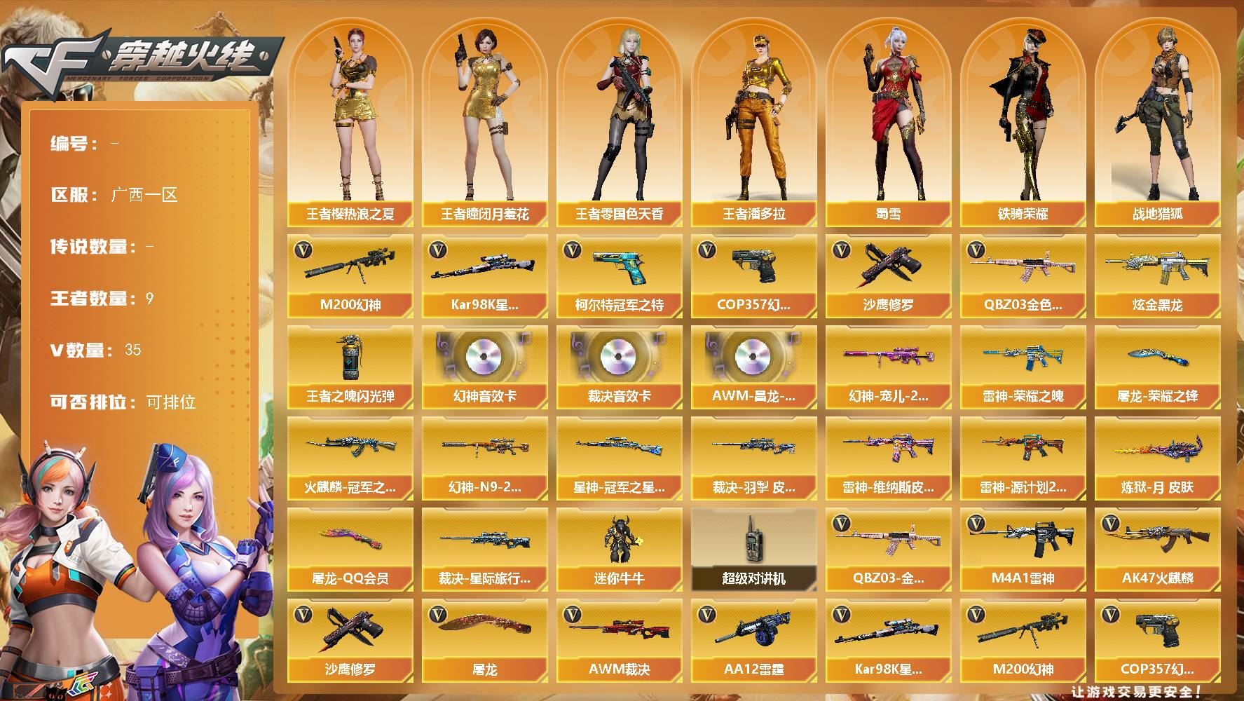 【游戏多多】 【可包人脸】hmcAK032590广西一区 35V 9王者 1炫金【热门武器】:COP 357-幻灵,柯尔特-冠军之特,Kar98K-星神,M200-幻神,QBZ03-金色蔷薇,沙鹰-修罗【王者炫金武器】:炫金黑龙,王者之魄闪光弹【音效卡】:AWM-裁决,M200-幻神,AWM-昌龙-怀旧【皮肤】:幻神-宠儿-2021MVP,火麒麟-冠军之心,Kar98K-星神-冠军之星,雷神-荣耀之魄,M200-幻神-N9-2022MVP,屠龙-荣耀之锋,裁决-羽掣,裁决-星际旅行,雷神-维纳斯,雷神-源计划2.0专属,炼狱-月,屠龙-QQ会员【角色】:蜀雪,铁骑荣耀,王者-瞳-闭月羞花,王者樱-热浪之夏,王者-零-国色天香,王者潘多拉,战地猎狐,奇洋探员,修道士,云海玲珑,暗夜-X,北极狐-X,电竞少女,芳心审判者,飞虎队-X,风暴女【人偶武器】:迷你牛牛【暴走生化】:超级对讲机【英雄级武器】:AK47-火麒麟,AWM-裁决,AA-12-雷霆,COP 357-幻灵,Kar98K-星神,柯尔特-冠军之特,M4A1-雷神,M200-幻神,沙鹰-修罗,屠龙,黑武士-锦绣游龙,超新星-热带奇洋,QBZ03-金色蔷薇,炼狱-悦蓝-觉醒版,烈龙-云海游龙,擎天-云海游龙【道具】:CFS限定背包,云海游龙炫彩背包,亚洲杯纪念炫彩背包,奇洋探员-海龟背包,战舰背包,炫彩背包,热带奇洋炫彩背包,女皇终结者-魔龙之吻,救世主-黑桃战神,绿色巨人,灵魂忍者,变异宝贝,迷雾幽灵,夺命之镰,防化服,金色流光-枪王排位【更多炫彩背包/光效/名片/武器具体看图!截图或标题展示段位不代表实际段位,赛季更新等不可抗拒因素发生变化、时限道具不保证所剩时间、标题未写送点卷默认不送】