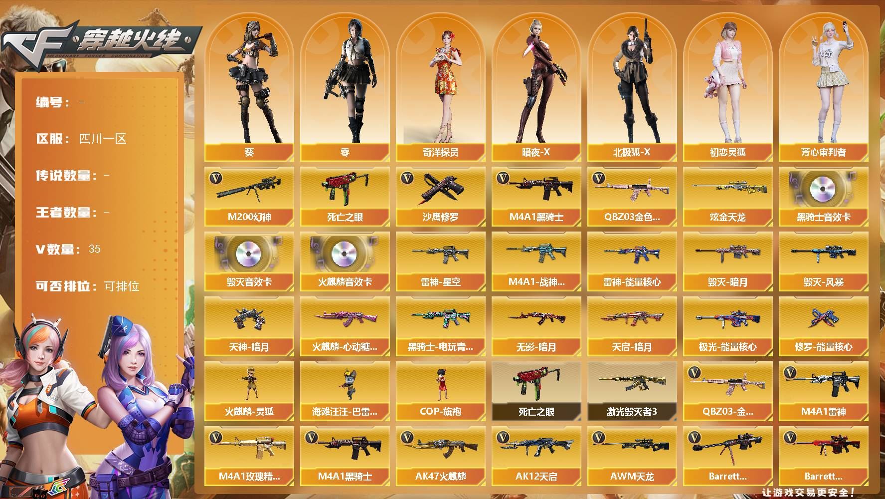 【游戏多多】 【可包人脸】ljh AK032710 四川一区 35V 0王者 1炫金【热门武器】:M200-幻神,M4A1-黑骑士,QBZ03-金色蔷薇,死亡之眼,沙鹰-修罗【王者炫金武器】:炫金天龙【音效卡】:AK47-火麒麟,M4A1-黑骑士,Barrett-毁灭【皮肤】:火麒麟-心动糖果,毁灭-暗月,毁灭-风暴,雷神-能量核心,雷神-星空,M4A1-战神赵云,天神-暗月,黑骑士-电玩青兔,无影-暗月,天启-暗月,极光-能量核心,修罗-能量核心【角色】:葵,零,奇洋探员,暗夜-X,北极狐-X,初恋灵狐,芳心审判者,嘉年华灵狐,斯沃特-X,兔囡囡,影武者-X,游珑儿【人偶武器】:COP-旗袍,火麒麟-灵狐,海滩汪汪-巴雷特【暴走生化】:死亡之眼【挑战大师】:激光毁灭者III【英雄级武器】:AK47-火麒麟,AK12-天启,AWM-天龙,AWM-裁决,Barrett-毁灭,Barrett-极光,龙啸,M4A1-雷神,M4A1-黑骑士,M4A1-武圣,M4A1-玫瑰精灵,M4A1-猎神,M200-幻神,擎天,麒麟刺,沙鹰-修罗【道具】:奇洋探员-海龟背包,战舰背包,炫彩背包,超级背包,夺命之镰,防化服,金色流光-枪王排位,枪王排位28赛季金色流光,斯沃特表情,循环实验表情,防弹头盔,防弹衣,C4工具钳,手雷包【特殊枪械】:1黑骑士【更多炫彩背包/光效/名片/武器具体看图!截图或标题展示段位不代表实际段位,赛季更新等不可抗拒因素发生变化、时限道具不保证所剩时间、标题未写送点卷默认不送】