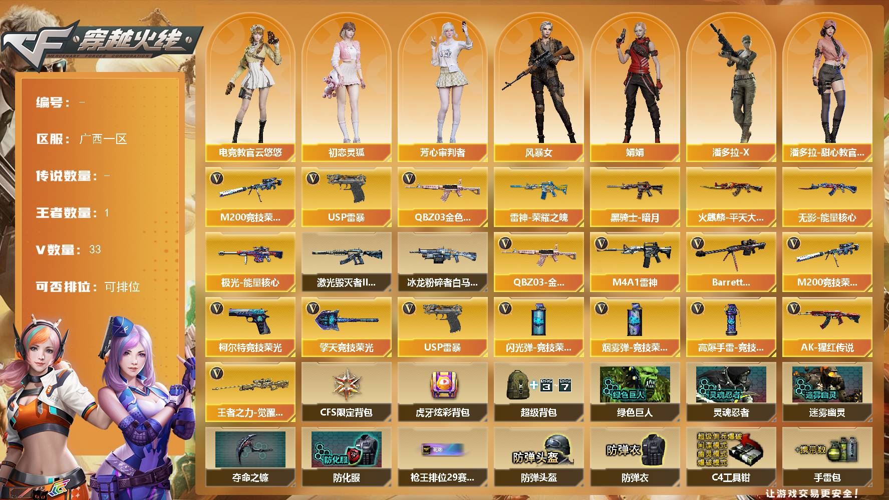 【游戏多多】 【可二次实名】ljh AK032701 广西一区 33V 1王者 0炫金【热门武器】:M200-竞技荣光,QBZ03-金色蔷薇,USP-雷暴【皮肤】:火麒麟-平天大圣,黑骑士-暗月,雷神-荣耀之魄,无影-能量核心,极光-能量核心【角色】:电竞教官-云悠悠,初恋灵狐,芳心审判者,风暴女,娟娟,潘多拉-X,潘多拉-甜心教官,兔囡囡【挑战大师】:冰龙粉碎者-白马银枪,激光毁灭者III-白马银枪【英雄级武器】:Barrett-毁灭,柯尔特-竞技荣光,M4A1-雷神,M200-竞技荣光,擎天-竞技荣光,USP-雷暴,QBZ03-金色蔷薇,AK-47-猩红传说,王者之力-觉醒版,高爆手雷-竞技荣光,闪光弹-竞技荣光,烟雾弹-竞技荣光【道具】:CFS限定背包,虎牙炫彩背包,超级背包,绿色巨人,灵魂忍者,迷雾幽灵,夺命之镰,防化服,枪王排位28赛季金色流光,枪王排位29赛季金色流光,EP战队名片,EP战队喷图,防弹头盔,防弹衣,C4工具钳,手雷包【更多炫彩背包/光效/名片/武器具体看图!截图或标题展示段位不代表实际段位,赛季更新等不可抗拒因素发生变化、时限道具不保证所剩时间、标题未写送点卷默认不送】
