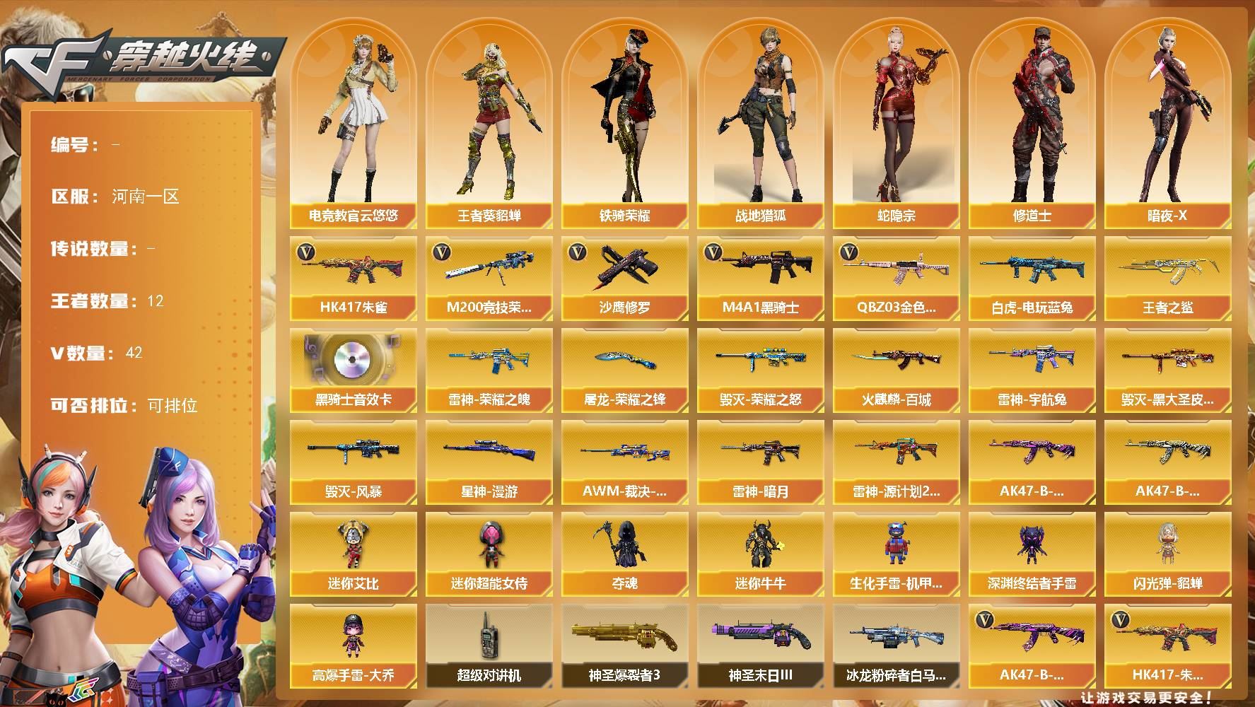 【游戏多多】 【可包人脸】hmcAK032720河南一区 42V 12王者 0炫金【热门武器】:HK417-朱雀,M200-竞技荣光,M4A1-黑骑士,QBZ03-金色蔷薇,沙鹰-修罗,白虎-电玩蓝兔【王者炫金武器】:王者之鲨【音效卡】:M4A1-黑骑士【皮肤】:毁灭-黑大圣,火麒麟-百城,毁灭-荣耀之怒,毁灭-风暴,雷神-荣耀之魄,雷神-宇航兔,屠龙-荣耀之锋,星神-漫游,AWM-裁决-百城联赛天津,雷神-暗月,雷神-源计划2.0专属,AK47-B-常胜将军-曹操,AK47-B-常胜将军-刘备【角色】:电竞教官-云悠悠,铁骑荣耀,王者-葵-貂蝉,战地猎狐,蛇隐宗,修道士,暗夜-X,北极狐-X,初恋灵狐,风暴女,虎妞,嘉年华灵狐,娟娟,灵狐者-X,灵狐者-七夕宝贝,龙儿-小淘气【人偶武器】:夺魂,高爆手雷-大乔,迷你牛牛,迷你艾比,迷你超能女侍,生化手雷-机甲核心,深渊终结者手雷,闪光弹-貂蝉【暴走生化】:超级对讲机【挑战大师】:冰龙粉碎者-白马银枪,神圣爆裂者III,神圣爆裂者-末日III【英雄级武器】:Barrett-毁灭,幻灵之锋,柯尔特-竞技荣光,M4A1-雷神,M4A1-黑骑士,M200-竞技荣光,擎天-竞技荣光,沙鹰-修罗,沙鹰-天神,屠龙,HK417-朱雀,无影-神兵利器,QBZ03-金色蔷薇,AK47-B-战神,AK47-B-常胜将军,白虎-电玩蓝兔【道具】:BS战队炫彩背包,EP战队炫彩背包,全能枪王背包,炫彩背包,背包-洛丽塔,虎牙炫彩背包,超级背包,迷你冰龙背包,女皇终结者-魔龙之吻,救世主-黑桃战神,绿色巨人,灵魂忍者,迷雾幽灵,生化弹匣,夺命之镰,防化服【特殊枪械】:1黑骑士【更多炫彩背包/光效/名片/武器具体看图!截图或标题展示段位不代表实际段位,赛季更新等不可抗拒因素发生变化、时限道具不保证所剩时间、标题未写送点卷默认不送】