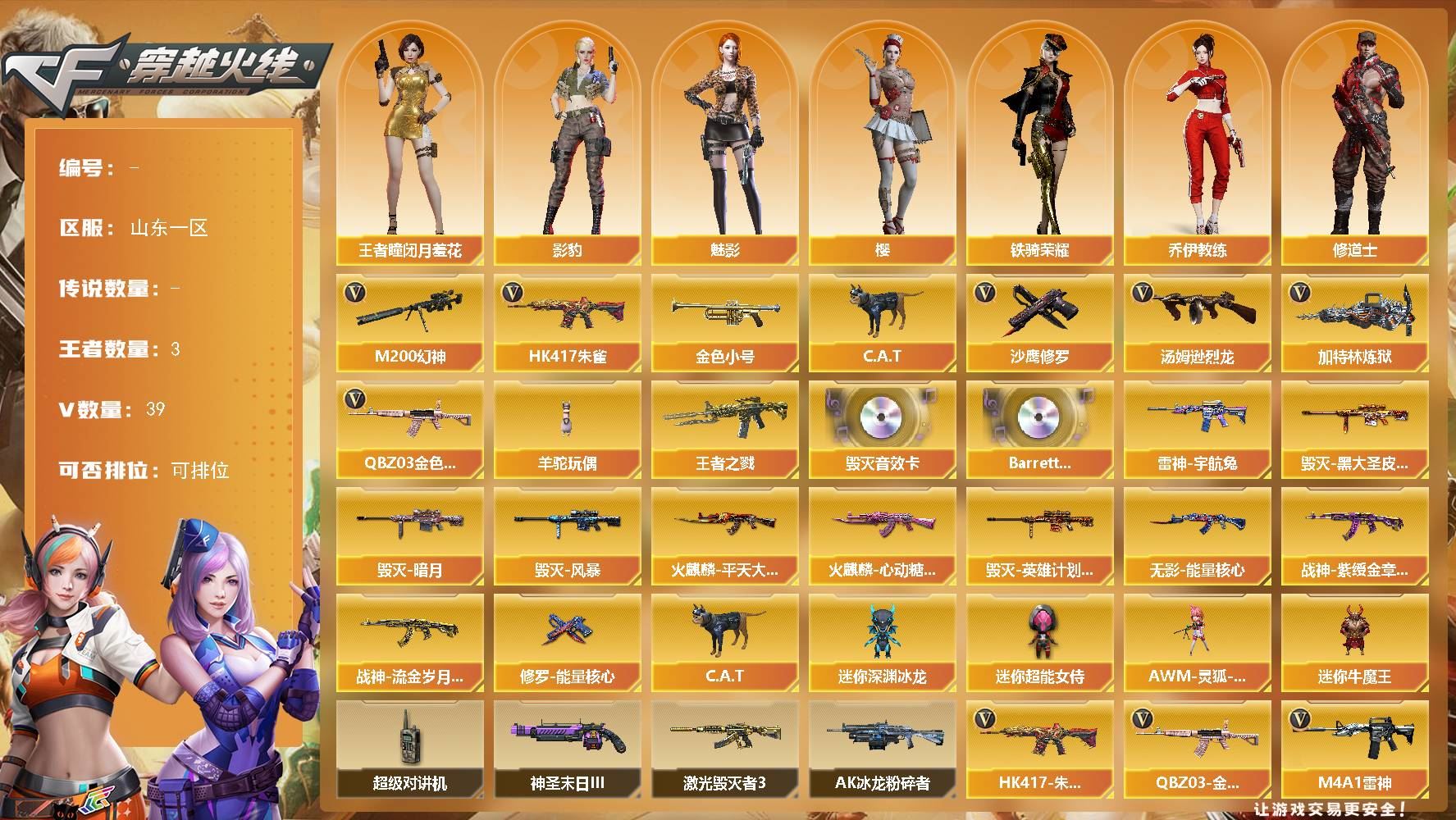 【游戏多多】 【可包人脸】ljh AK032773 山东一区 39V 3王者 0炫金【热门武器】:C.A.T,HK417-朱雀,金色小号,加特林-炼狱,M200-幻神,QBZ03-金色蔷薇,沙鹰-修罗,汤姆逊-烈龙,羊驼玩偶【王者炫金武器】:王者之戮【音效卡】:Barrett-毁灭,Barrett-碧霄极光【皮肤】:毁灭-黑大圣,火麒麟-平天大圣,火麒麟-心动糖果,毁灭-暗月,毁灭-风暴,雷神-宇航兔,毁灭-英雄计划,无影-能量核心,战神-紫绶金章,战神-流金岁月,修罗-能量核心【角色】:魅影,铁骑荣耀,王者-瞳-闭月羞花,樱,影豹,乔伊教练,修道士,暗夜-X,初恋灵狐,风暴女,嘉年华灵狐,灵狐者-X,灵狐者-黄金海岸,曼陀罗-X,潘多拉-X,潘多拉-甜心教官【人偶武器】:AWM-灵狐-15周年嘉年华,C.A.T,迷你深渊冰龙,迷你牛魔王,迷你超能女侍【暴走生化】:超级对讲机【挑战大师】:AK47-冰龙粉碎者,激光毁灭者III,神圣爆裂者-末日III【英雄级武器】:AK47-火麒麟,AK47-无影,AK12-天启,AK47-黑鲨,AWM-天龙,Barrett-毁灭,加特林-炼狱,M4A1-千变,M4A1-雷神,M4A1-龙血,M200-幻神,沙鹰-修罗,沙鹰-天神,汤姆逊-烈龙,HK417-朱雀,无影-神兵利器【道具】:AG战队炫彩背包,BS战队炫彩背包,云山科技背包,女皇终结者-背包,炫彩背包,裂空之翼背包-金色,超级背包,女皇终结者-魔龙之吻,绿色巨人,灵魂忍者,迷雾幽灵,生化弹匣,夺命之镰,防化服,金色流光-枪王排位,星辰流光-枪王排位【特殊枪械】:1炼狱,1烈龙【更多炫彩背包/光效/名片/武器具体看图!截图或标题展示段位不代表实际段位,赛季更新等不可抗拒因素发生变化、时限道具不保证所剩时间、标题未写送点卷默认不送】