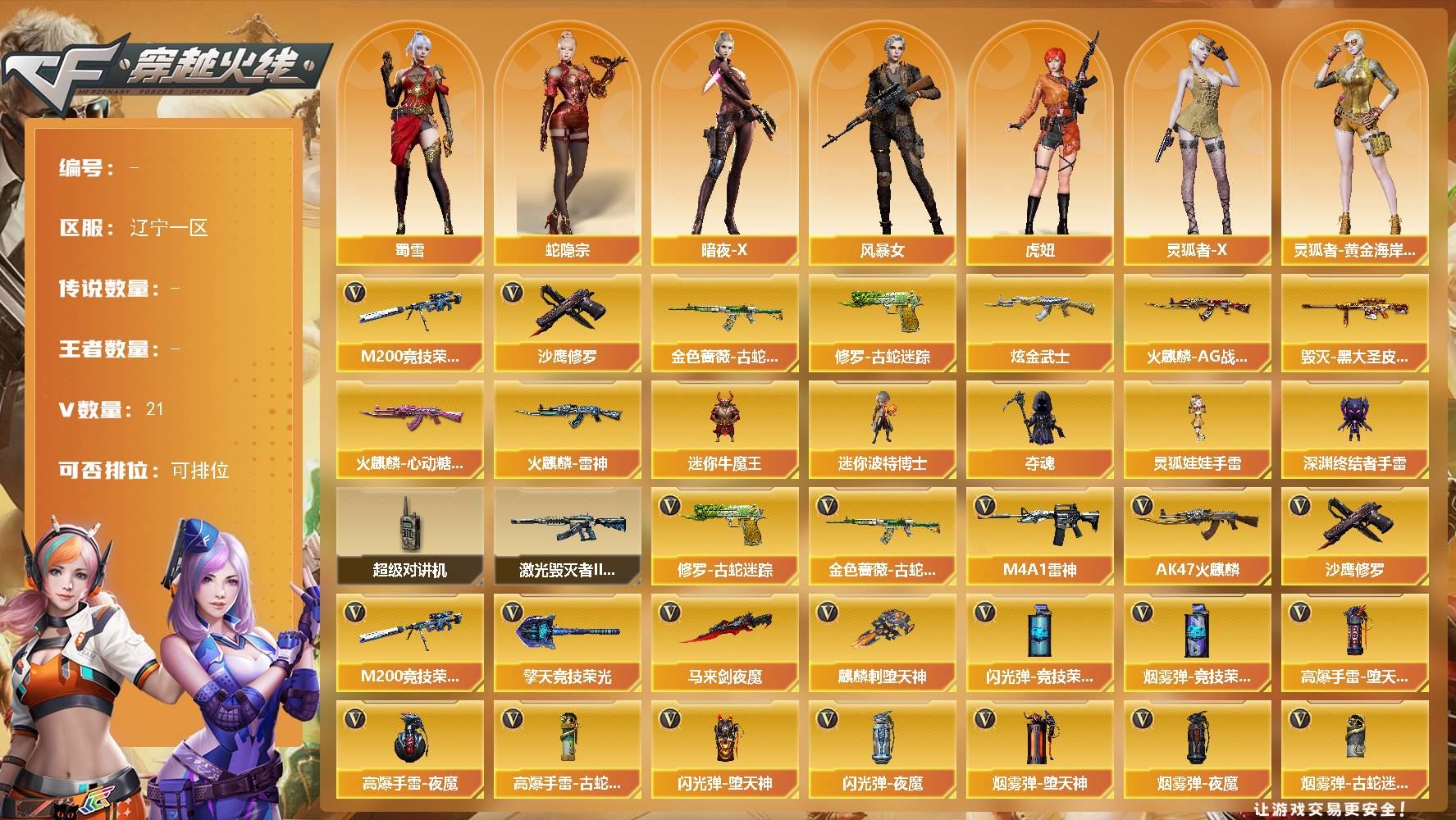 【游戏多多】 【可包人脸】ljh AK032821 辽宁一区 21V 0王者 1炫金【热门武器】:M200-竞技荣光,沙鹰-修罗,金色蔷薇-古蛇迷踪,修罗-古蛇迷踪【王者炫金武器】:炫金武士【皮肤】:毁灭-黑大圣,火麒麟-AG战队,火麒麟-心动糖果,火麒麟-雷神【角色】:蜀雪,蛇隐宗,暗夜-X,风暴女,虎妞,灵狐者-X,灵狐者-黄金海岸,灵狐者-七夕宝贝,潘多拉-X,潘多拉-甜心教官,蛇姬,斯沃特-X,新娜塔莎,樱-战斗天使【人偶武器】:夺魂,灵狐娃娃手雷,迷你牛魔王,迷你波特博士,深渊终结者手雷【暴走生化】:超级对讲机【挑战大师】:激光毁灭者III-白马银枪【英雄级武器】:AK47-火麒麟,M4A1-雷神,M200-竞技荣光,马来剑-夜魔,麒麟刺-堕天神,擎天-竞技荣光,沙鹰-修罗,金色蔷薇-古蛇迷踪,修罗-古蛇迷踪,高爆手雷-堕天神,高爆手雷-夜魔,高爆手雷-古蛇迷踪,闪光弹-堕天神,闪光弹-夜魔,闪光弹-竞技荣光,烟雾弹-堕天神【道具】:CFS限定背包,古蛇迷踪炫彩背包,背包-洛丽塔,超级背包,绿色巨人,灵魂忍者,迷雾幽灵,夺命之镰,防化服,星辰流光-枪王排位,古蛇迷踪打击特效,蛇隐宗表情,防弹头盔,防弹衣,C4工具钳,手雷包【更多炫彩背包/光效/名片/武器具体看图!截图或标题展示段位不代表实际段位,赛季更新等不可抗拒因素发生变化、时限道具不保证所剩时间、标题未写送点卷默认不送】