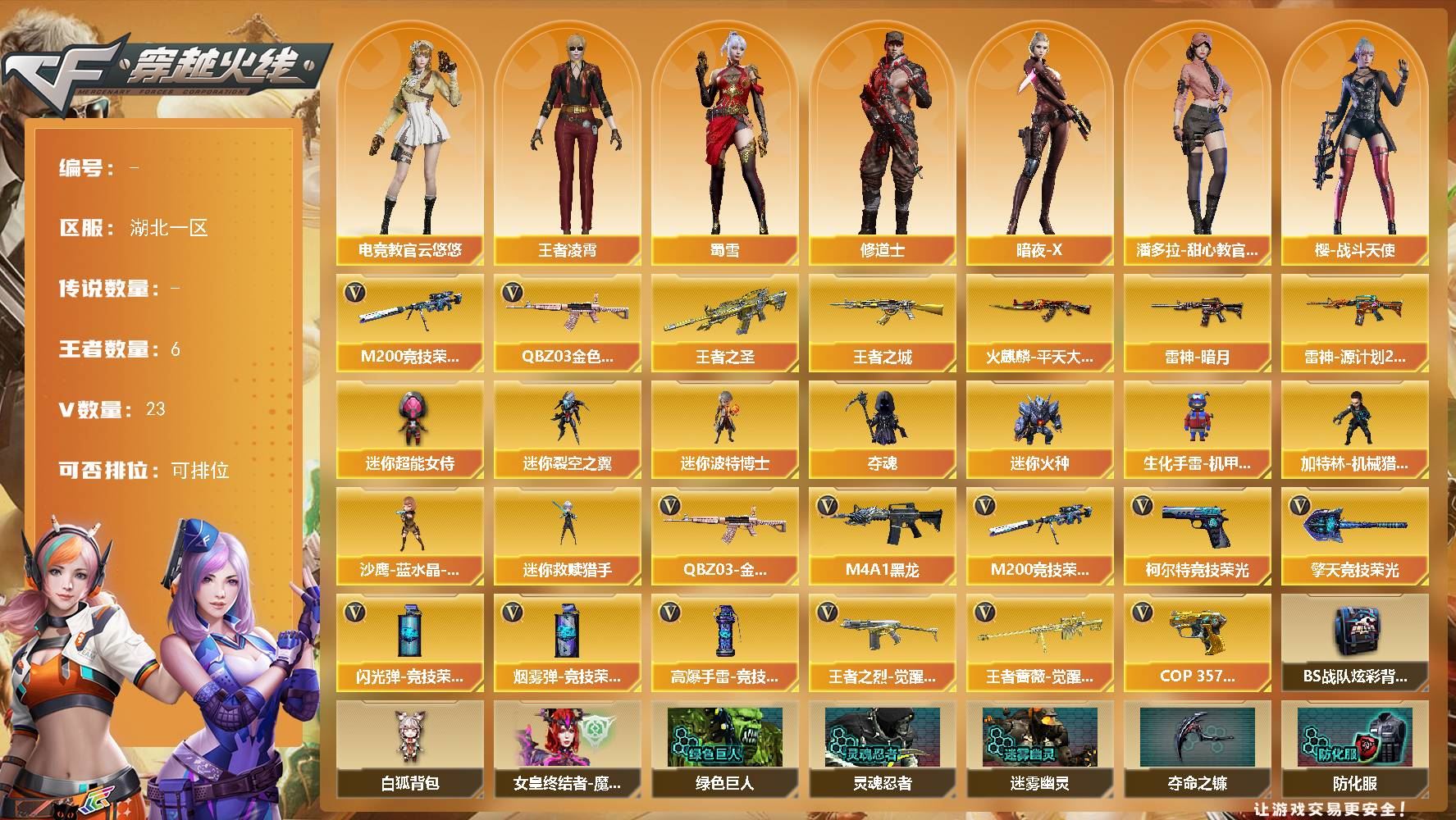 【游戏多多】 【可二次实名】ljh AK032828 湖北一区 23V 6王者 0炫金【热门武器】:M200-竞技荣光,QBZ03-金色蔷薇【王者炫金武器】:王者之圣,王者之城【皮肤】:火麒麟-平天大圣,雷神-暗月,雷神-源计划2.0专属【角色】:电竞教官-云悠悠,蜀雪,王者凌霄,修道士,暗夜-X,潘多拉-甜心教官,樱-战斗天使【人偶武器】:夺魂,迷你裂空之翼,迷你波特博士,迷你火种,迷你超能女侍,生化手雷-机甲核心,迷你救赎猎手,加特林-机械猎手,沙鹰-蓝水晶-曼陀罗【英雄级武器】:柯尔特-竞技荣光,M4A1-黑龙,M200-竞技荣光,擎天-竞技荣光,QBZ03-金色蔷薇,王者之烈-觉醒版,王者蔷薇-觉醒版,COP 357-雷霆王者-觉醒版,高爆手雷-竞技荣光,闪光弹-竞技荣光,烟雾弹-竞技荣光【道具】:BS战队炫彩背包,白狐背包,女皇终结者-魔龙之吻,绿色巨人,灵魂忍者,迷雾幽灵,夺命之镰,防化服,流光-鎏金之域,枪王排位29赛季金色流光,防弹头盔,防弹衣,C4工具钳,手雷包【更多炫彩背包/光效/名片/武器具体看图!截图或标题展示段位不代表实际段位,赛季更新等不可抗拒因素发生变化、时限道具不保证所剩时间、标题未写送点卷默认不送】